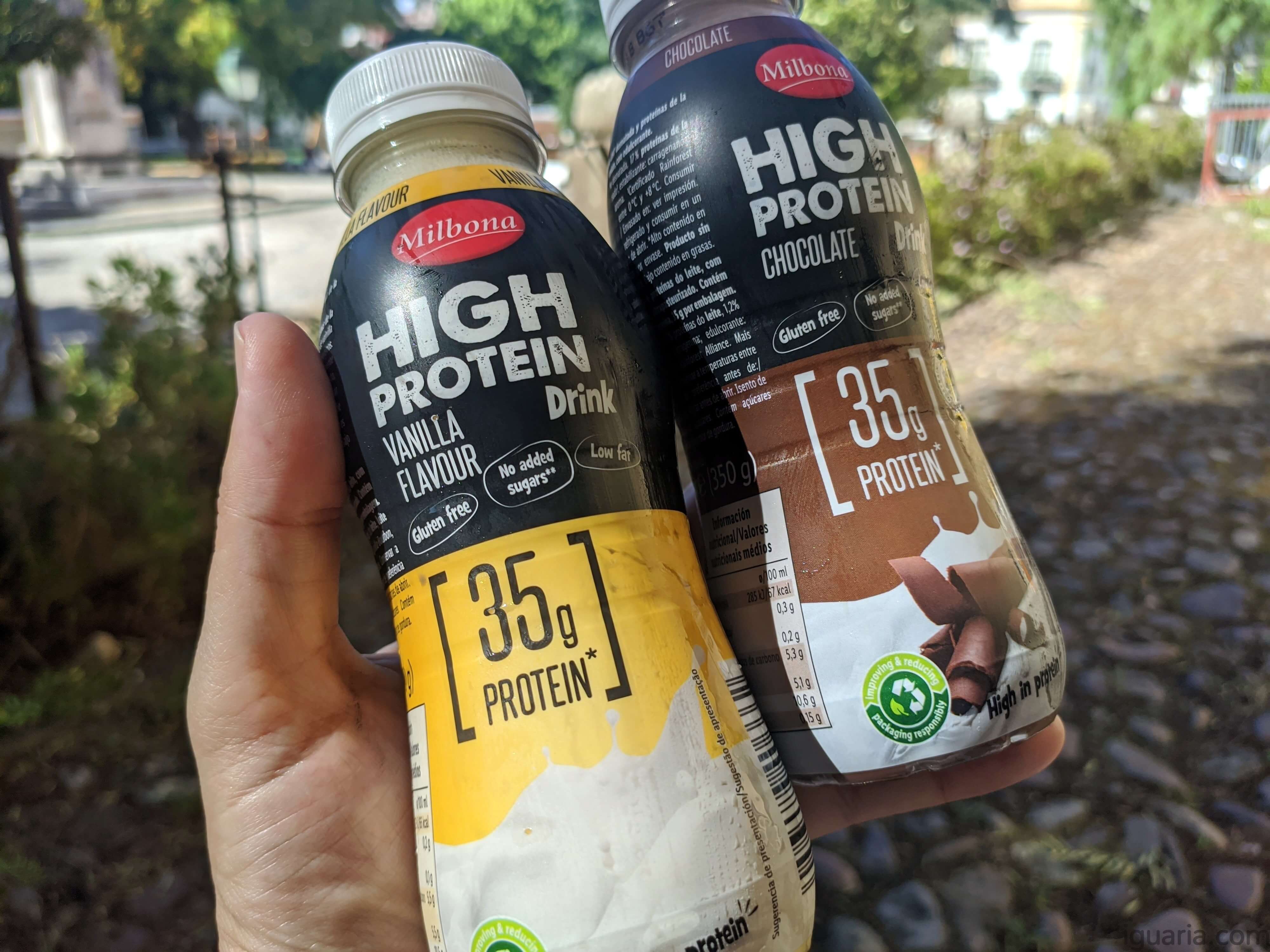 Vieram perguntar-me o que eu achava destas bebidas ricas em proteinas, em especial estas do Lidl, por isso nada como experimentar, estas são da Marca Milbona (Marca do Lidl), não têm necessariamente um nome específico é apenas Bebidas High Protein de Chocolate ou Baunilha, são vendidas na parte de refrigeração, cada uma tem 35gr de proteina, ambas são produzidas pela Molkerei Gropper na Alemanha.
