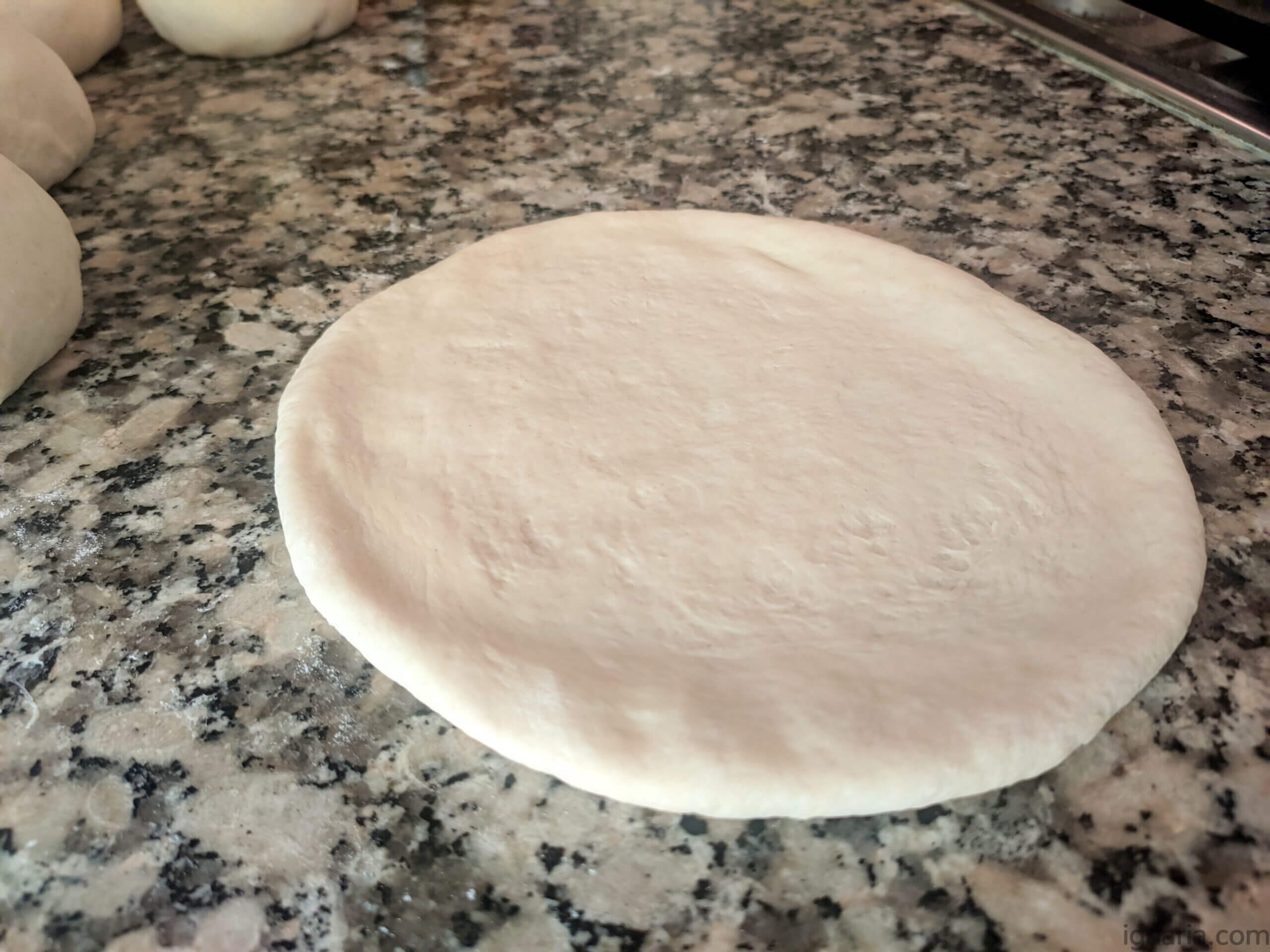 - Numa superfície enfarinhada deita a bola de massa, polvilha com um pouco de farinha e com um rolo de massa estica o disco, nota que a massa não é como massa de pizza não estica facilmente, vai usando o rolo de massa movendo a massa até obteres um disco de massa com +/- 5 ou 6mm de grossura.