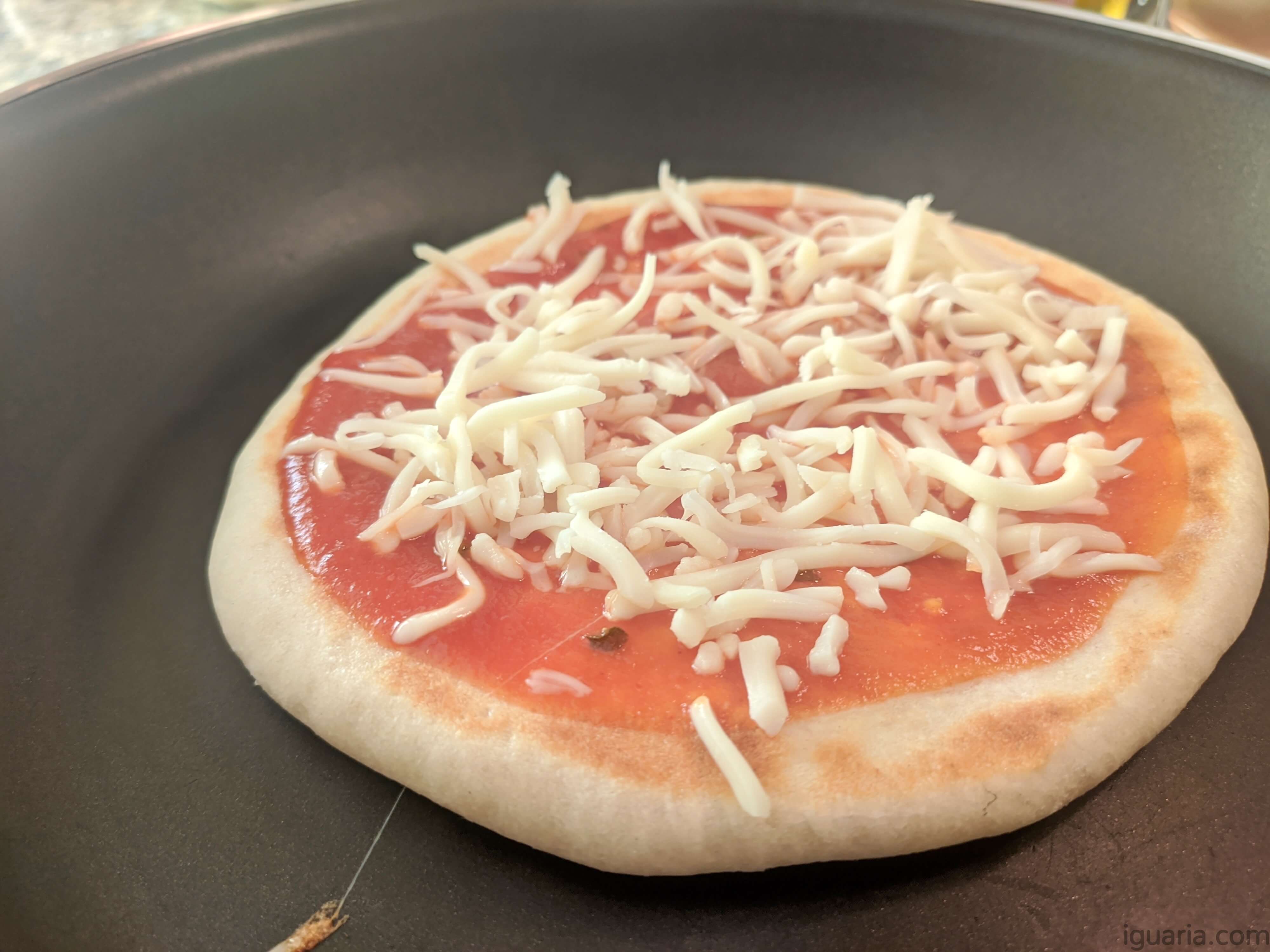 - Tapa a frigideira e deixa cozinhar mais 4 a 5 minutos até o queijo derreter e a base ficar bem dourada (Se quiseres o queijo mais gratinado, vira novamente a pizza (com cuidado!) e deixa o queijo tostar directamente na frigideira por 1 a 2 minutos.)