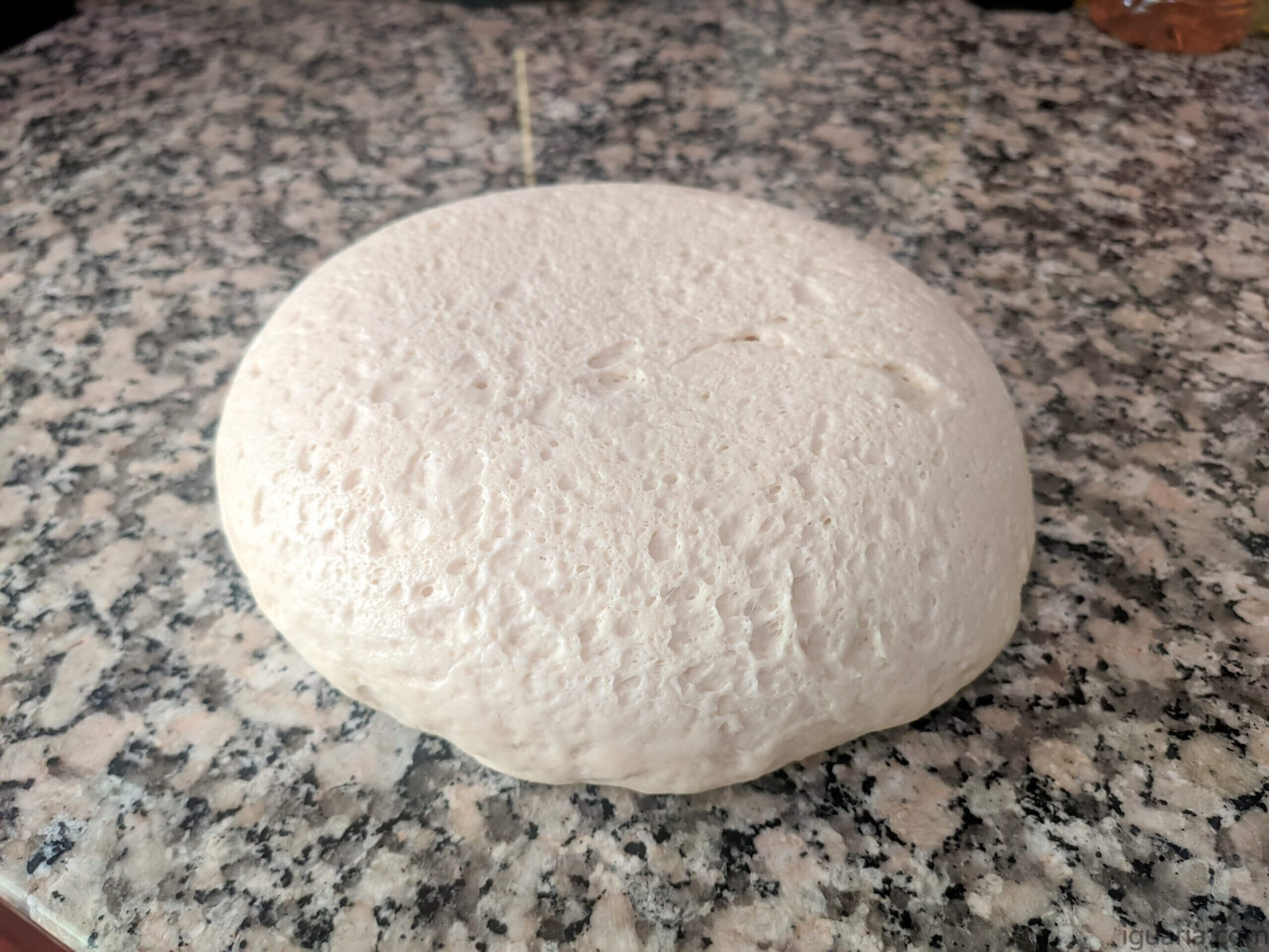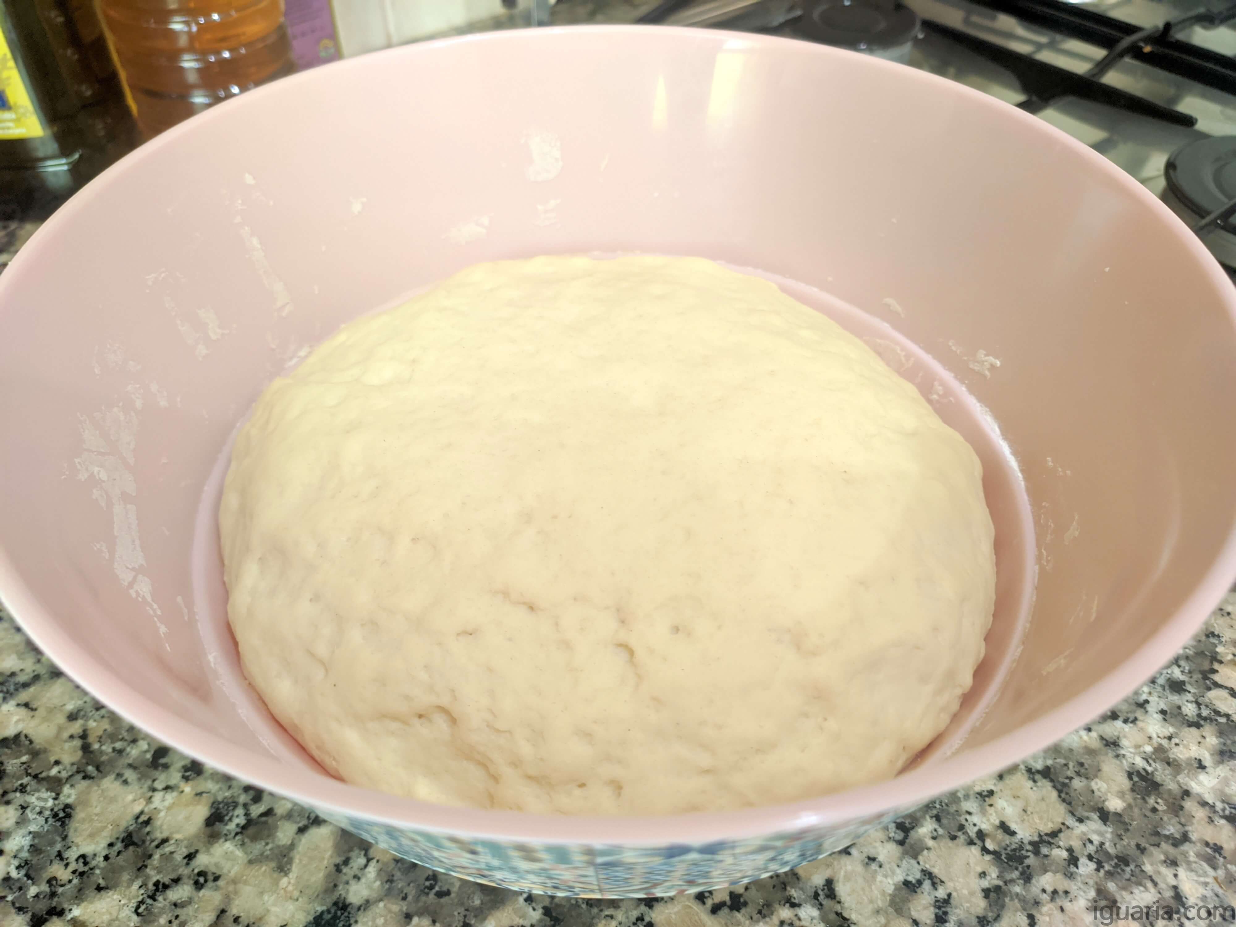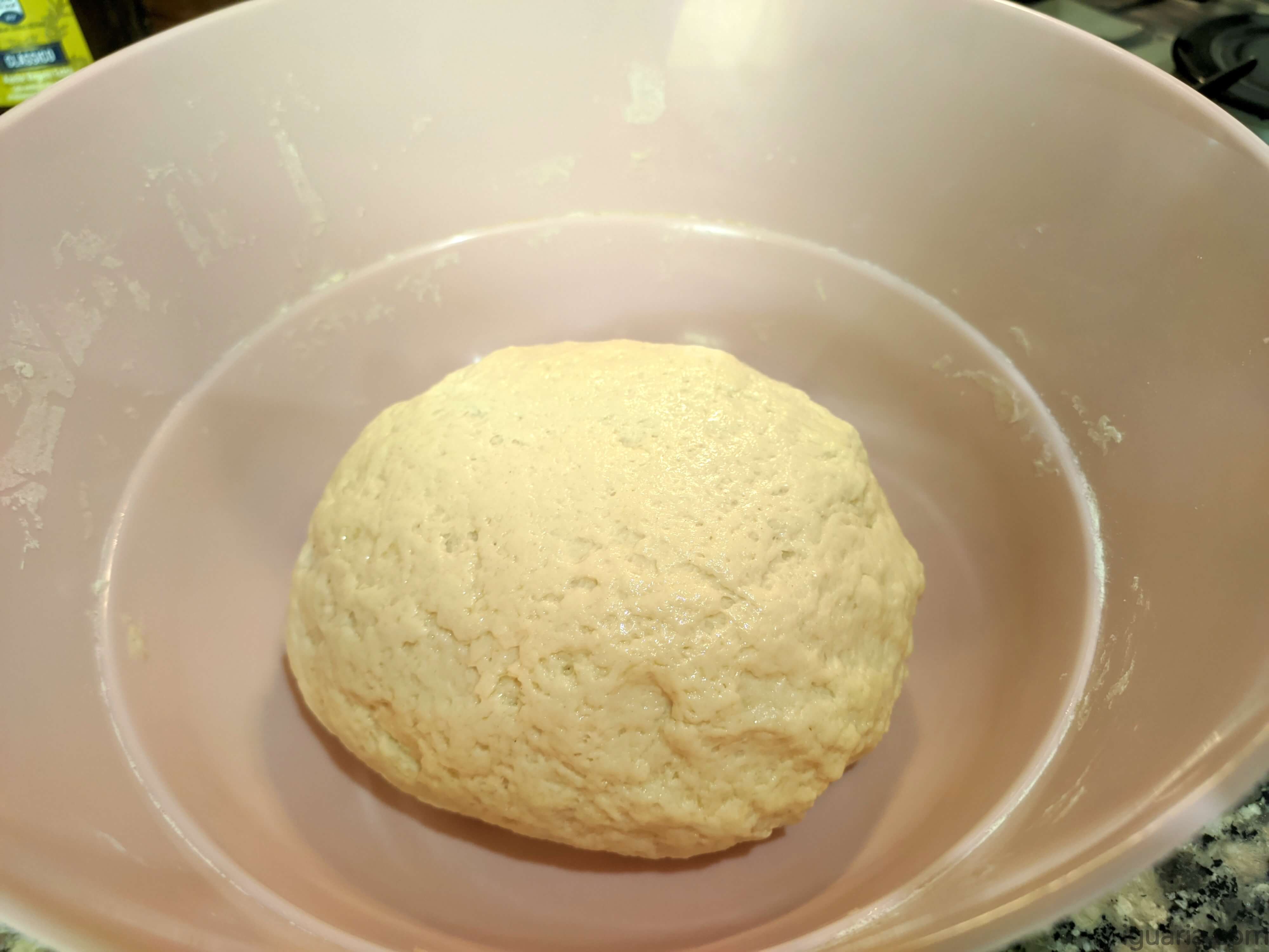 - Unta a bola de massa com um pouco de azeite, deita numa tigela e cobre de película aderente e uma toalha, deixa a levedar por pelo menos 1 a 2 horas.