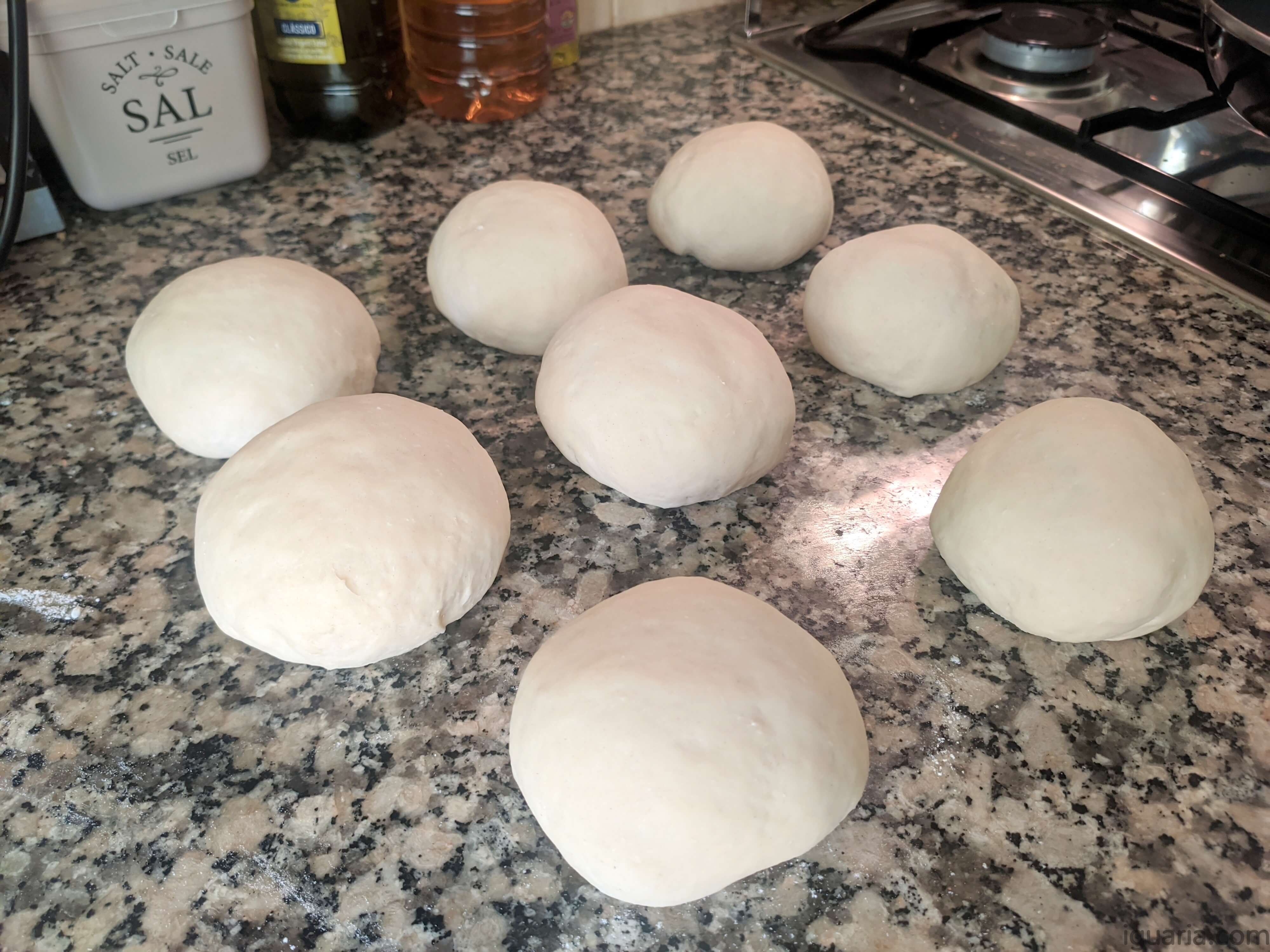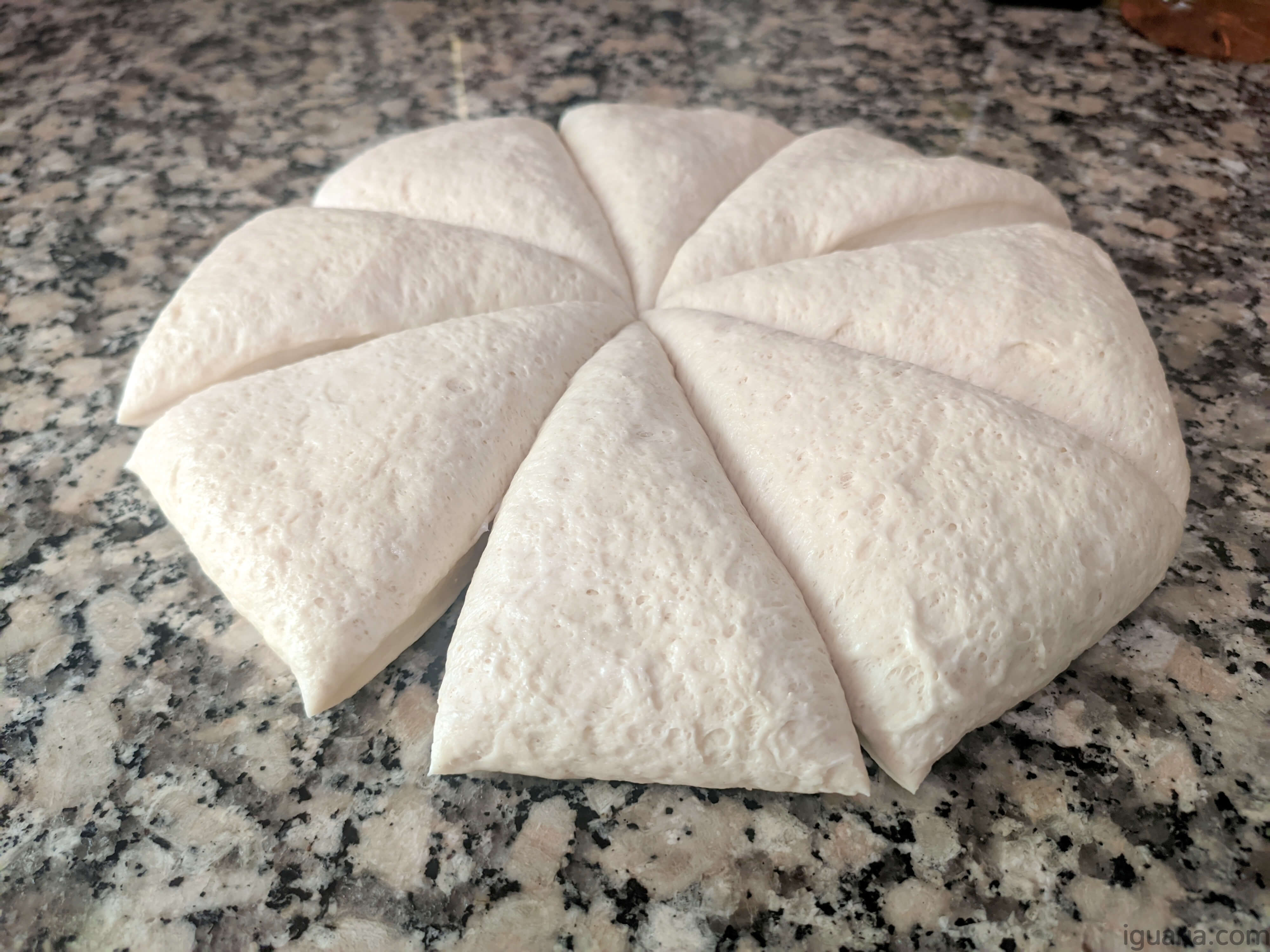 - Retira a massa da tigela, cria um disco grosso e corta este em 6 ou 8 pedaços (eu escolhi 8), agora molda cada triângulo numa bola de massa.