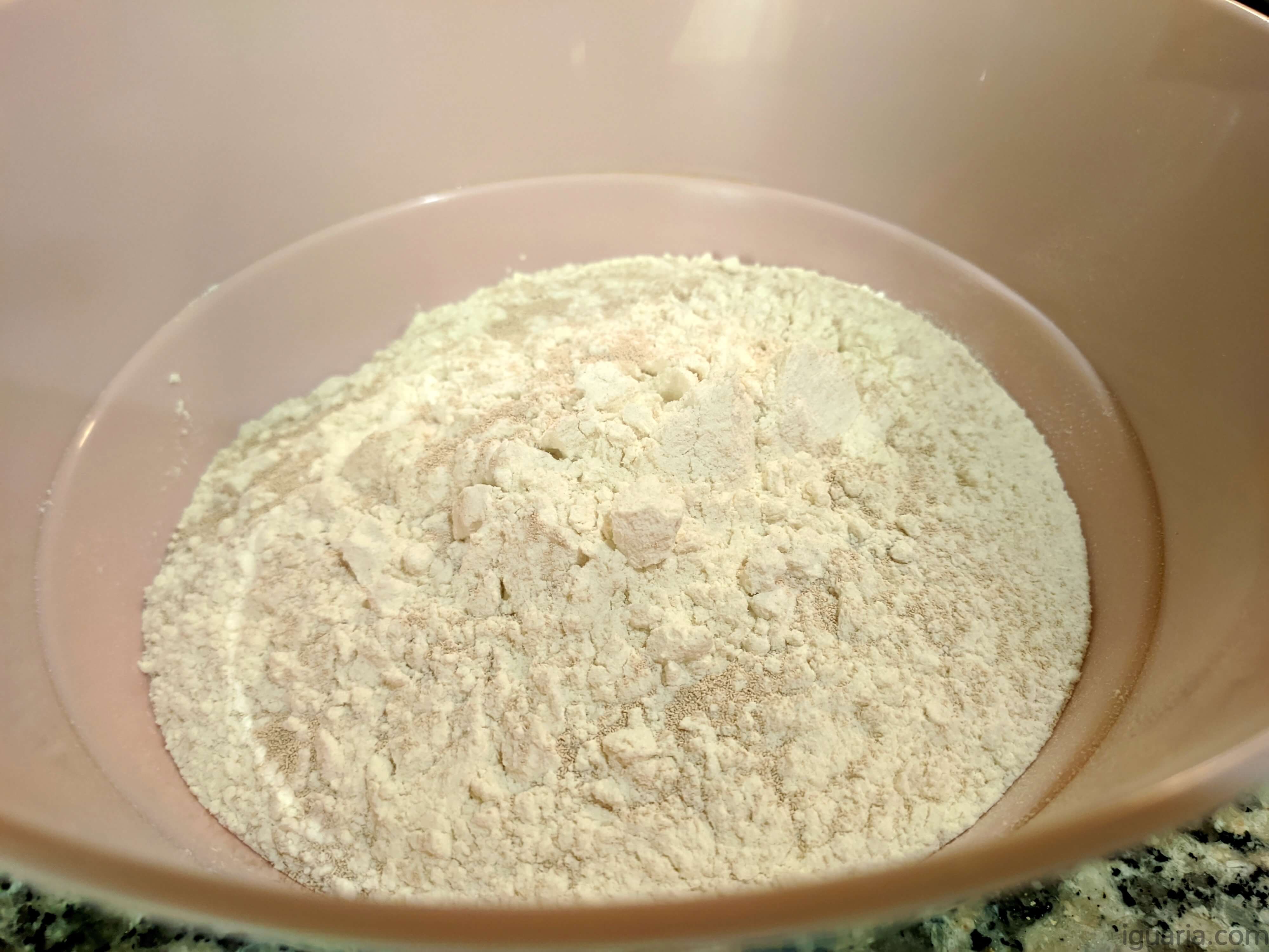 - Começa por juntar o fermento e sal à farinha, mistura bem.
