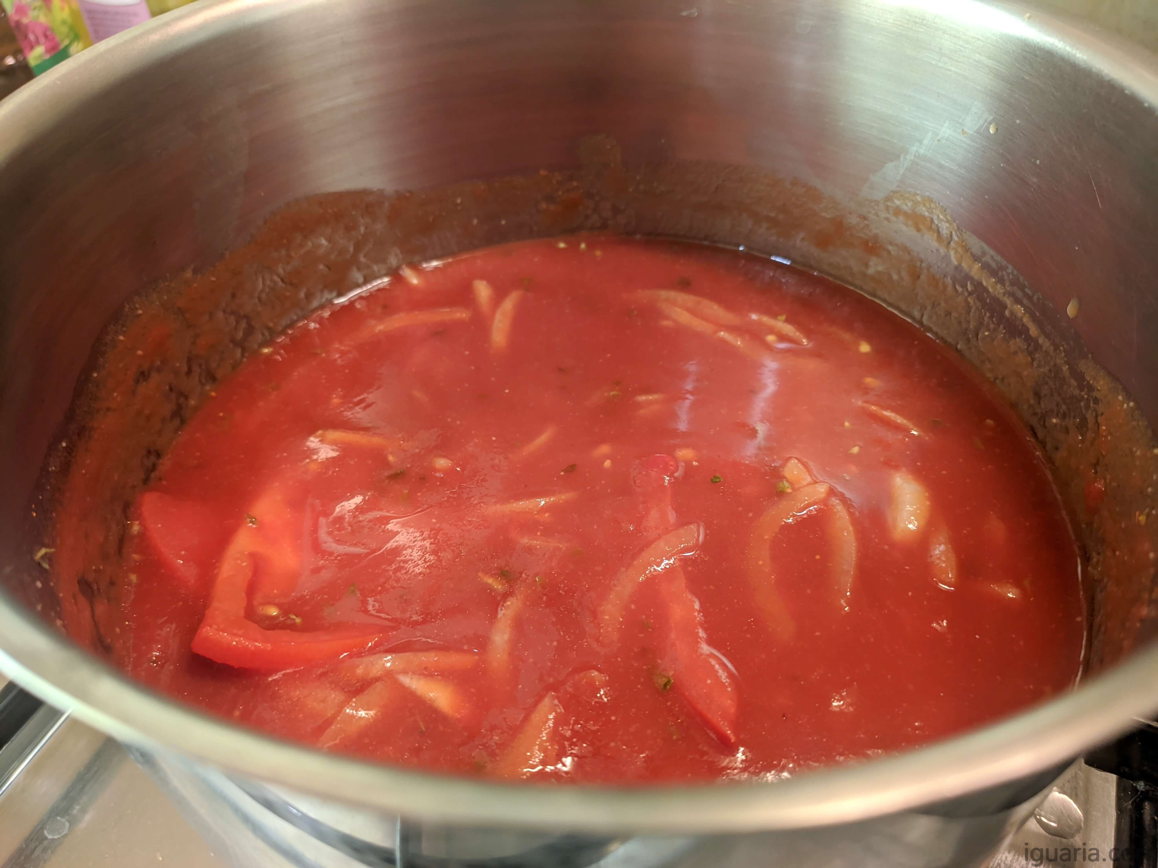 - Enquanto a massa leveda, faz o molho de tomate. Junta num pequeno tacho o tomate pelado esmagado, com um dente de alho picado, um fio de azeite, uma pitada de oregãos, sal e pimenta.