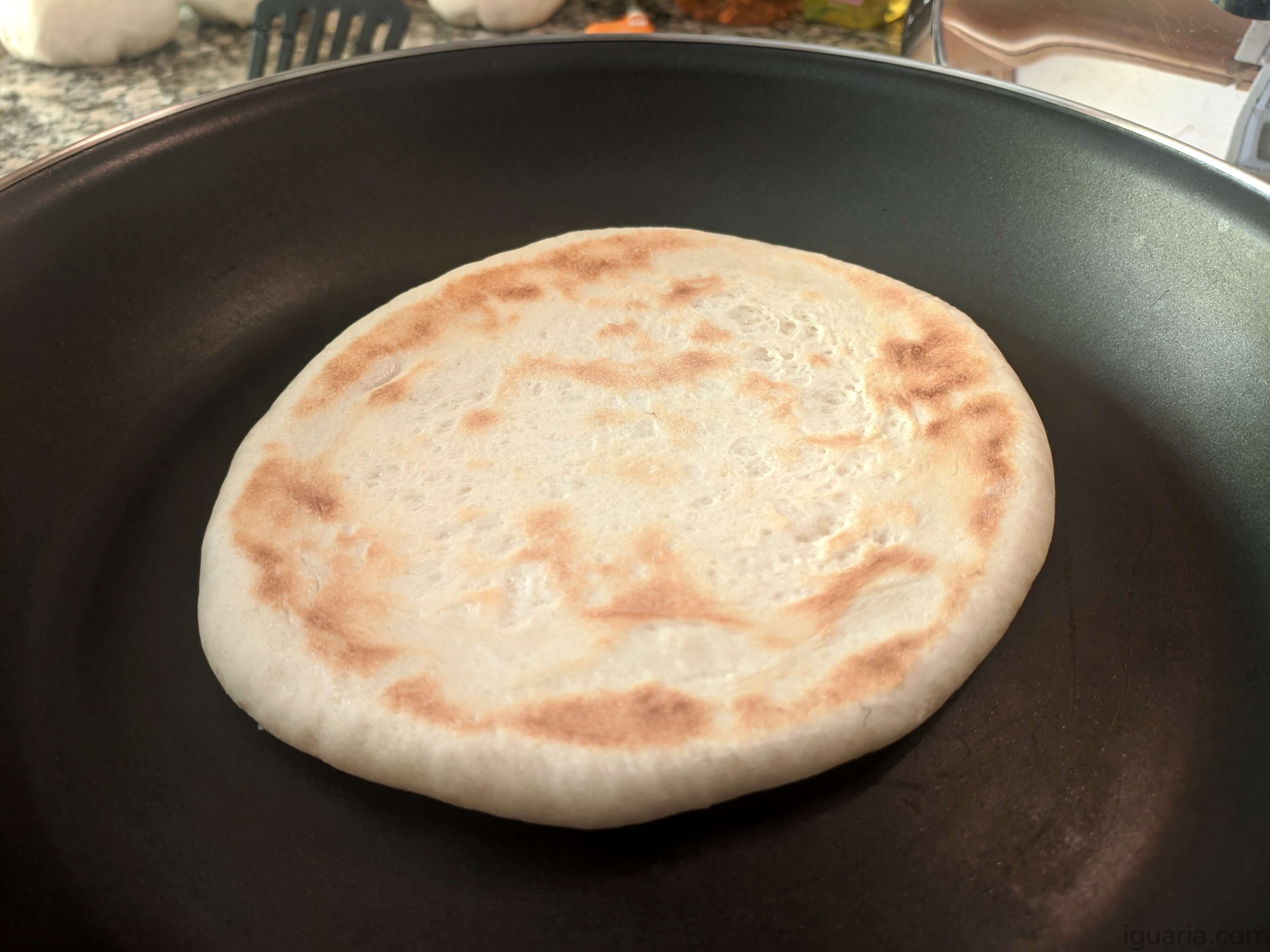- Aquece a frigideira seca (isto é sem nada) e põe a massa na frigideira, deixa cozinhar 3-4 minutos até dourar ligeiramente.