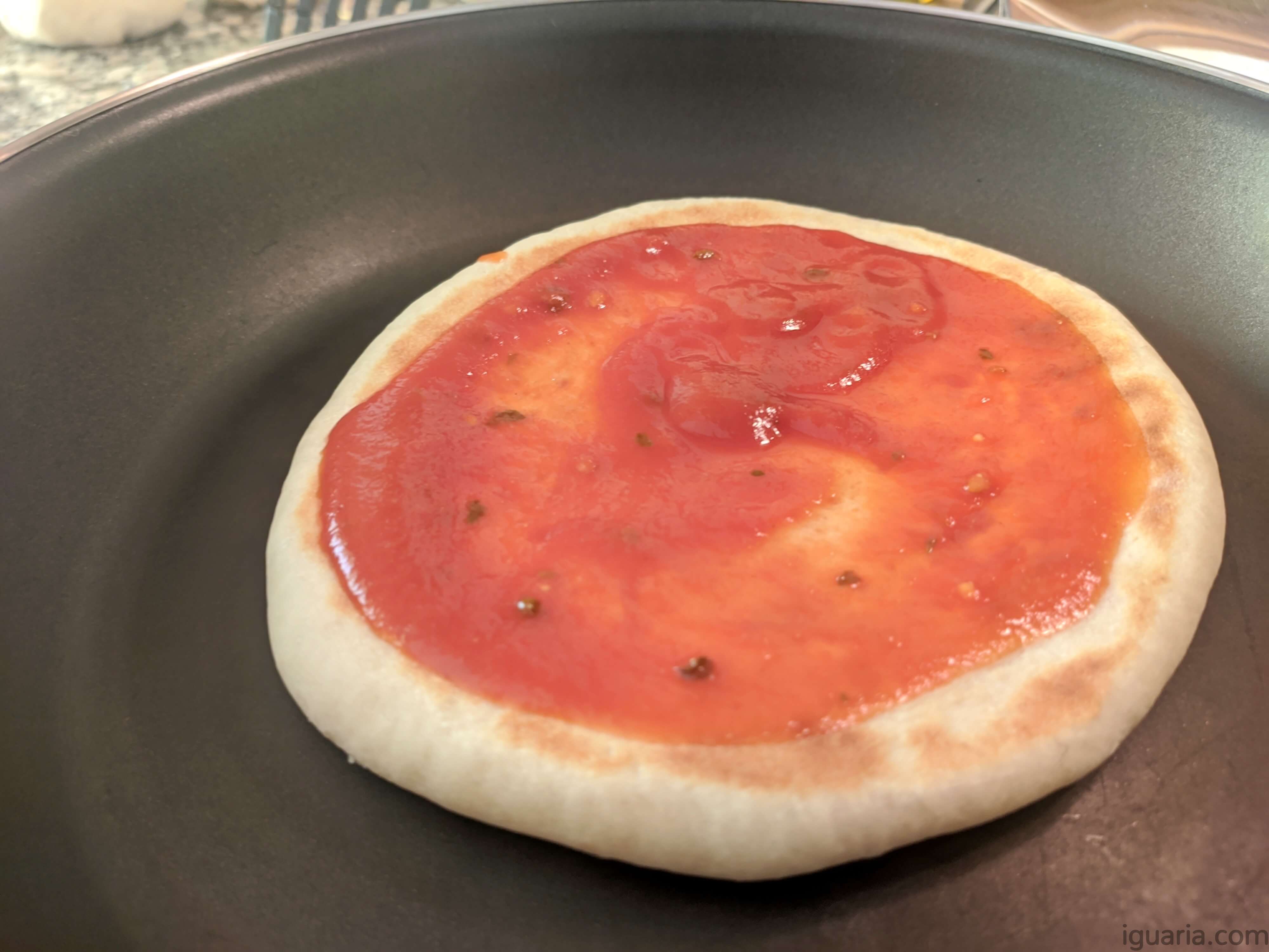 Não ponhas molho em excesso, senão a pizza fica encharcada. Uma colherada bem espalhada chega perfeitamente.