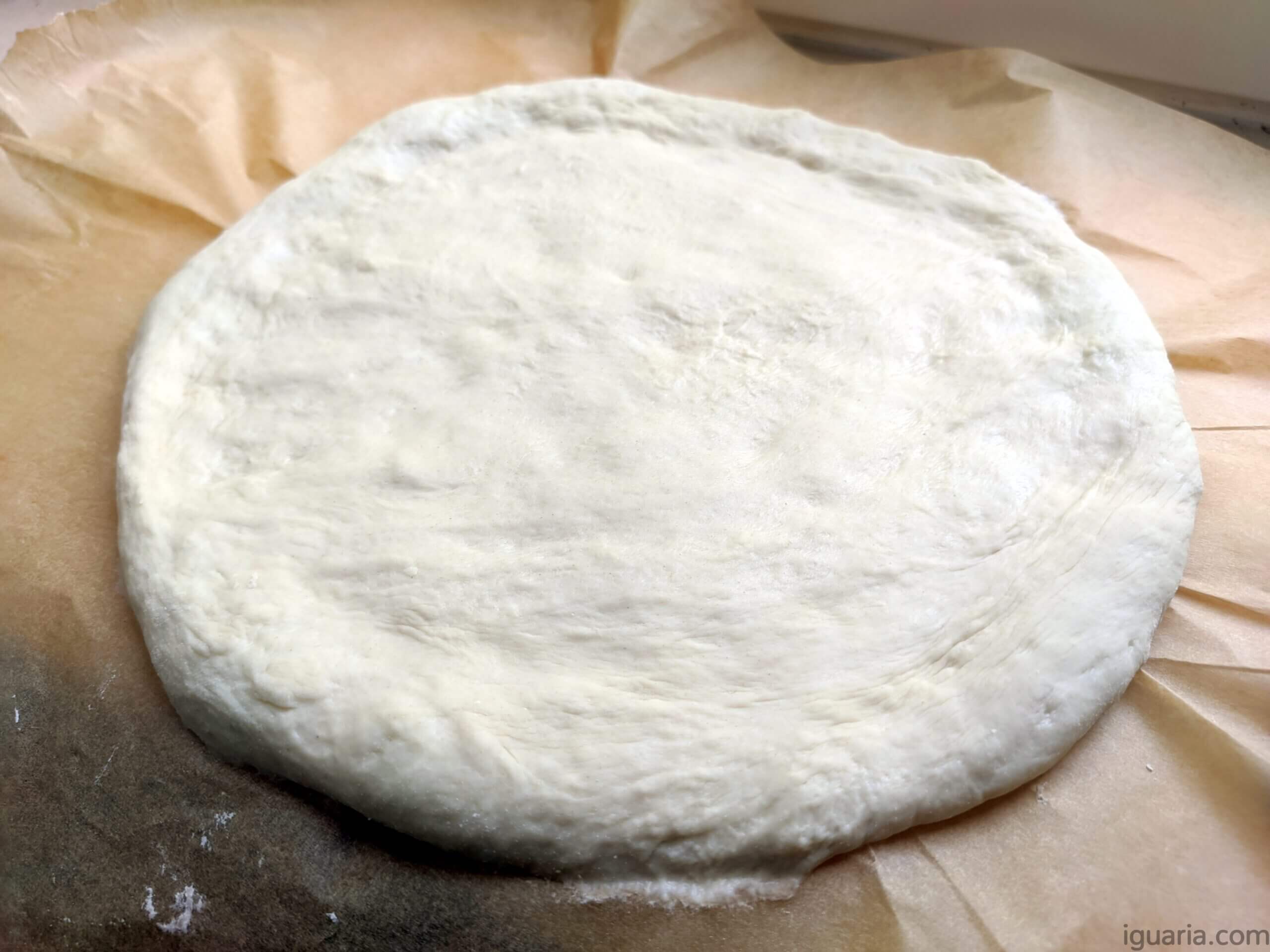 - Numa superfície enfarinhada ou sobre papel vegetal, estende uma bola de massa até ficar bem fina, formando um círculo.
