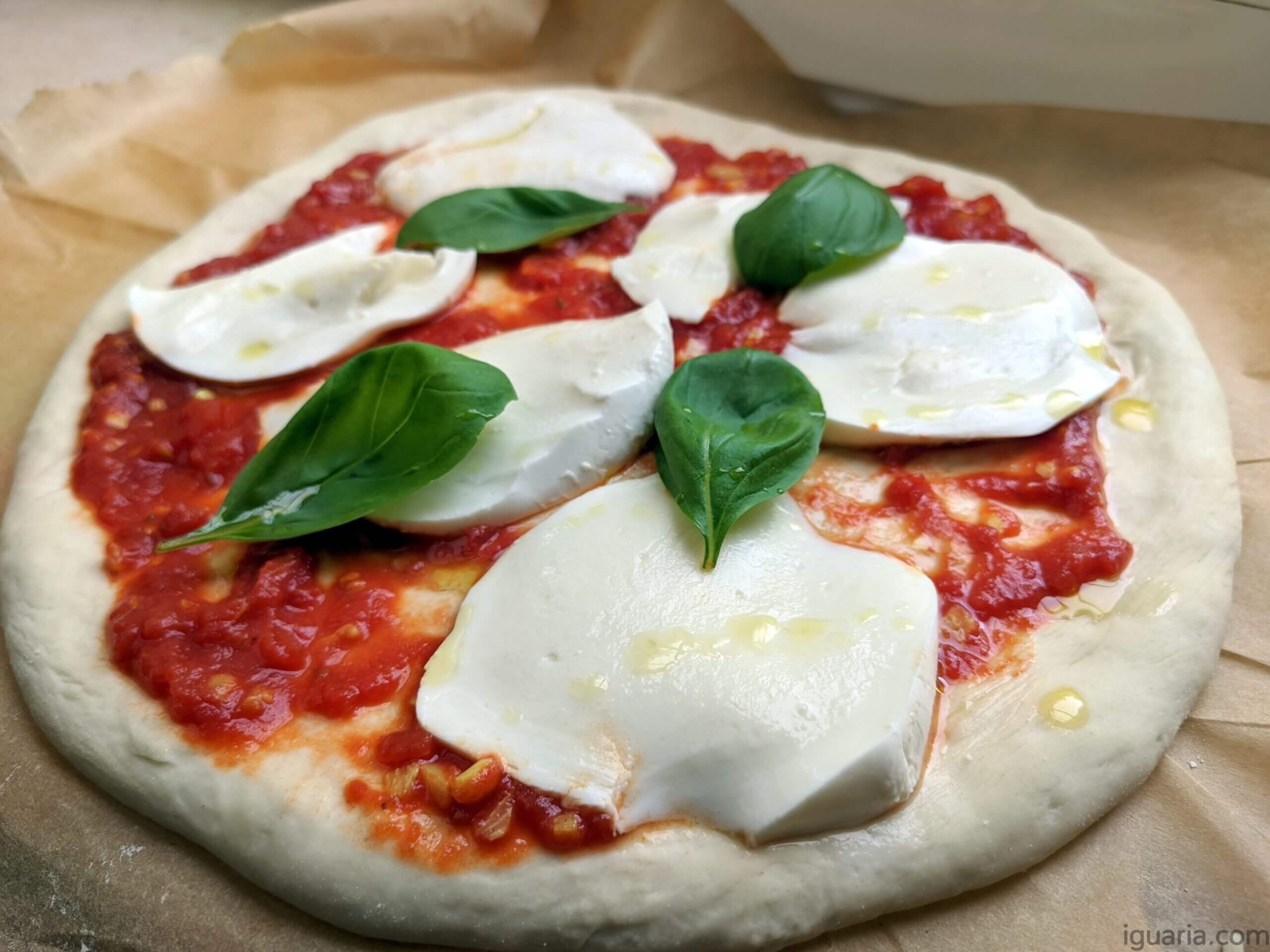 - Espalha uma camada fina de molho de tomate, distribui a mozzarella de búfala e algumas folhas de manjericão.