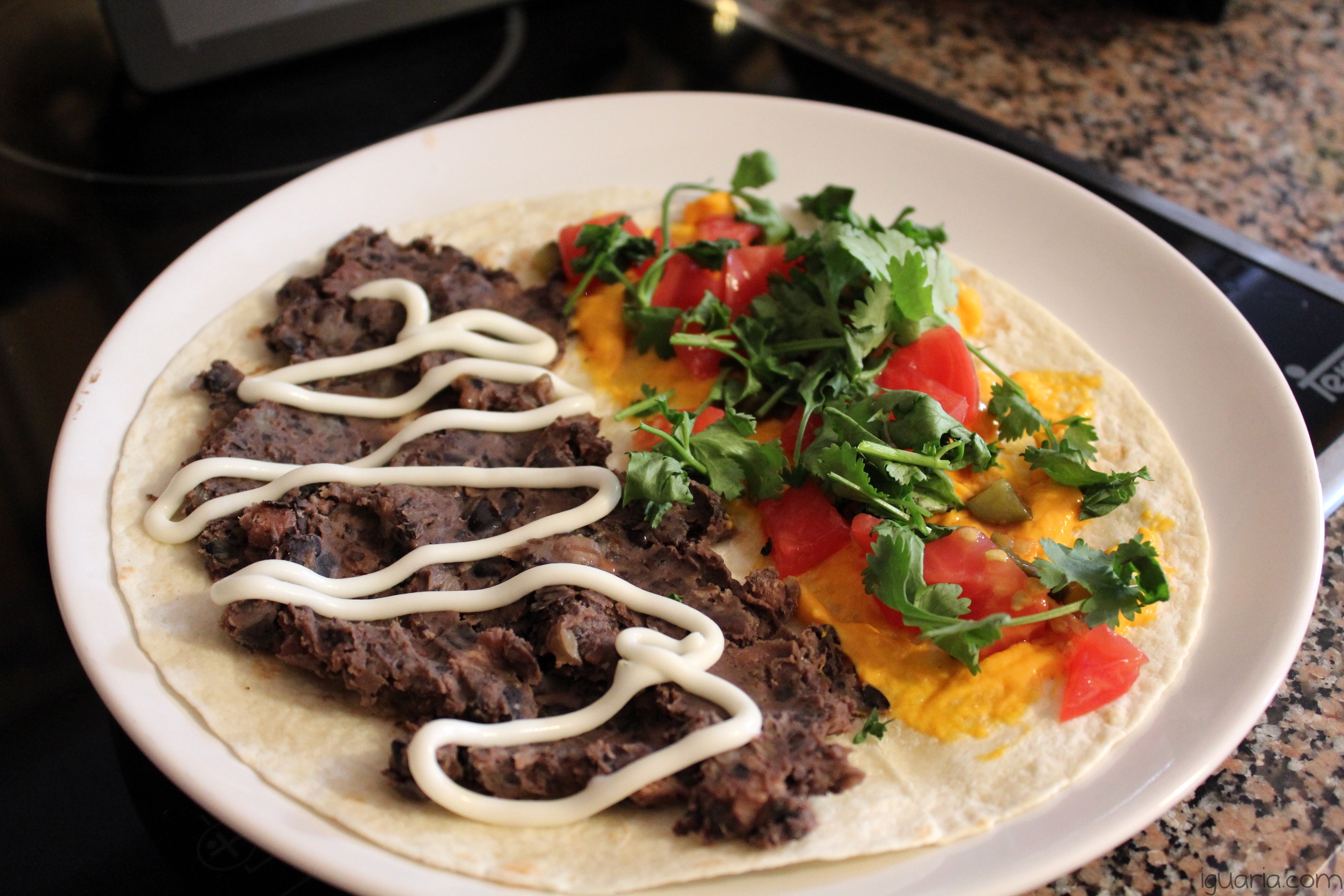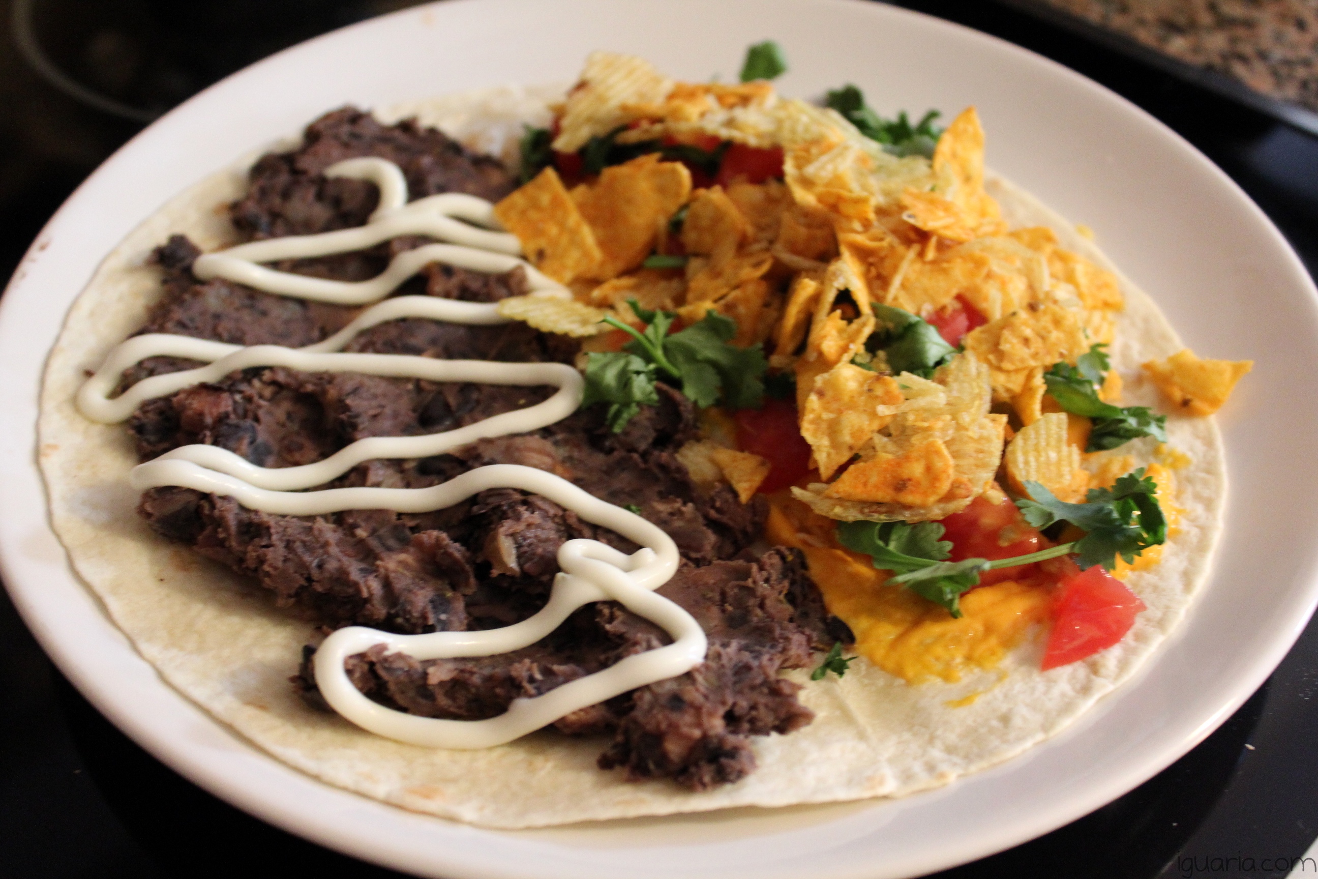 - Junta numa tortilha de trigo feijão frito numa das metades, cobre o feijão de maionese, depois na outra metade deita o queijo fundido e cobre com tomate, coentros, batatas fritas e nachos.
