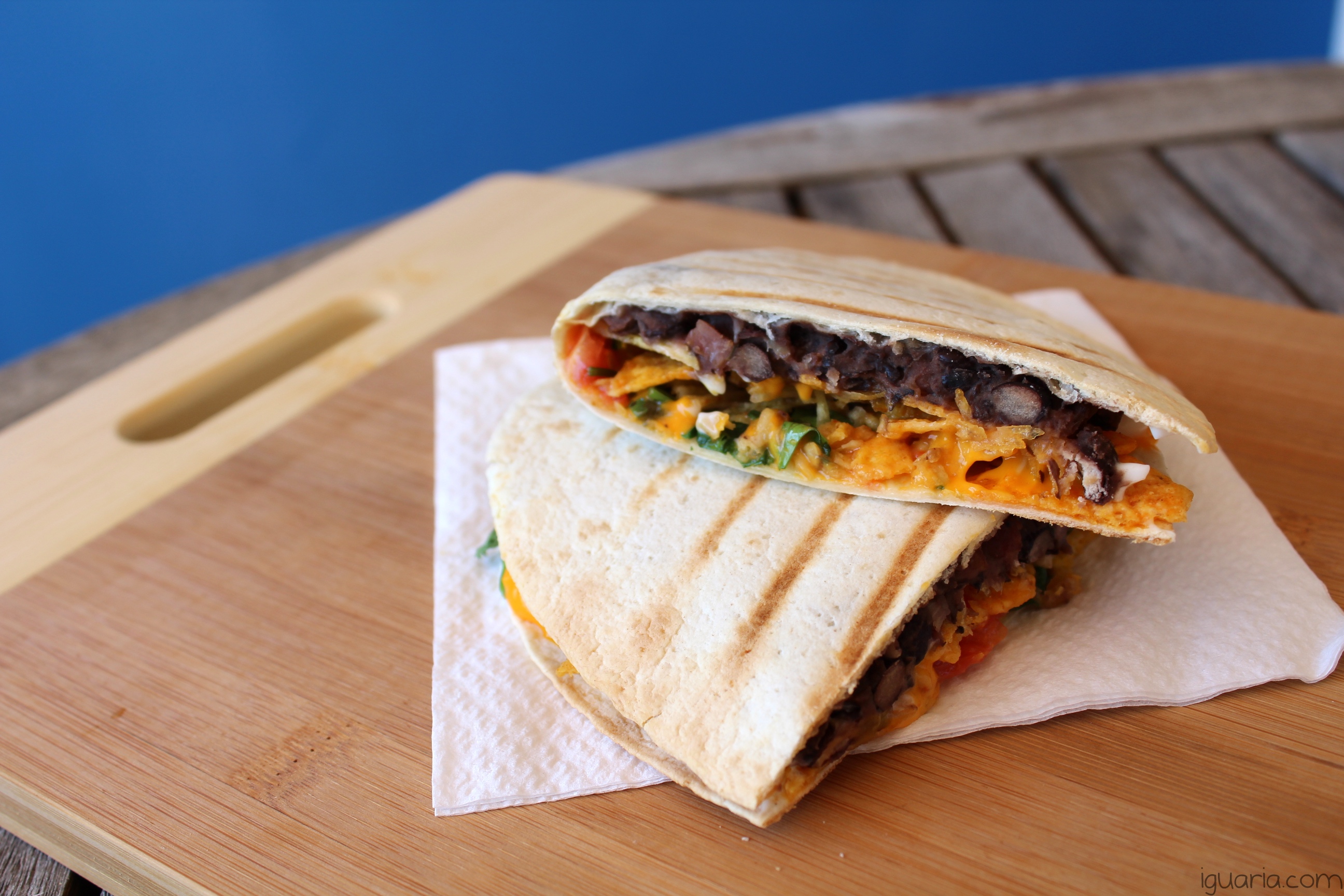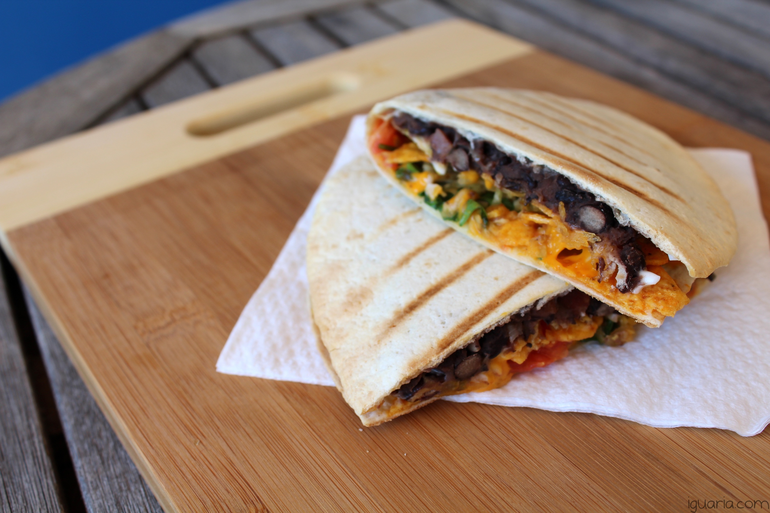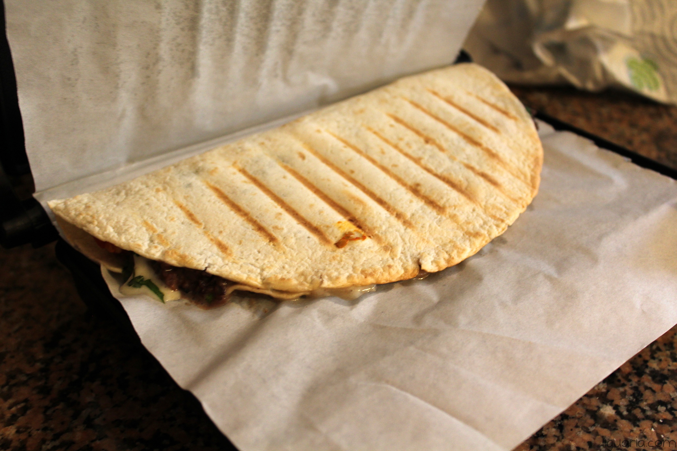 - Dobra e leva a um grelhador ou grelhador de sandes, deixa cozinhar até a tortilha ficar crocante e o queijo bem derretido e já está, bom proveito!