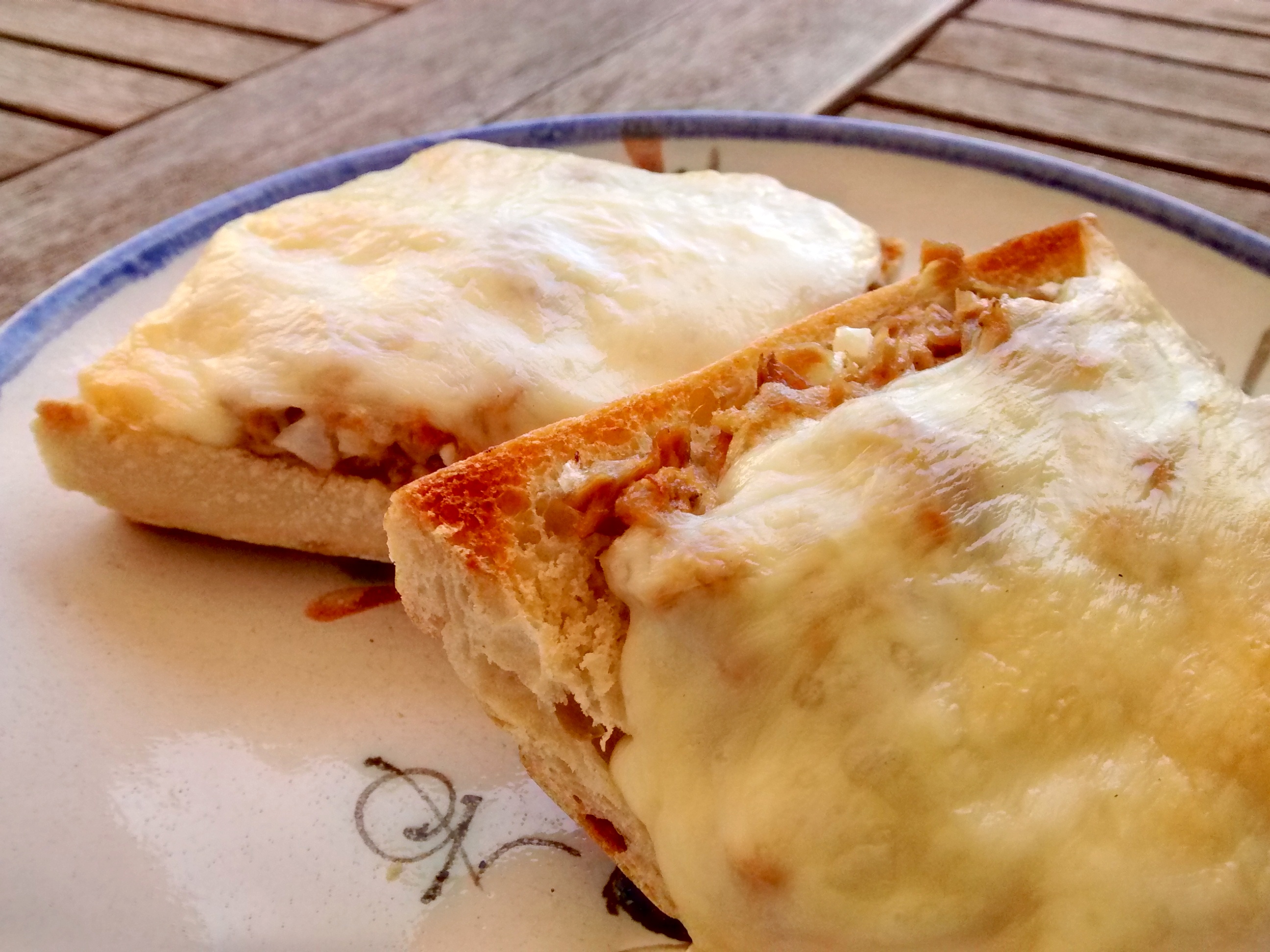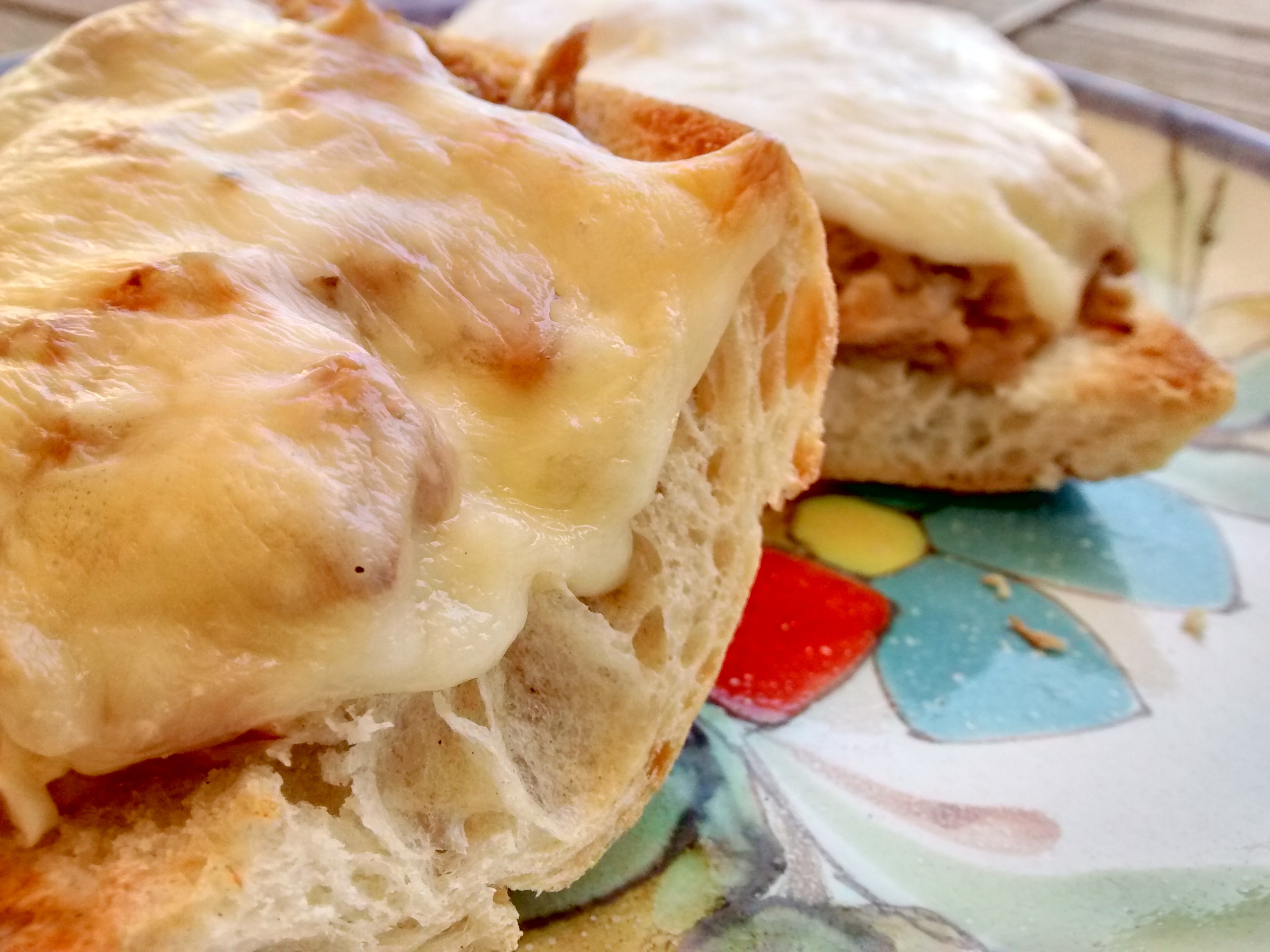 Também conhecida por “tuna melt” (atum derretido em inglês), normalmente é atum com queijo gratinado por cima, esta minha variação inclui pickles e um pouco de sriracha para dar um toque de picante e ácido.