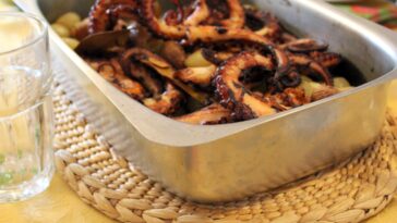 - Tempera com uma pitada de sal, duas colheres de azeite, uma colher de vinagre e uma pitada de coentros, mistura e deixa de parte.