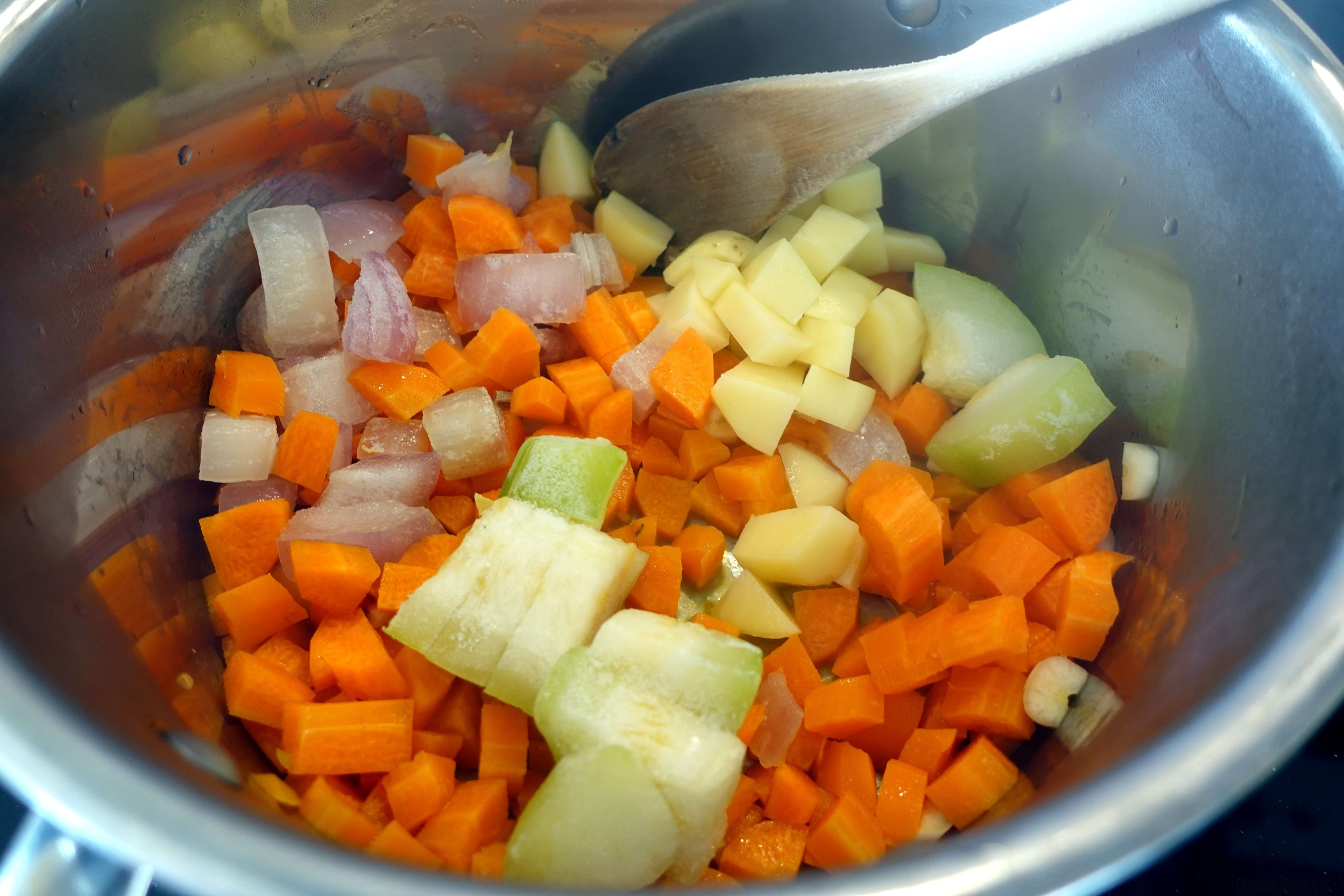 - Começa por lavar e descascar todos os legumes, corta tudo em cubos pequenos de forma a cozinhar mais rapidamente.