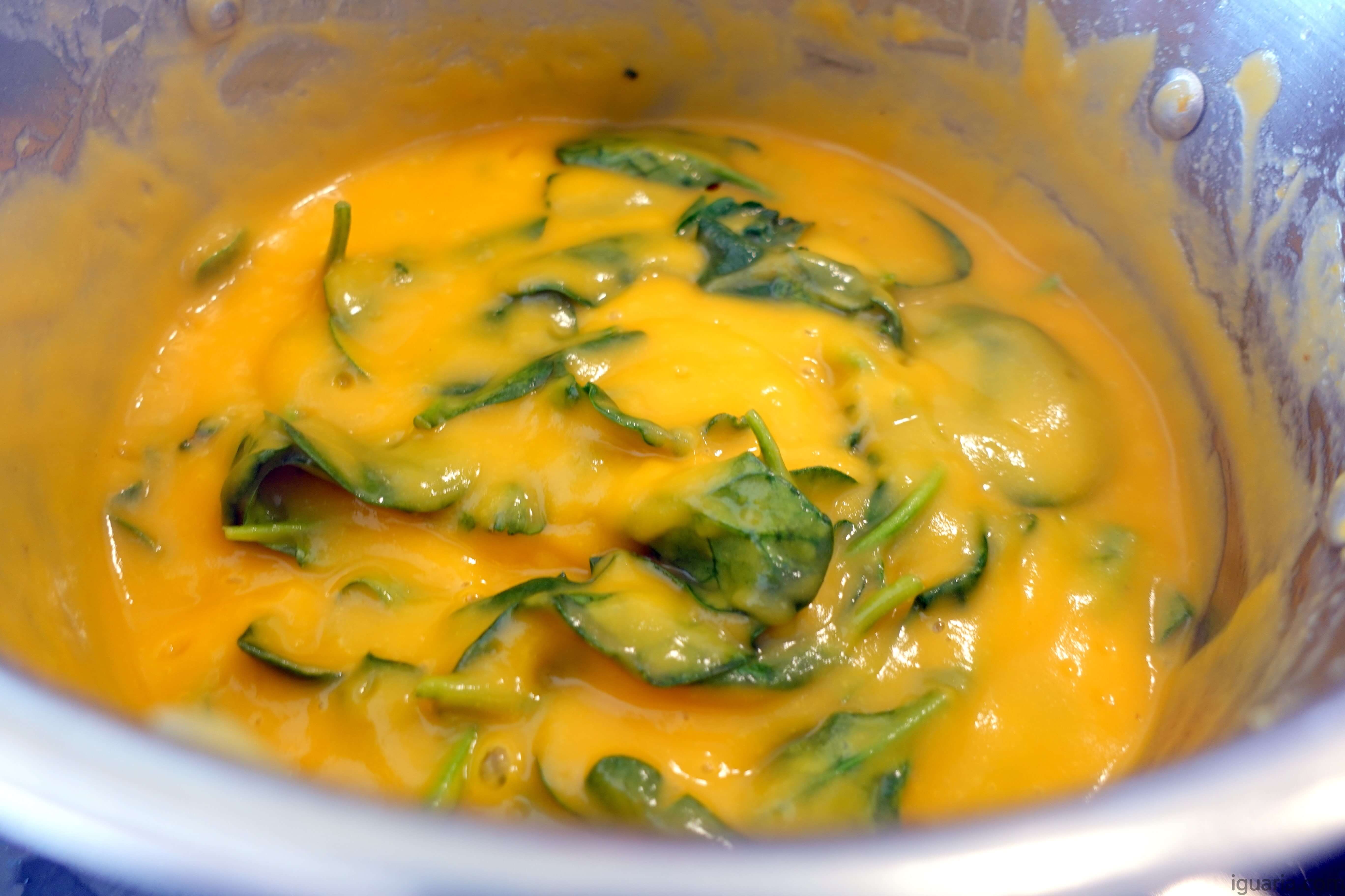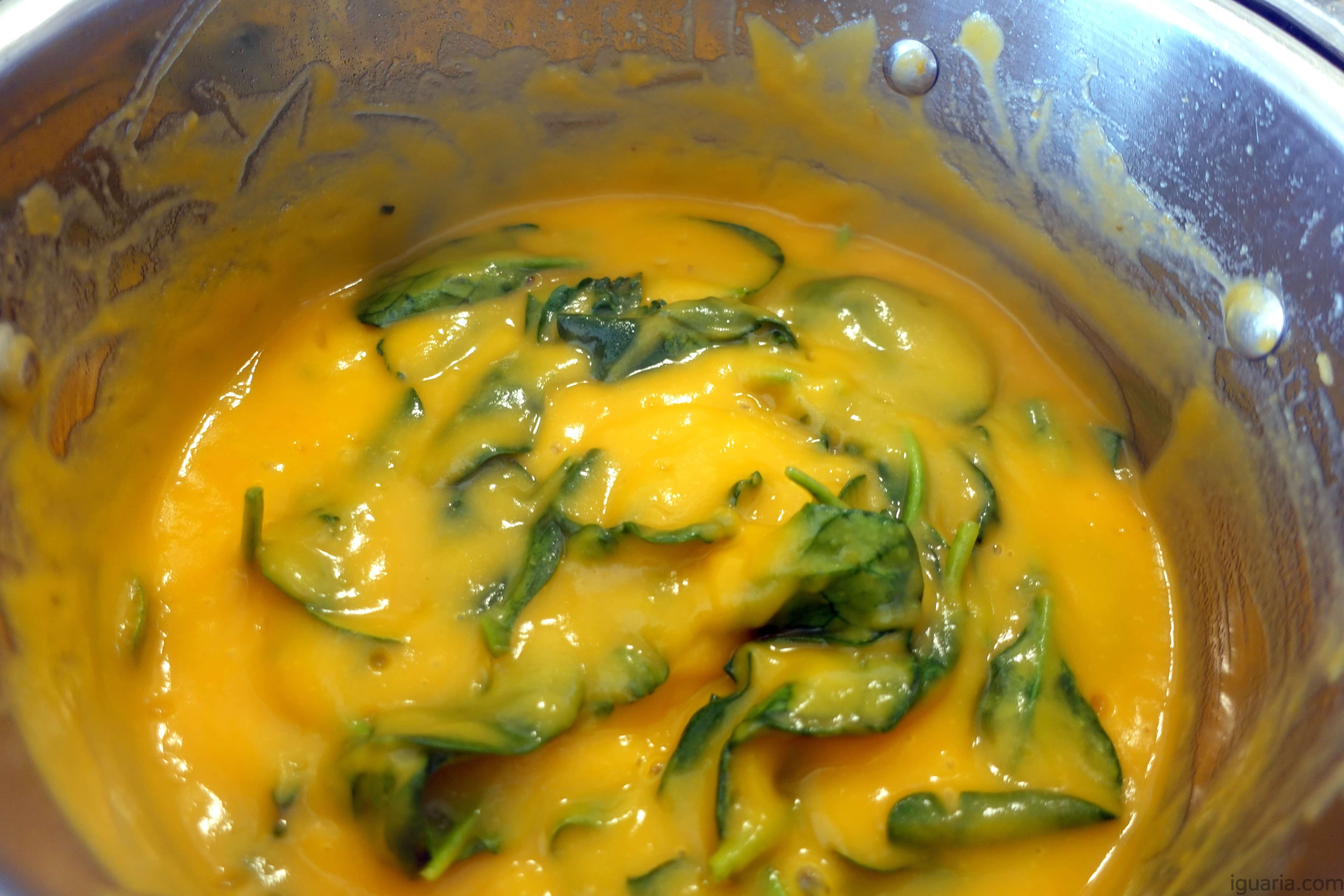 - Agora tritura tudo com uma varinha mágica até teres um creme bem suave, adiciona então os espinafres e cozinha por mais uns minutos até estes estarem também tenros.
