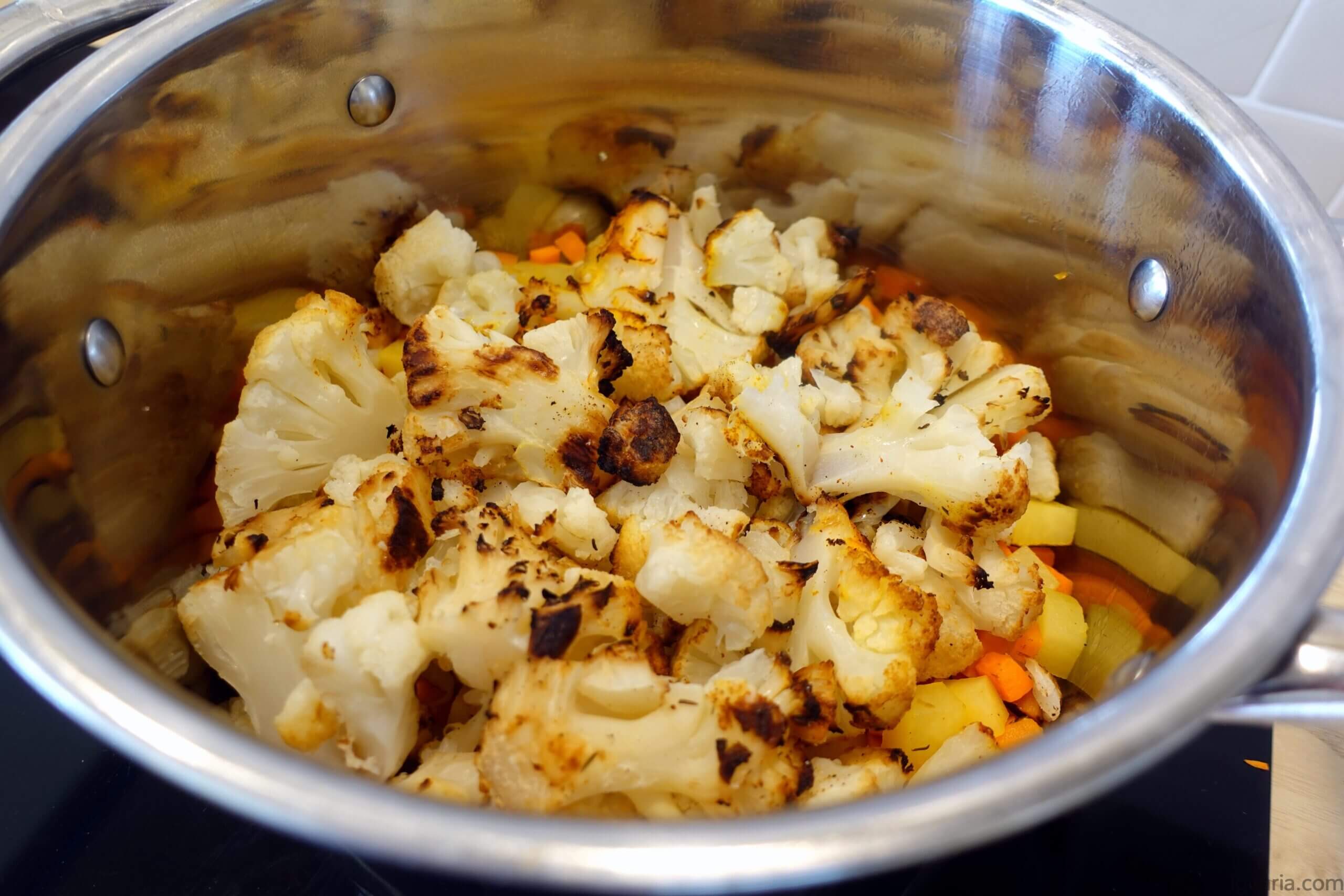 Super simples de fazer, é assar a couve flor, juntar esta e uns legumes na panela cozer até tenro, triturar até cremoso, provar, retificar temperos e servir com uma colherzinha de natas ácidas… perfeição! Vamos à receita!