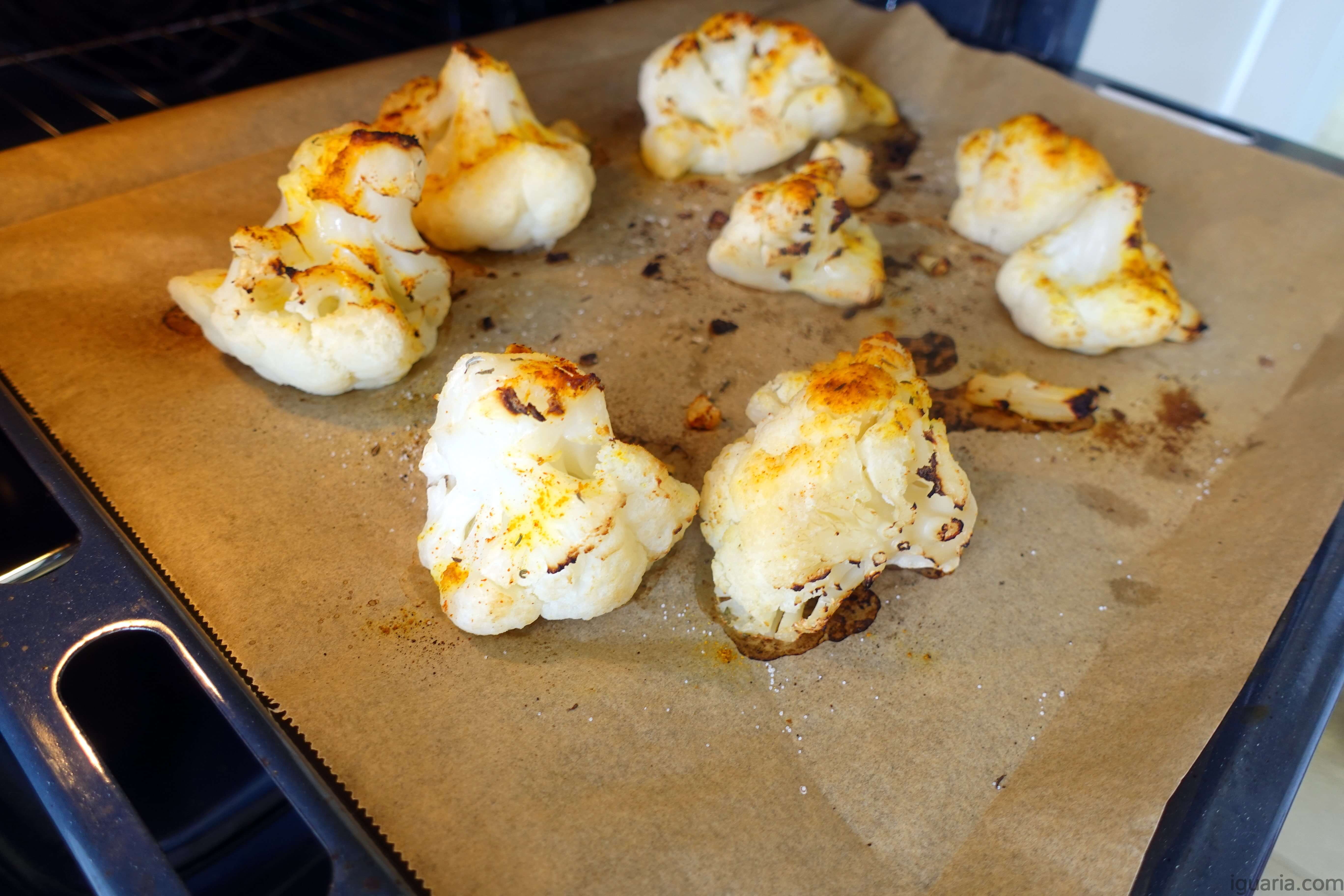 - Começa por dispor a couve-flor desfeita em floretes num tabuleiro com papel anti-aderente, deixa estes espaçados porque perto uns dos outros vão cozer mais a vapor que assar, tempera com uma pitada de sal e pimenta.