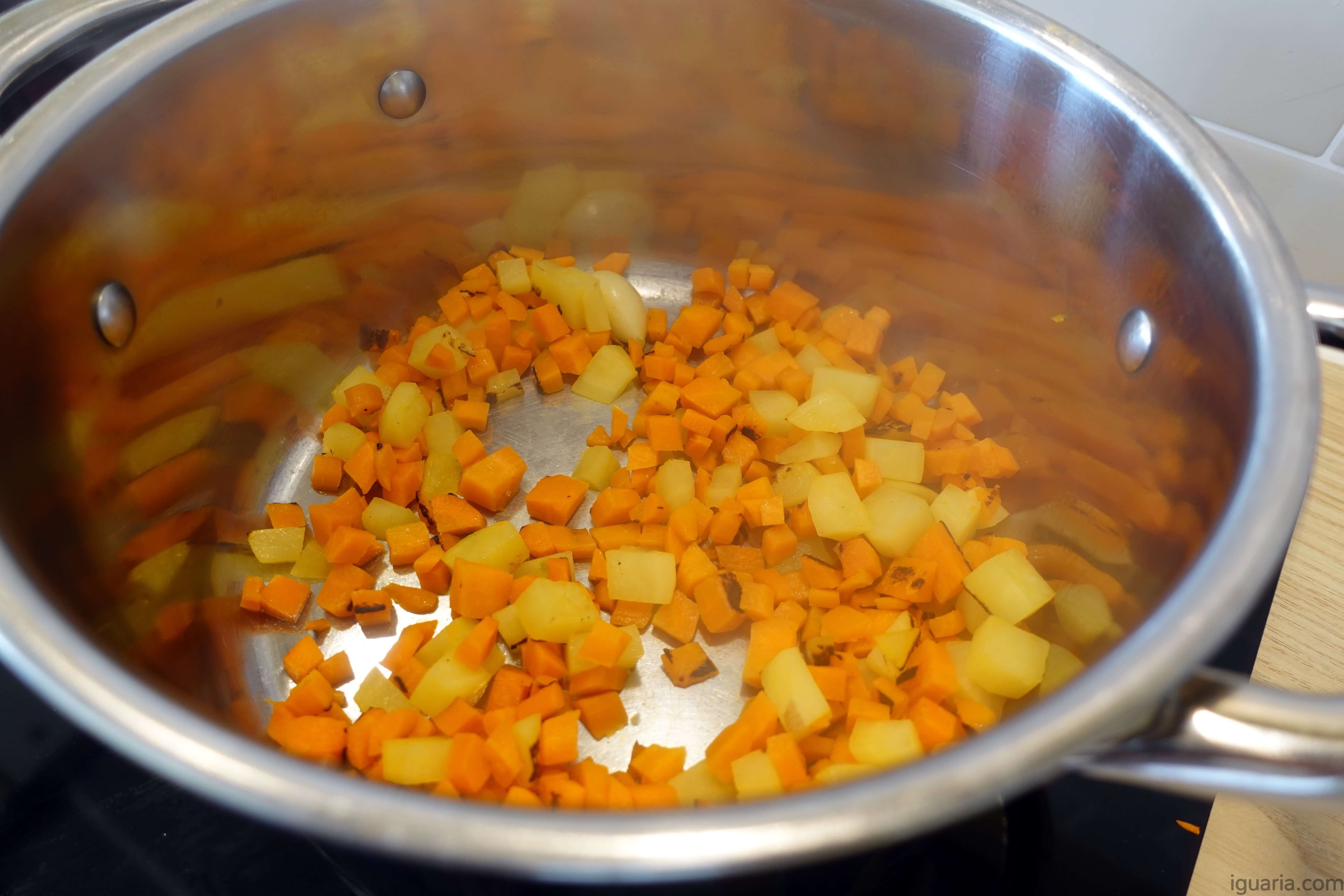 - Enquanto a couve-flor está a assar, descasca a cenoura, batata e alho e corta tudo em cubinhos pequenos, numa panela grande com um fio de azeite e uma pitada de sal e pimenta, cozinha só um pouco em lume brando (só estás a fazer tempo para a couve-flor)