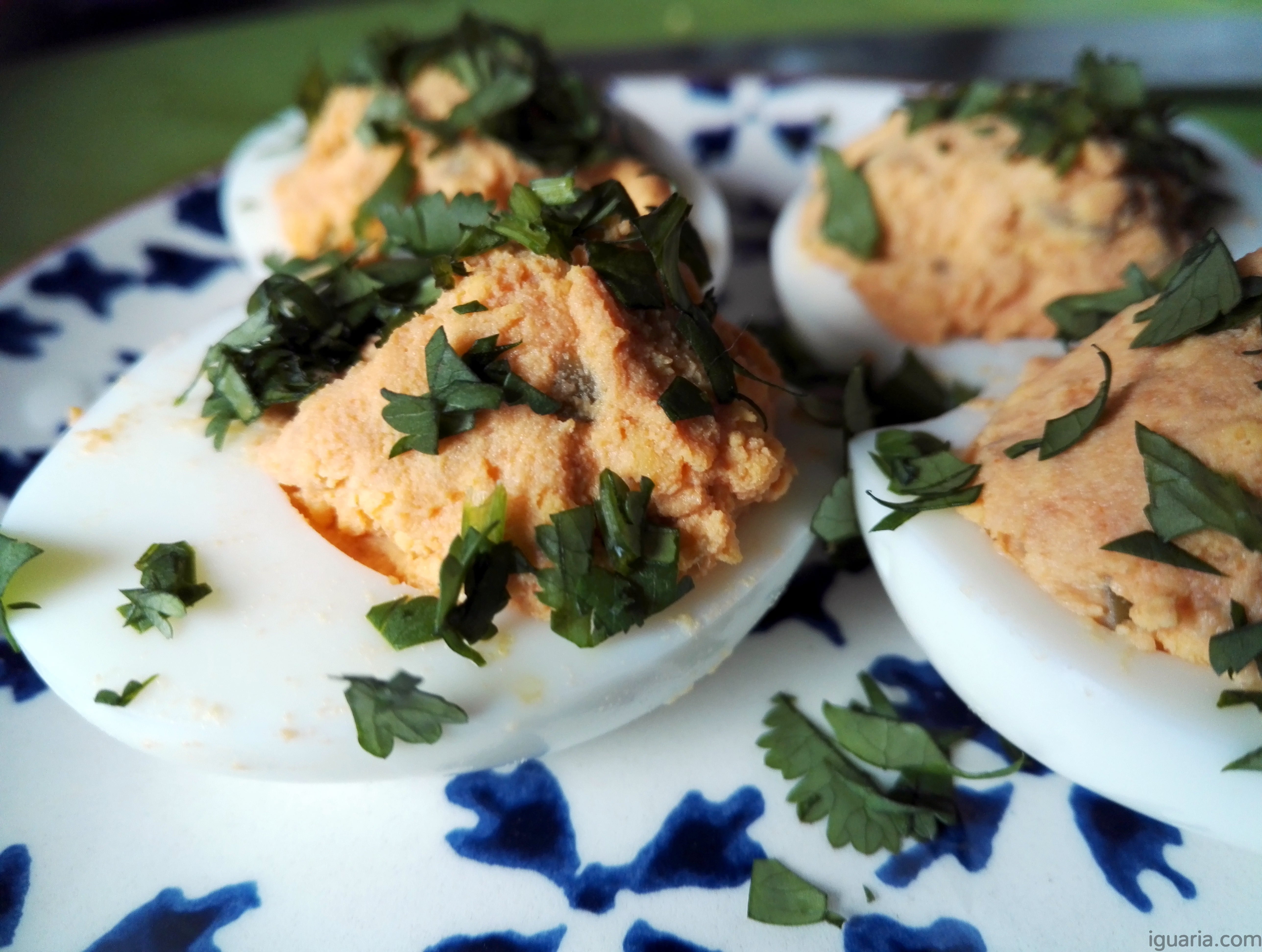 Receita deliciosa de ovos recheados com uma pitada de coentros.