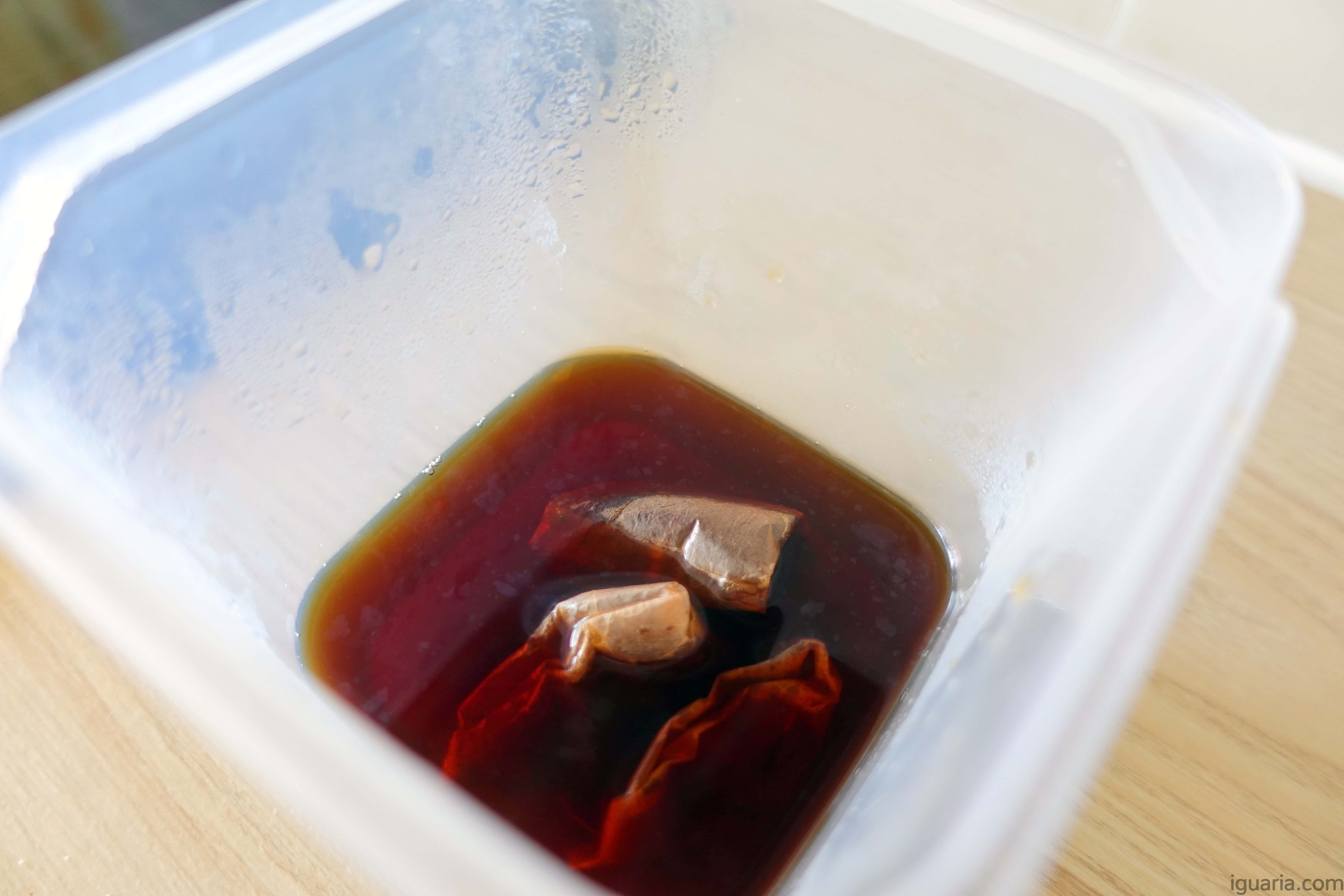 - Agora faz o chá preto, deita os 8 sacos de chá num recipiente e junta 240 ml de água a escaldar, deixa o chá a infundir por uns 10 minutos (bastante mais tempo que o normal para fazer um chá bem forte).