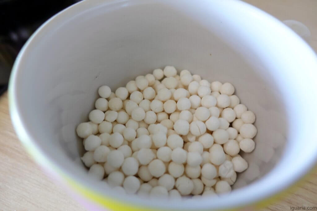 - Passado os 30 minutos, escorre as pérolas de tapioca e passa estas por água fria (fazes isto para retirar o excesso de amido e parar o processo de cozedura), prova uma pérola, esta deve ter um sabor tenro e mastigável e o centro deve estar cremoso e não duro.