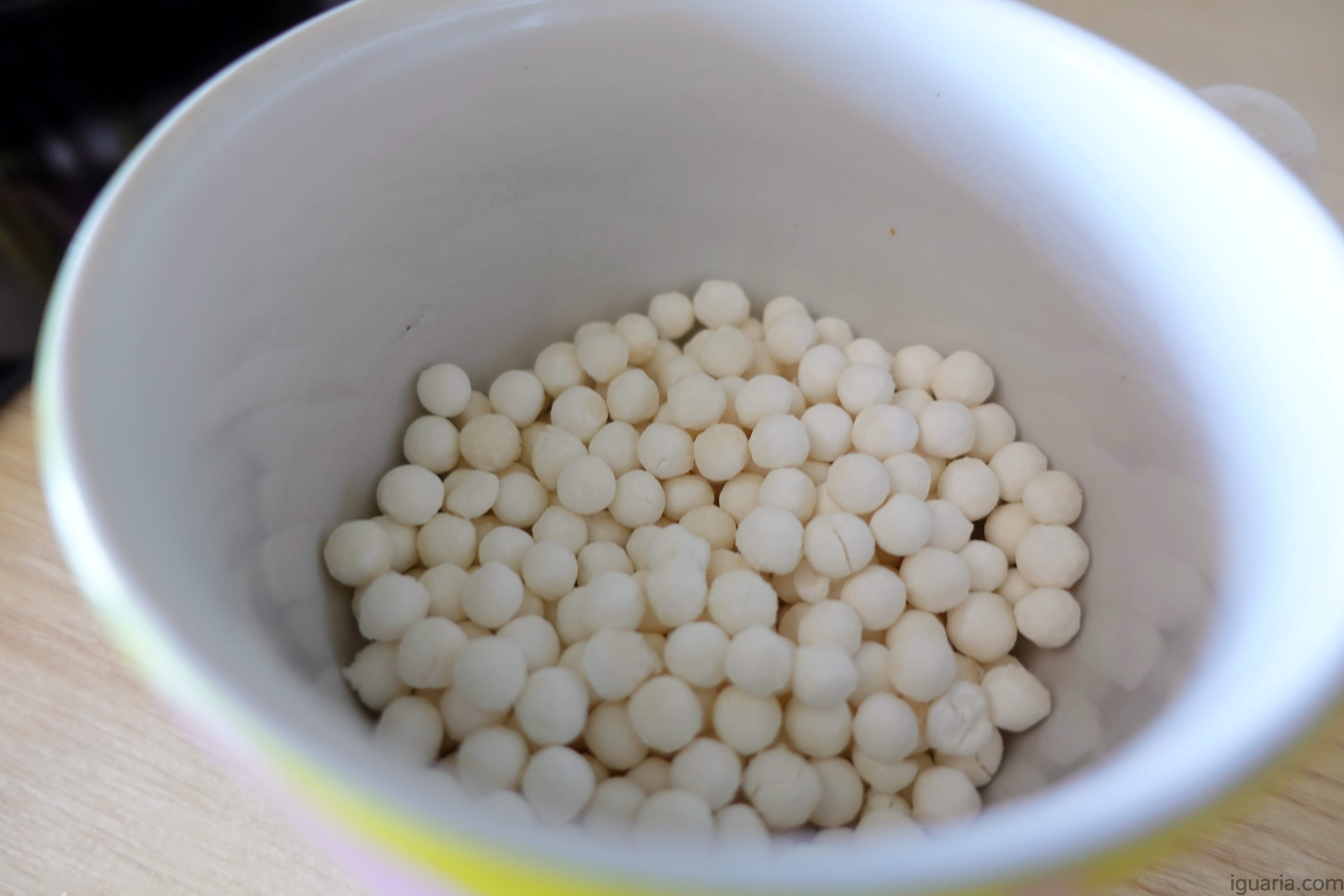 - Num tacho maior com 1.5 litros de água, leva este ao lume alto até começar a ferver, depois junta as pérolas de tapioca secas, espera até as pérolas começarem a flutuar na água.