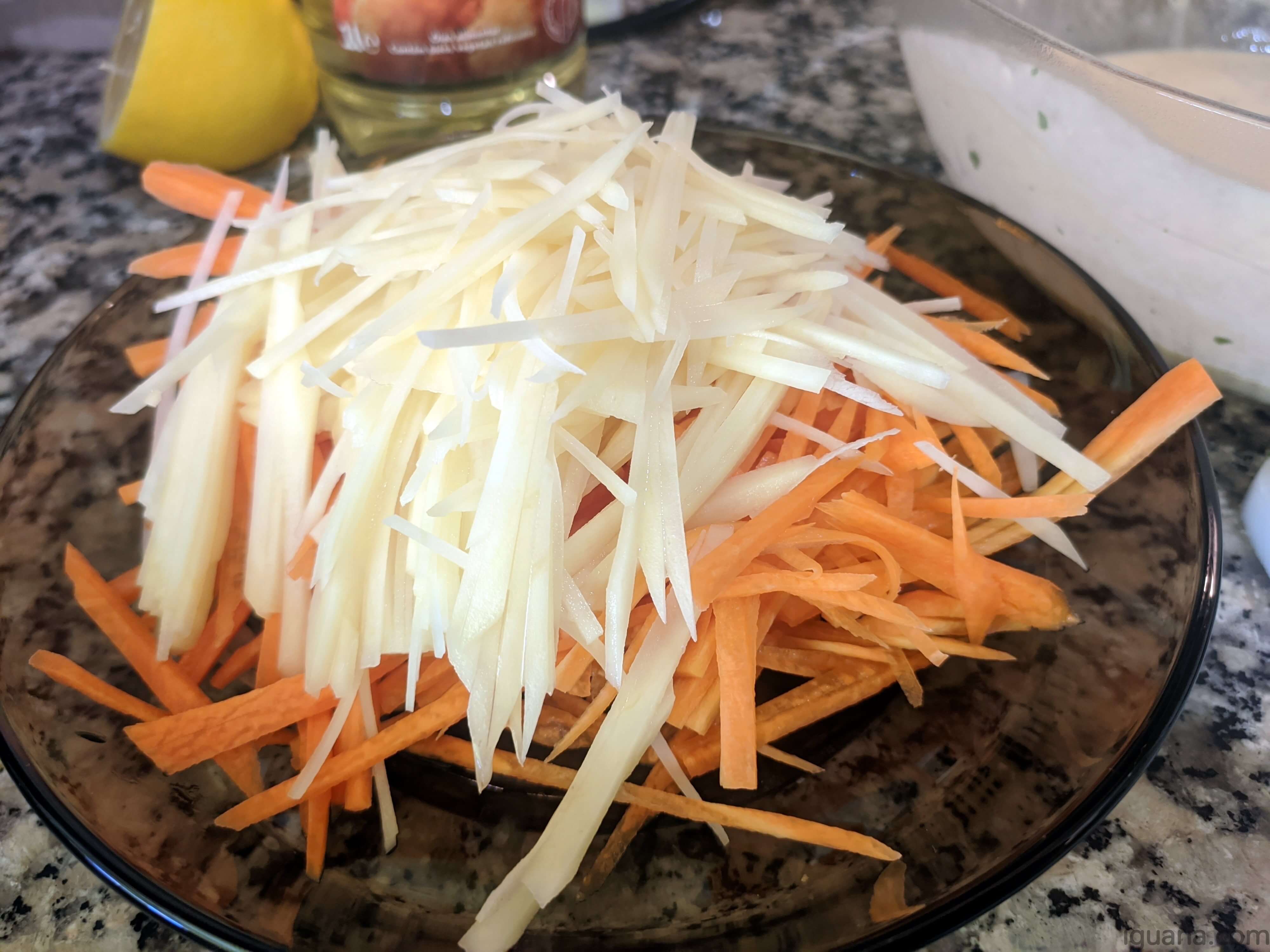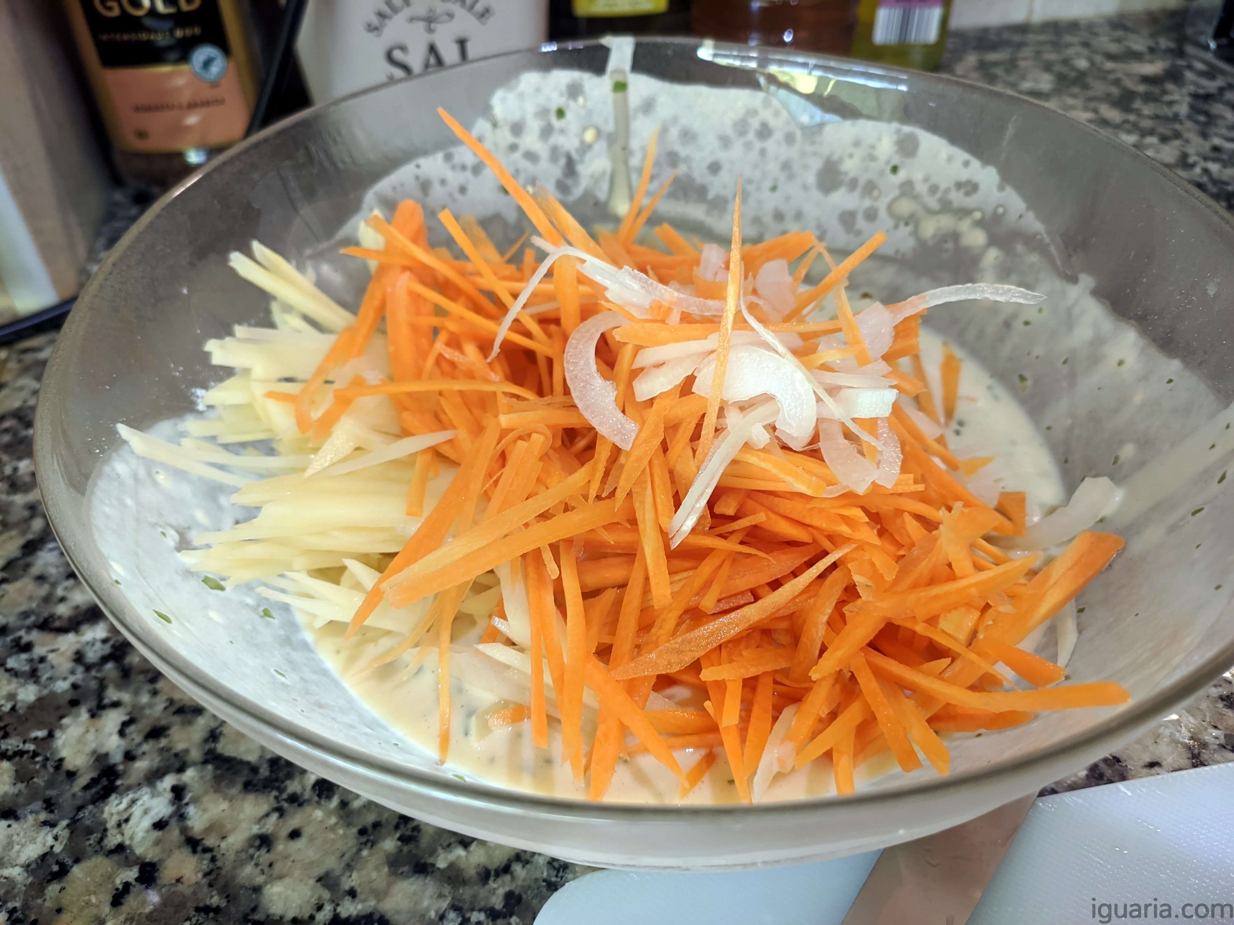 - Junta as batatas e cenouras em juliana ao polme e mistura.