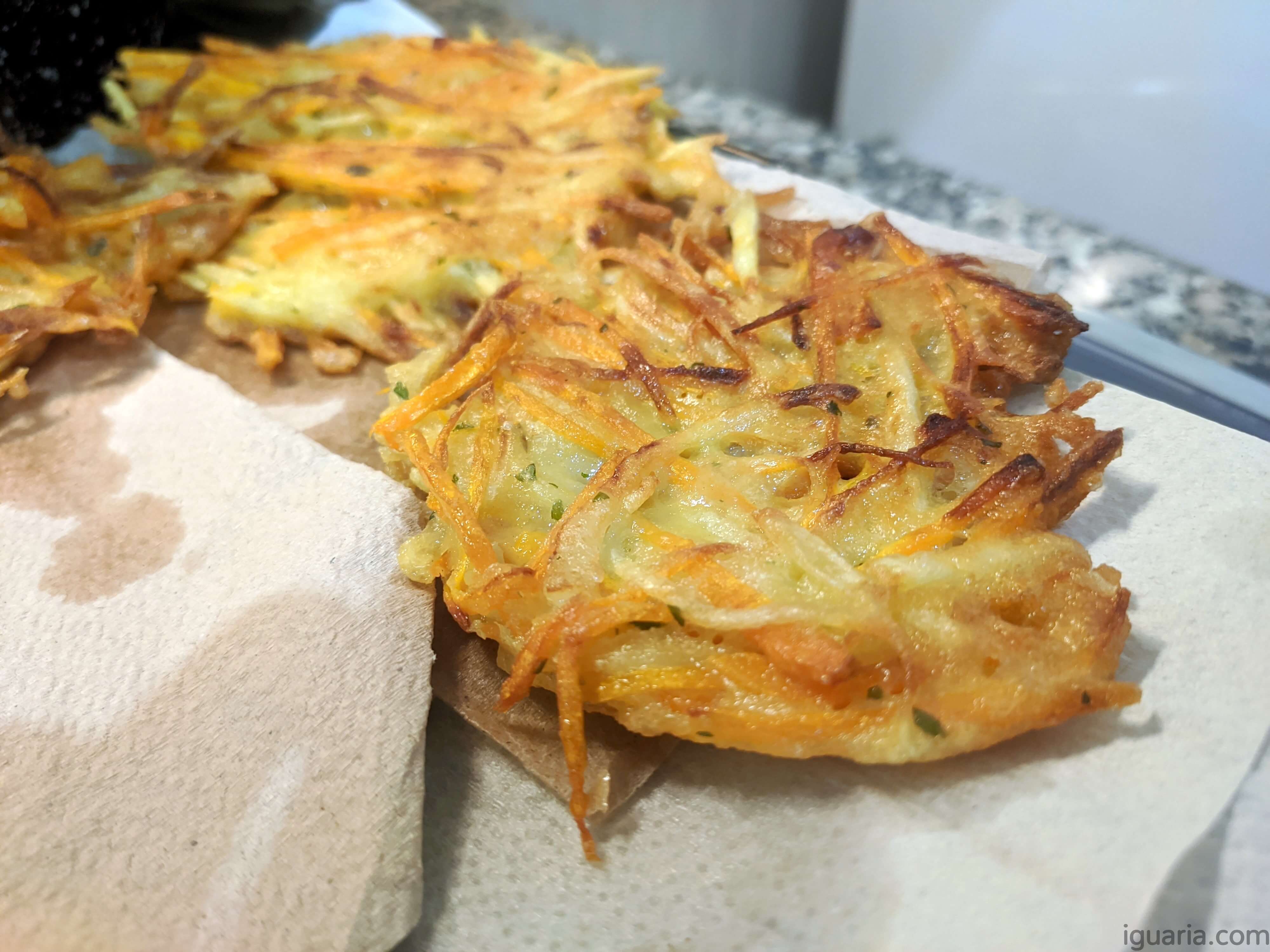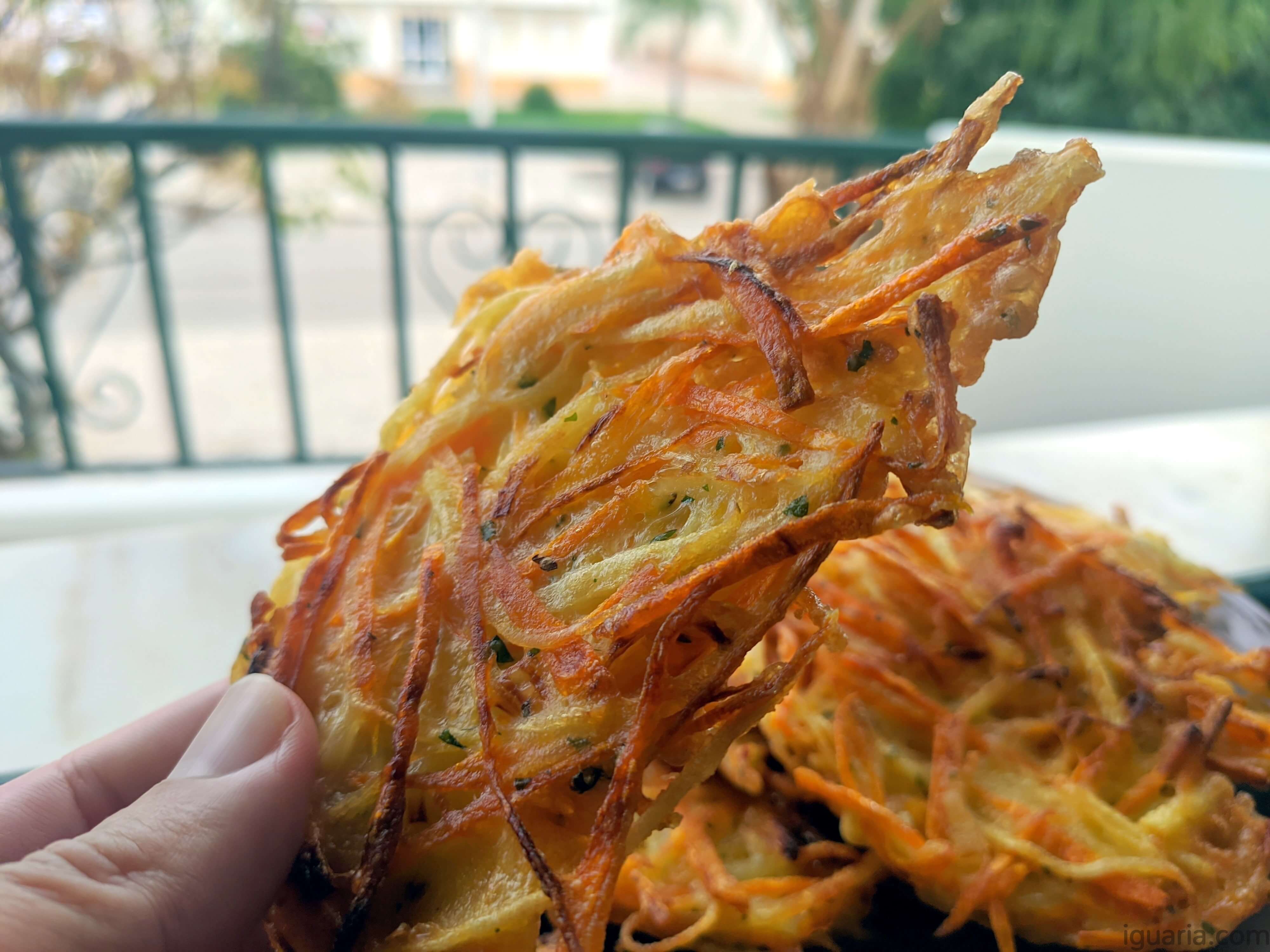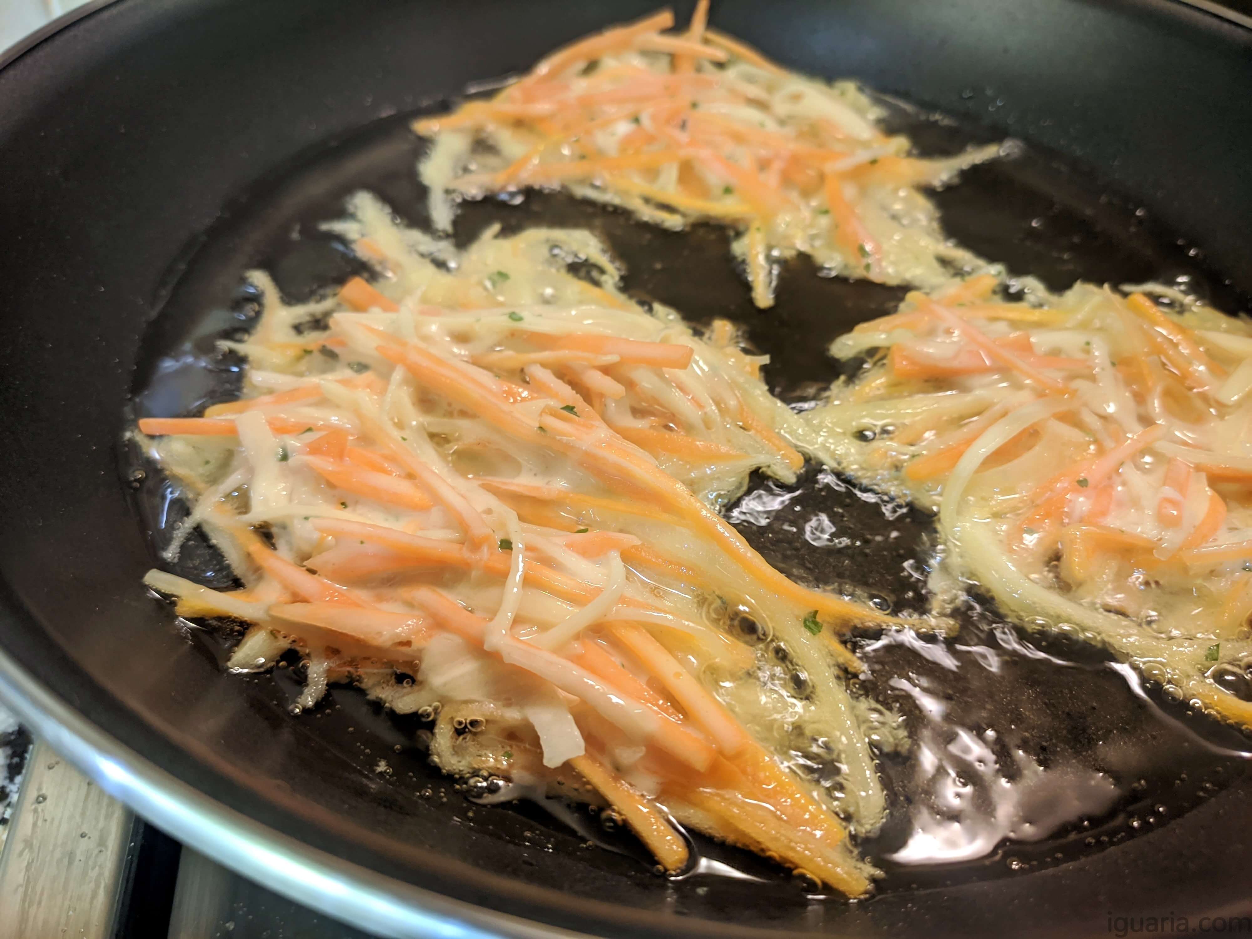 Neste caso eu fiz uns acima de tudo com batata e cenoura, acho que ambos combinam bem e fritam ainda melhor, tudo cortado numa juliana fina para cozinharem rapidamente, perfeitos como acompanhamento ou como um belo petisco, vamos então a receita!
