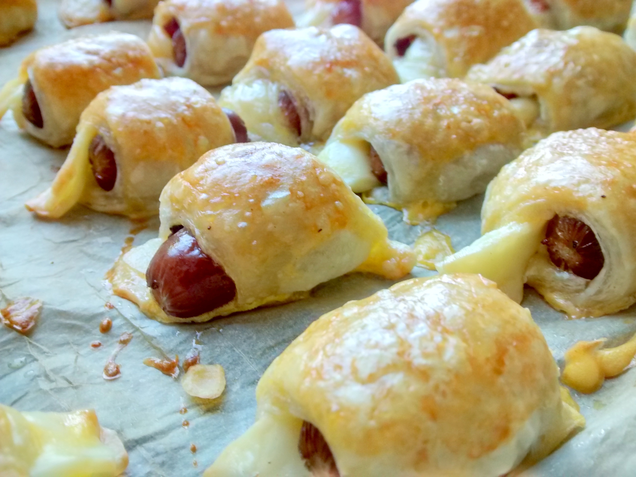 Estes folhaditos uma variação dos chamados pigs in blankets (folhados de salsicha), neste caso pus queijo e bacon em cada um para ser um pouco mais especial!