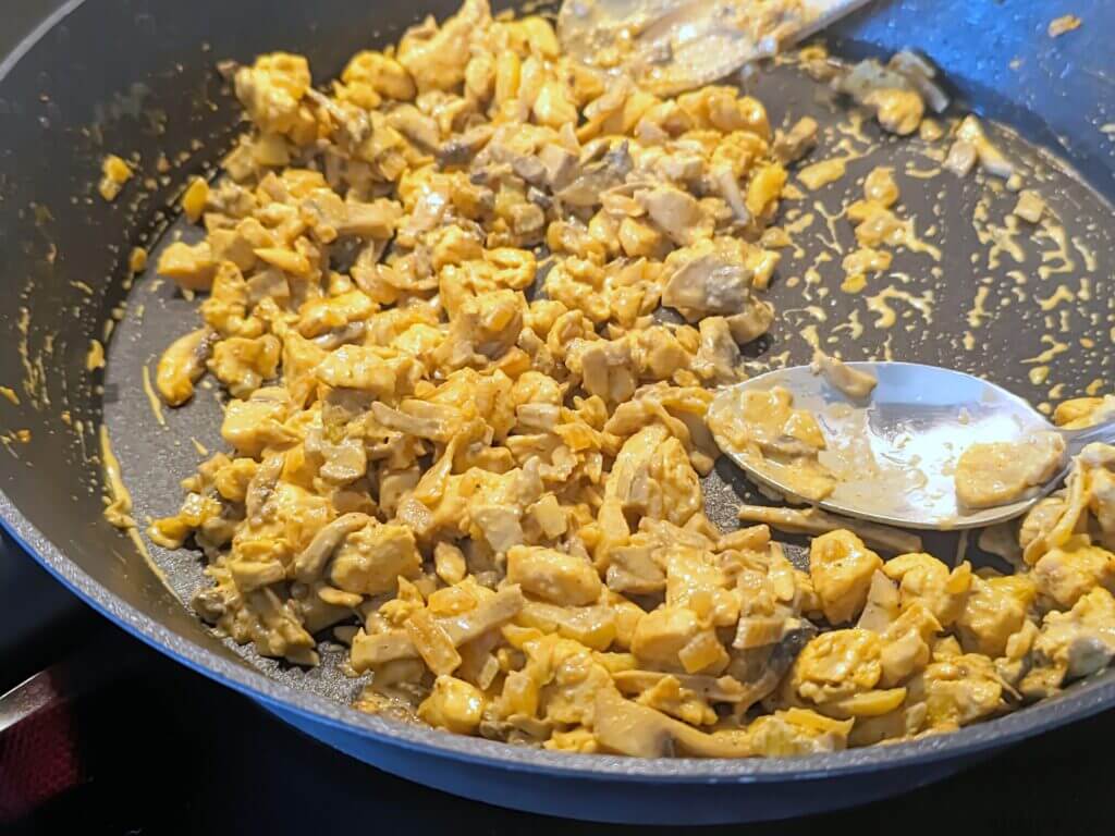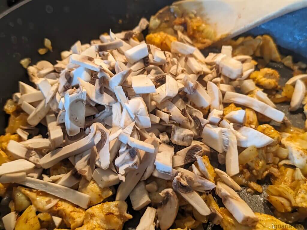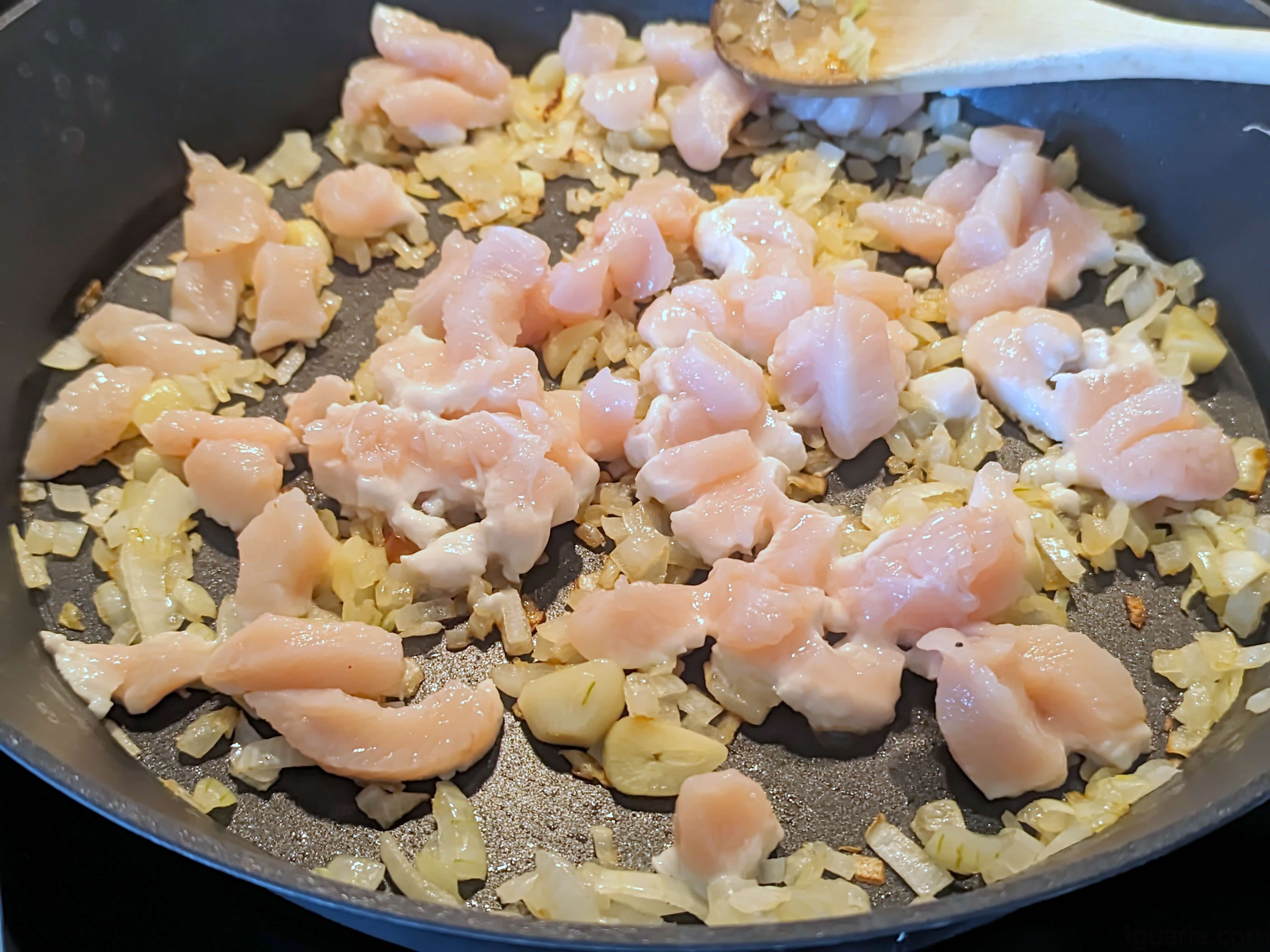 - Quando a cebola estiver bem dourada, junta o frango cortado em cubos pequenos, tempera com paprika, açafrão-da-índia, caril em pó, pimenta caiena, pimenta e sal, mistura e deixa o frango cozinhar um pouco (tu queres o frango quase cozinhado, mas não cozinhado por completo).