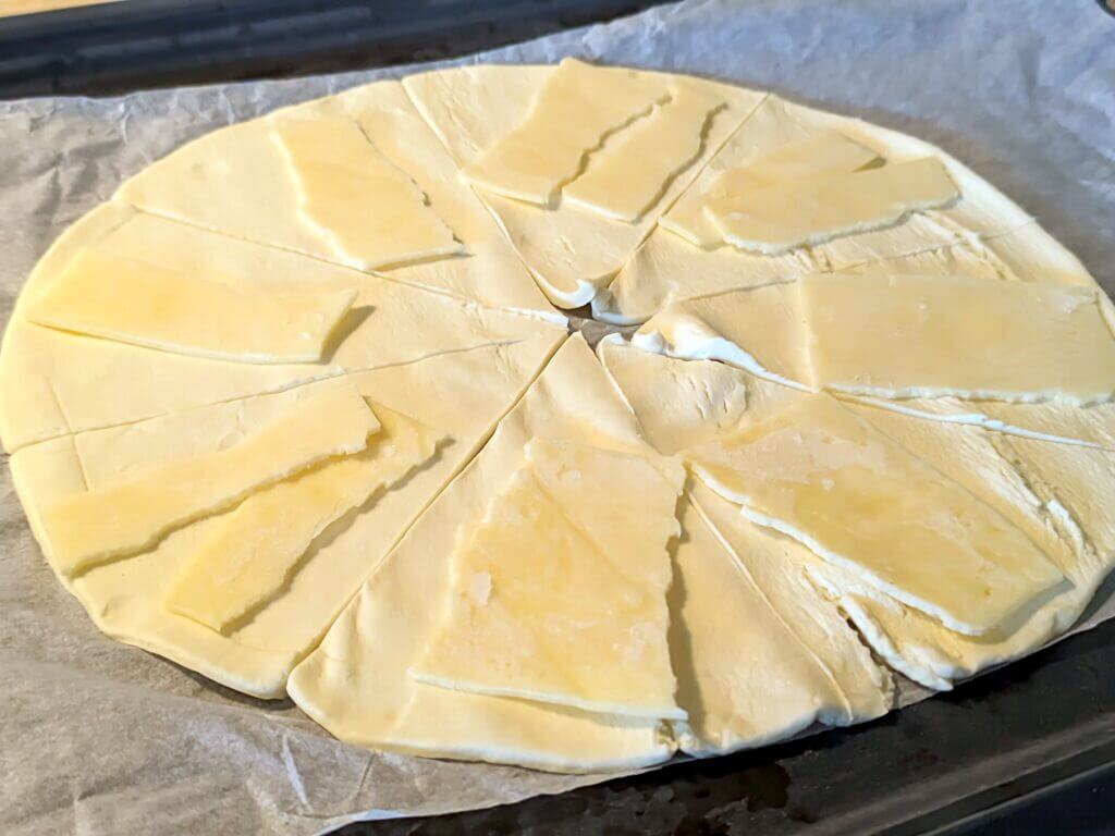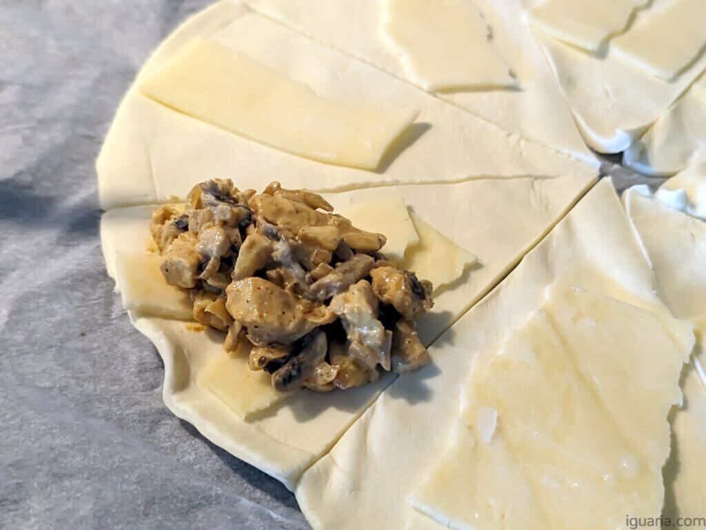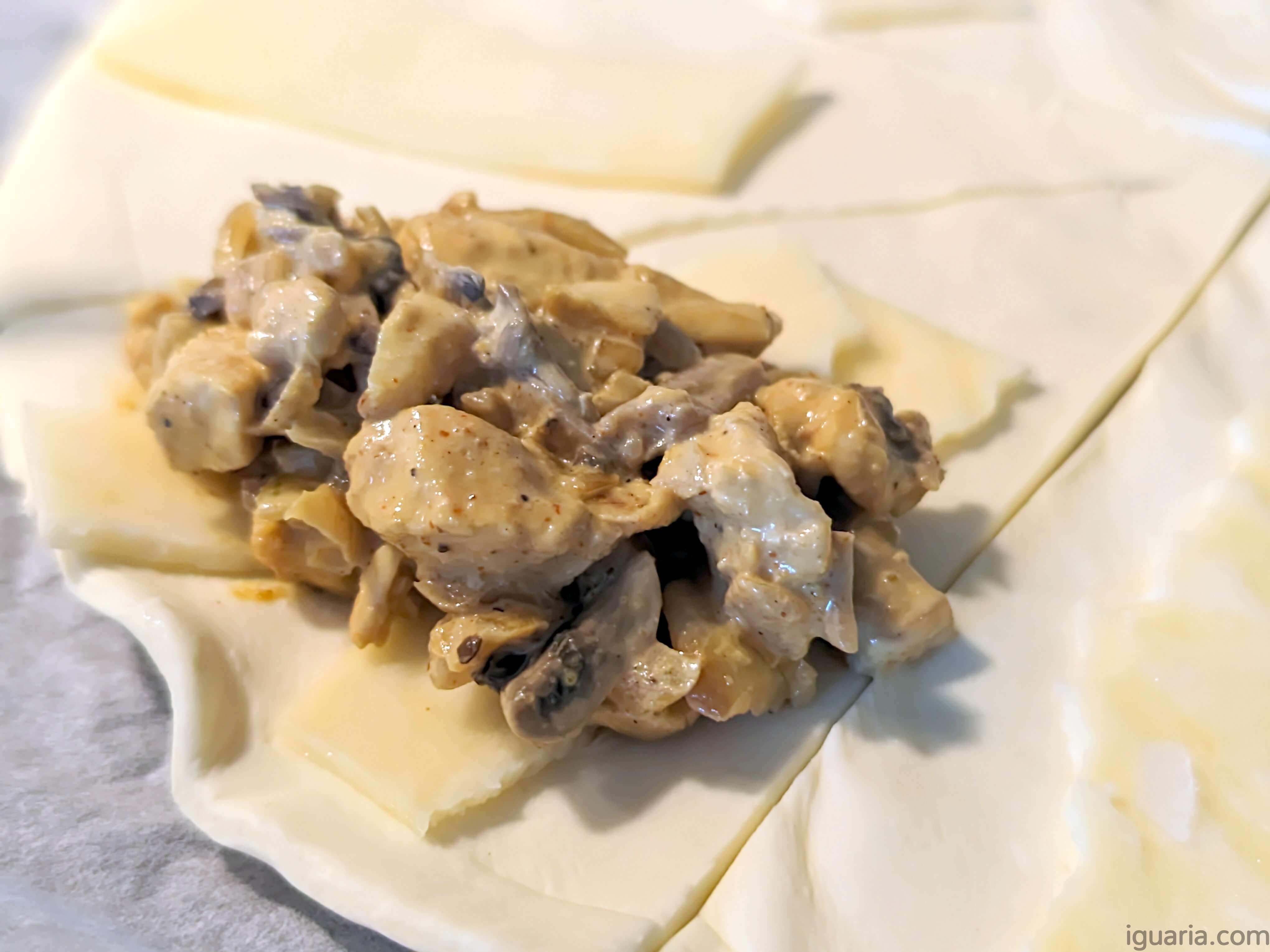 - Retira a massa do frigorifico e corta esta em 8 partes, pôe em cada fatia de massa meia fatia de queijo, depois deita uma porção do recheio e enrola, dispõe no tabuleiro e repete para a restante massa.