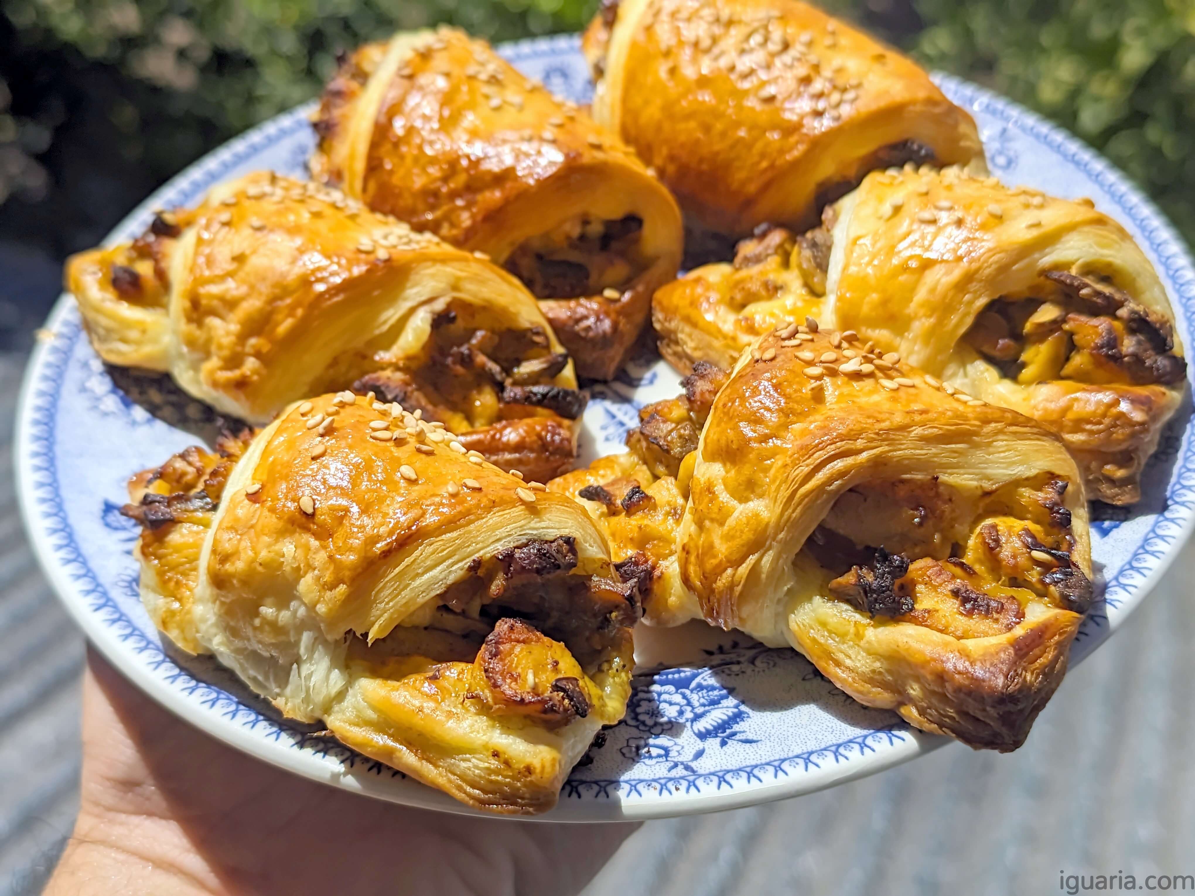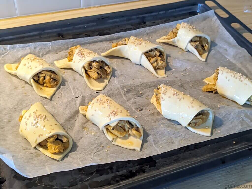 Eu adoro este género de folhados, de comer e fazer, são super simples de fazer e podes rechear com o que te apetecer, neste caso eu fui com um delicioso caril de frango com cogumelos, normalmente os recheios tendem a ser salsichas, queijo, fiambres, chouriços, mas não te precisas de limitar podes rechear com o que quiseres.