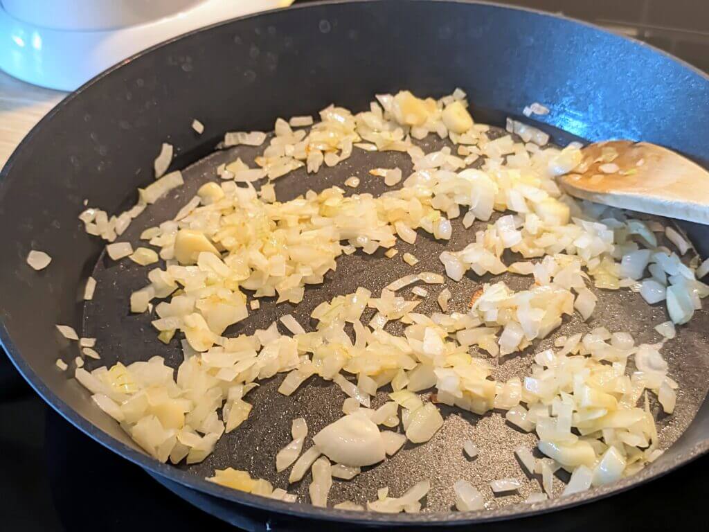 - Começa por preparar um refogado, numa frigideira em lume médio, com um fio de azeite junta a cebola e alhos picados, tempera com uma pitada de sal e deixa refogar até a cebola ficar bem caramelizada.