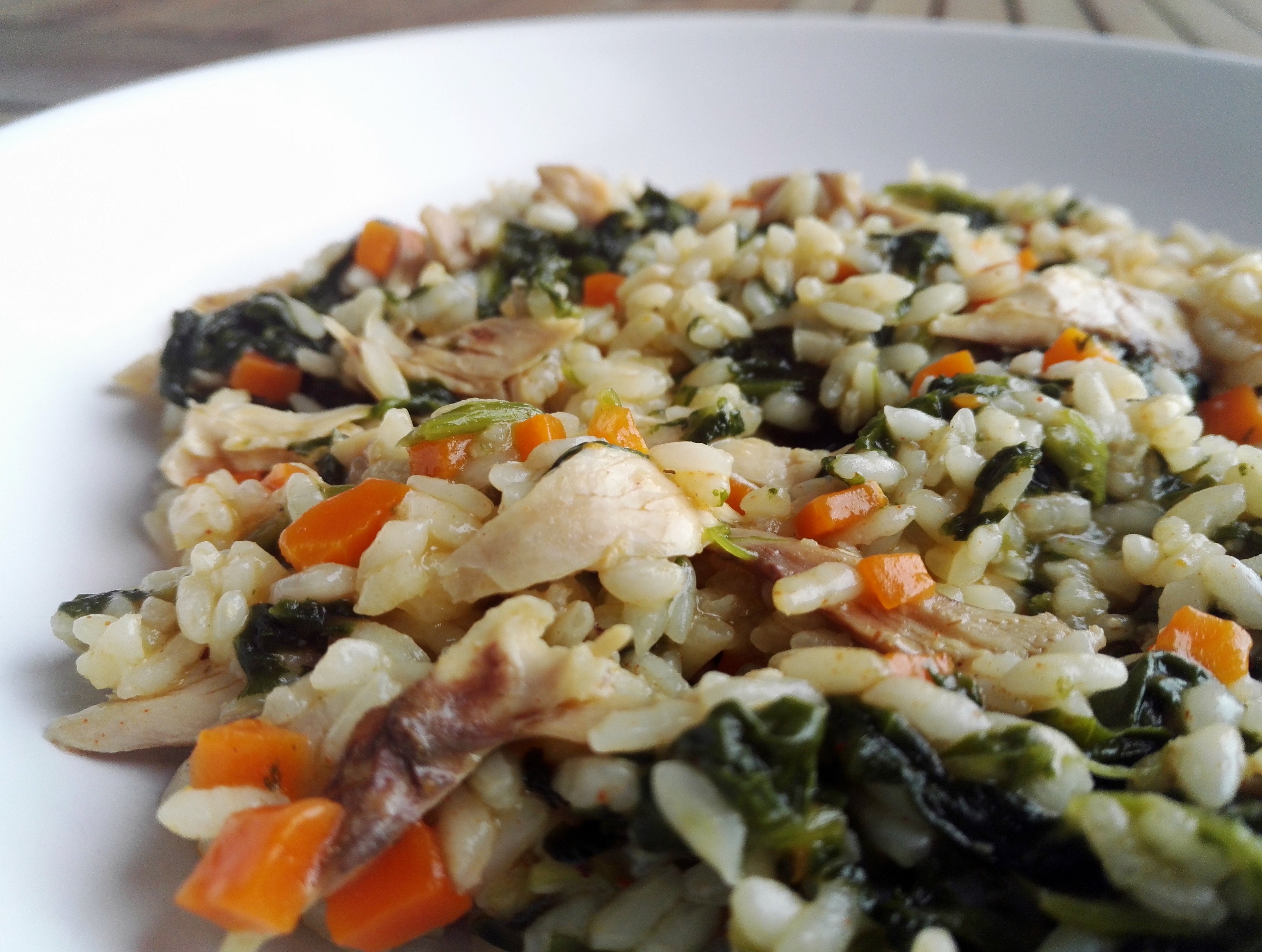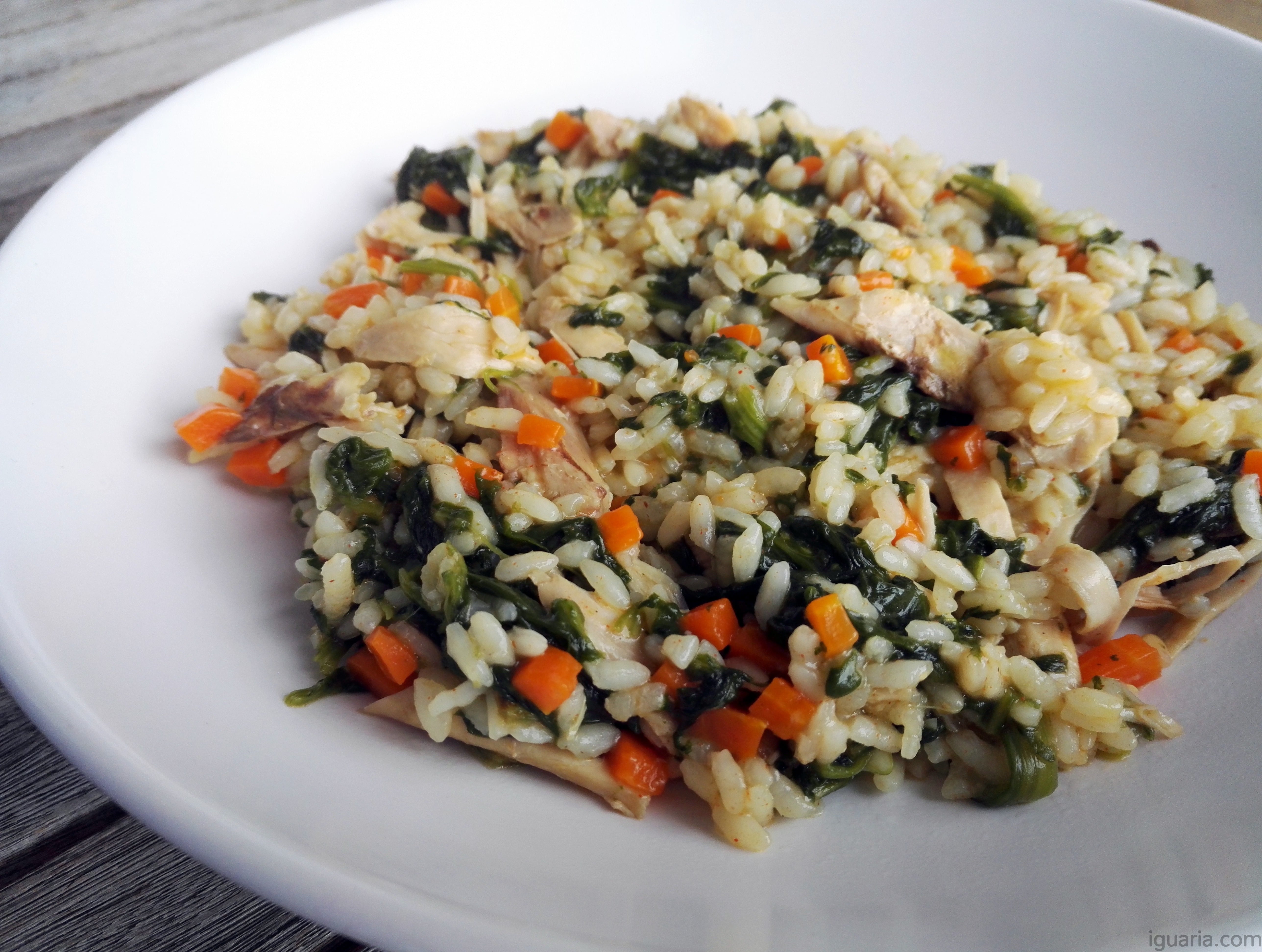 Receita bem catita de arroz de frango com espinafres.