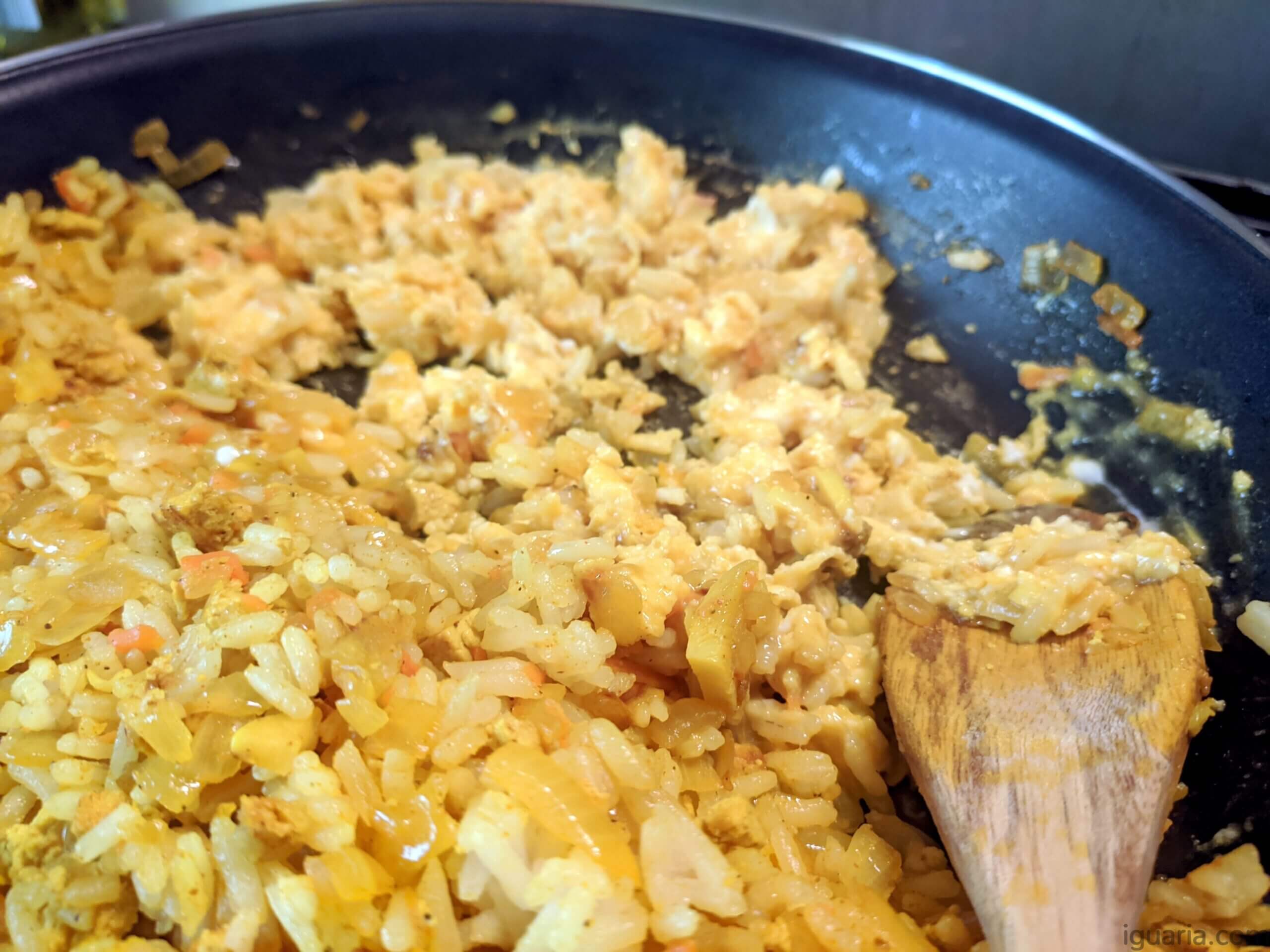 Neste caso fiz arroz aromatizado com cúrcuma (açafrão-da-india) e açafrão, dai a côr amarelada do arroz, mas para esta receita podes usar qualquer arroz já cozinhado e que tenha tempo para secar, aliás deixar no frigorifico (ou congelar se não fores usar no dia seguinte) é ideal, porque não só garantes que o arroz não se vai estragar ou contaminar, mas também o processo no frio vai secar um pouco mais o arroz o que não é agradável se queres comer o arroz mais tarde, mas é perfeito se queres fritar o arroz mais tarde!
