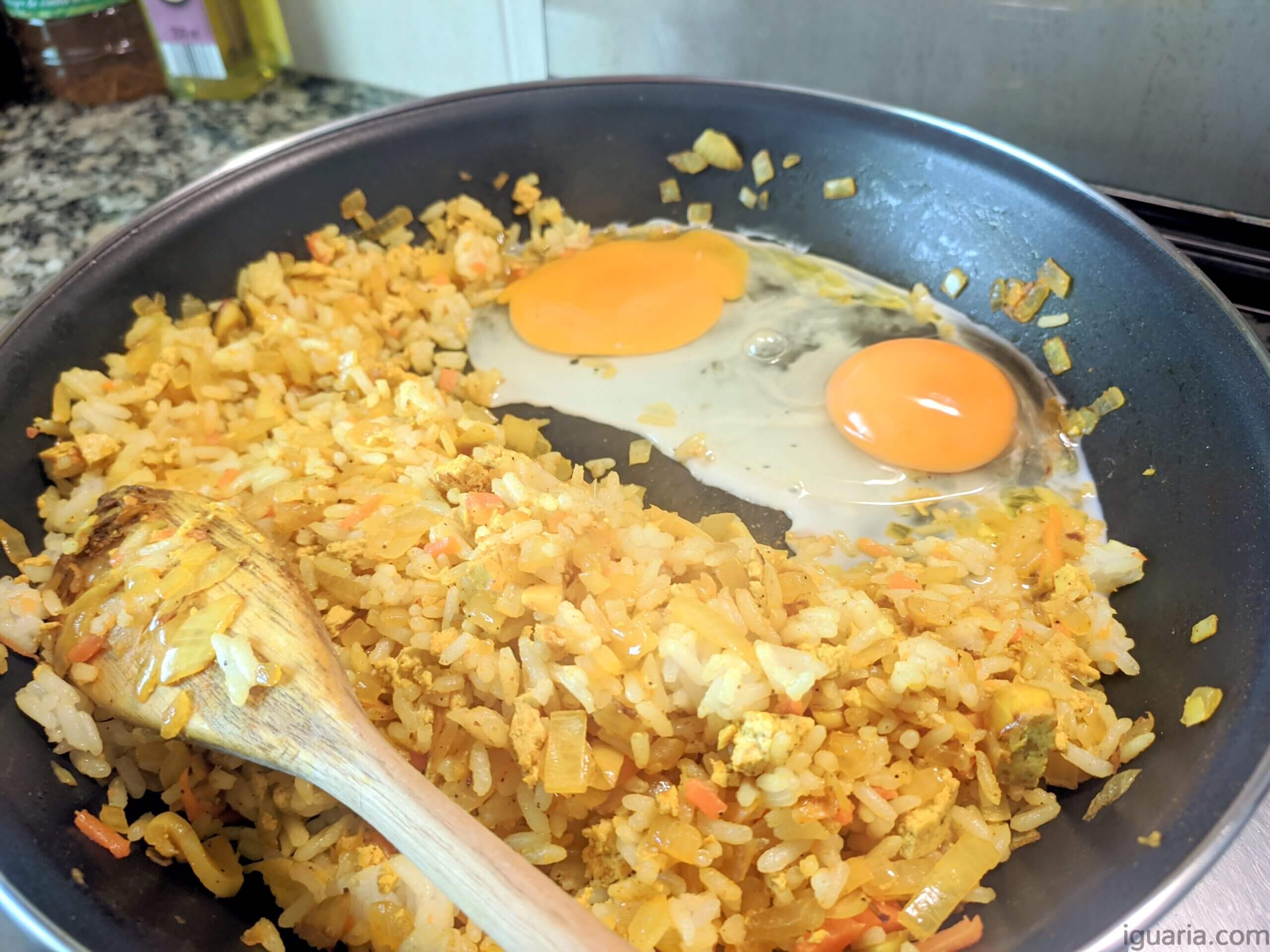 5. Empurra então o arroz para um lado adiciona mais outro fio de azeite no espaço aberto e junta dois ovos, tempera estes com sal e pimenta e mistura para fazer uns ovos mexidos bem esfarelados.