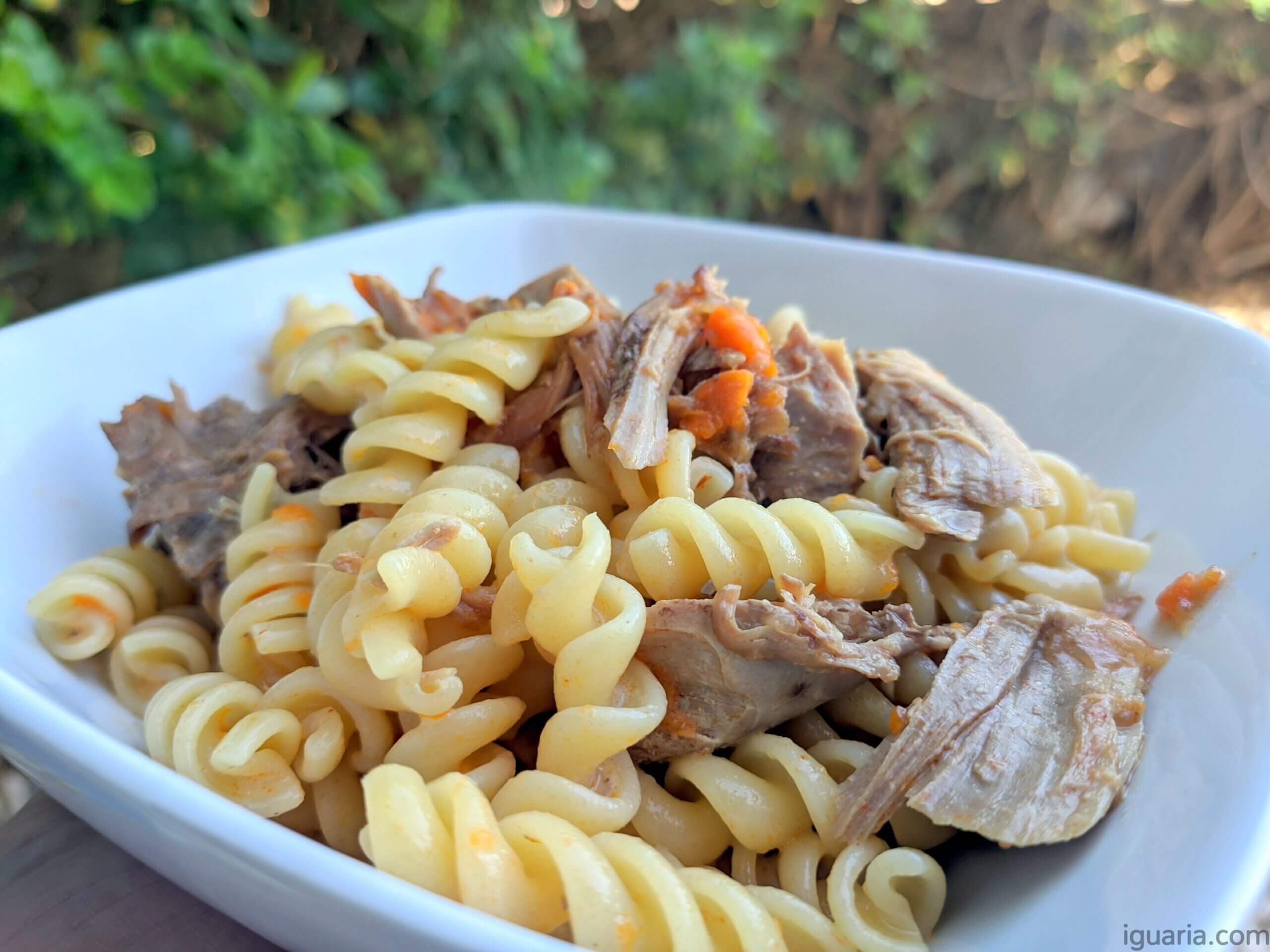 Esta receita é uma fantástica forma de aproveitar os restos das pernas de peru temperadas da panela de pressão. Quando estufas peru desta maneira, não só obténs uma carne incrivelmente tenra que se desfia sozinha, como também crias um molho delicioso e bem rústico que vai dar um sabor extraordinário à tua massa. É uma receita de aproveitamento que vale ouro!!!!! ;D