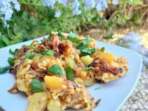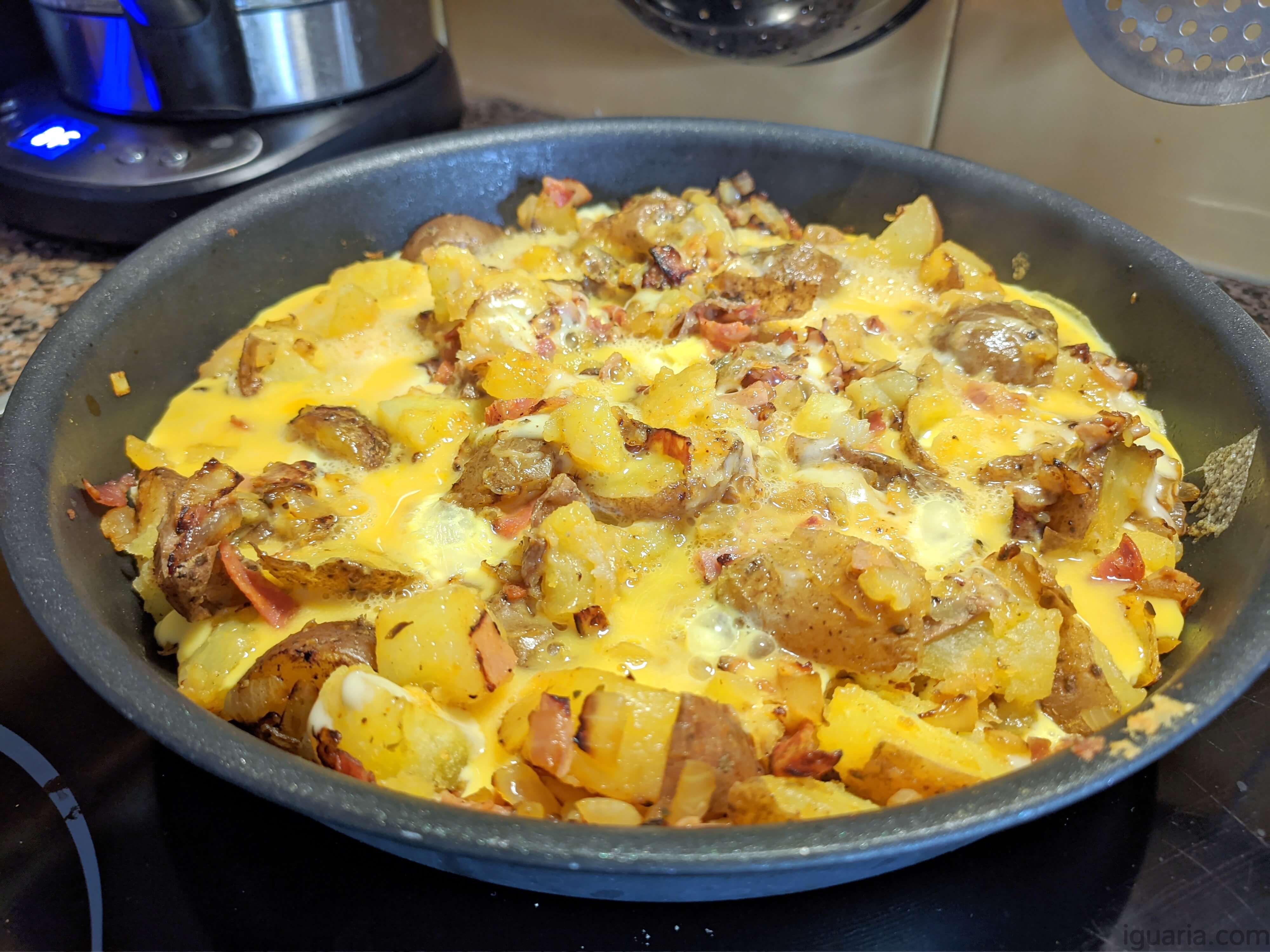 Hummmmm isto é o que acontece quando na tua mente tu queres fazer uma tortilha de batata espanhola e acabas com uma pilha mais similar a ovos mexidos, eu vou chamar de tortilha rústica! ;D Mas o que se perde no departamento visual, não se perdeu nada no sabor e o problema foi só que eu usei a minha frigideira mais velha, que precisa de ser bem oleada para este género de pratos, mas a receita é fantástica e se usares uma boa frigideira bem oledada hehehe vai correr tudo bem.