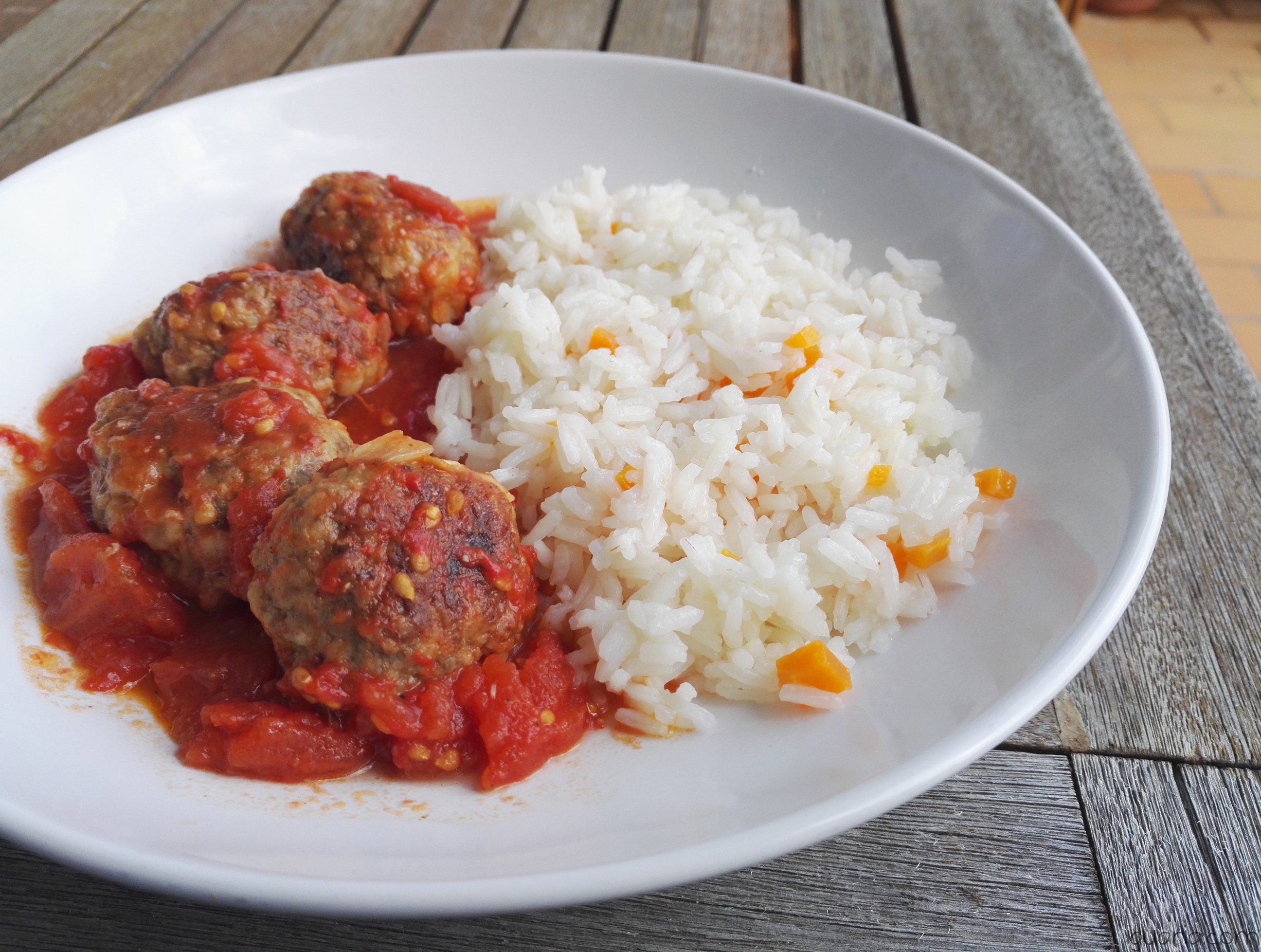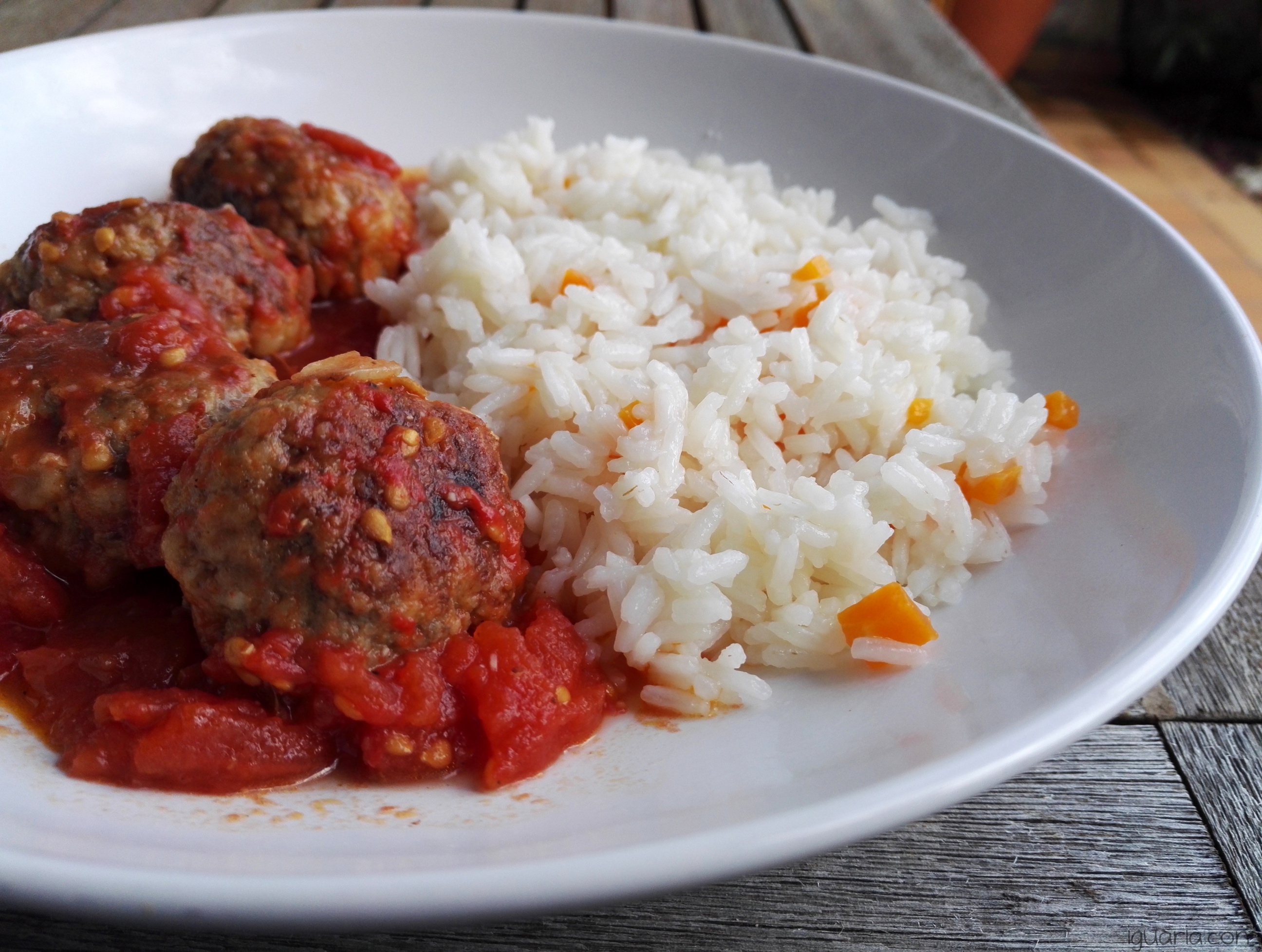 5. Enquanto as almôndegas cozinham prepara o arroz, pica uma cenoura junta o arroz e um fio de azeite, leva ao lume num pequeno tacho com 2 copos de água e uma pitada de sal, quando a água começar a ferver, tapa o tacho e baixa o lume e espera uns 10 minutos até o arroz estar cozido.