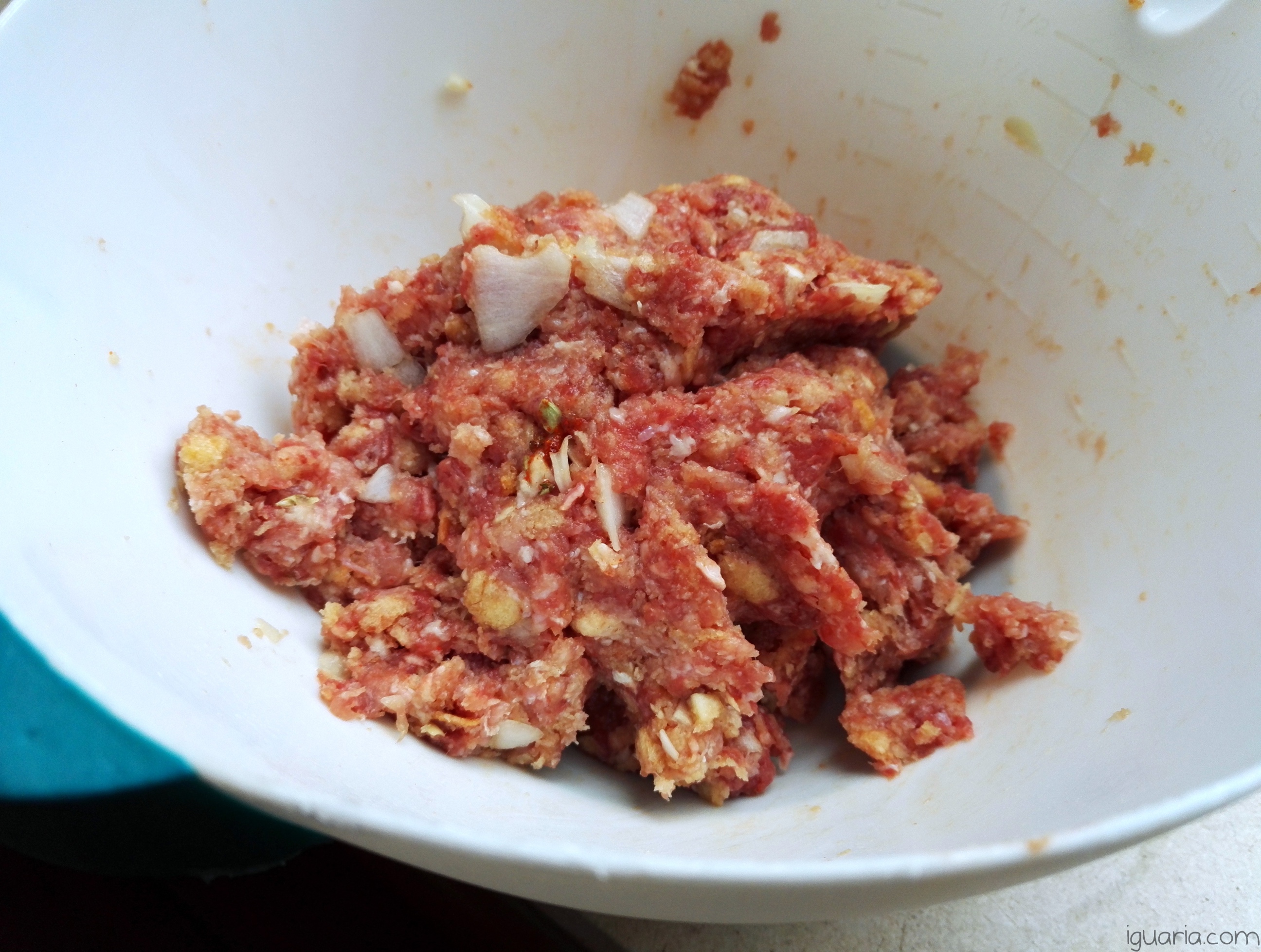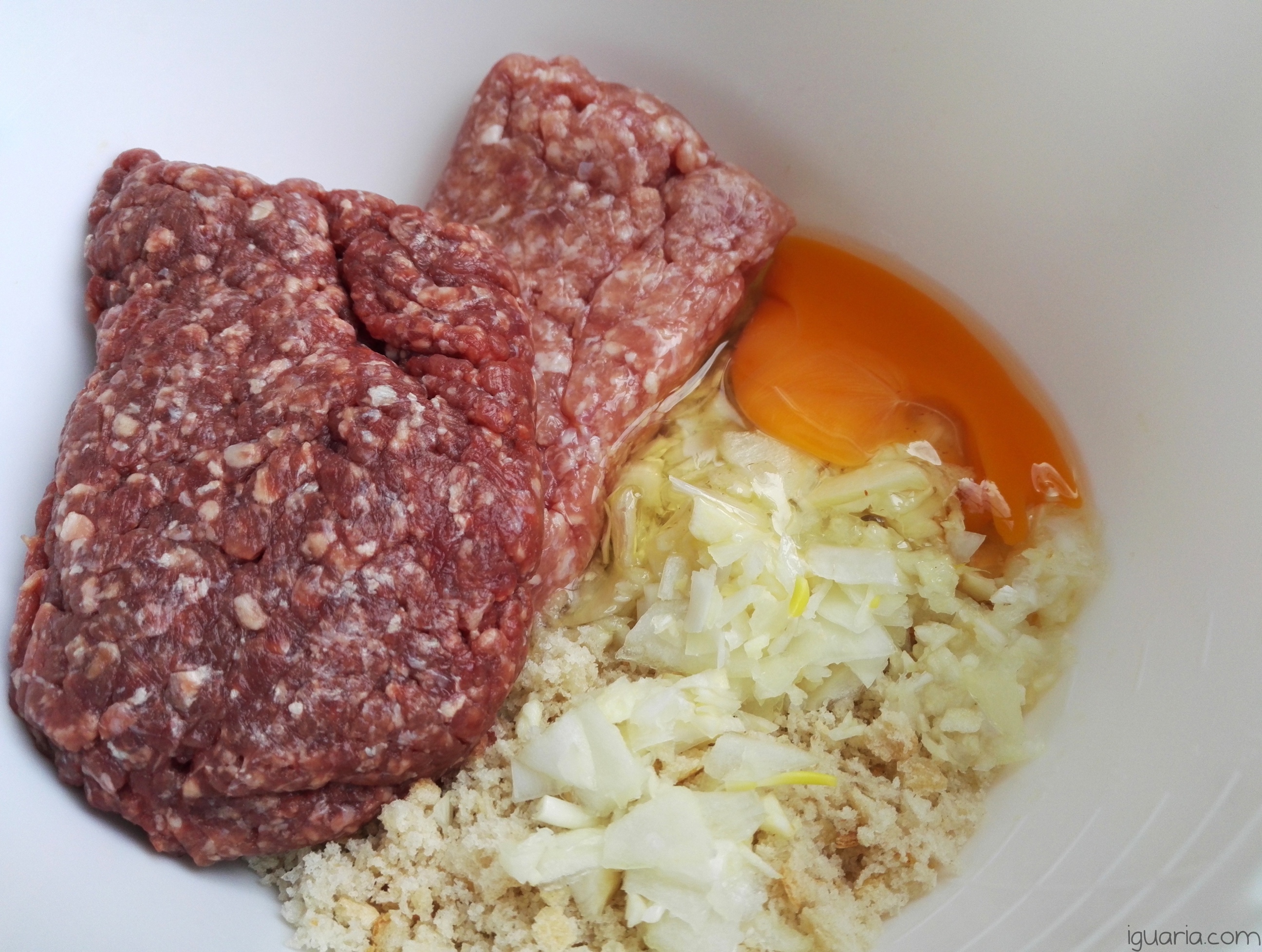 1. Começa por juntar as carnes de vaca e porco, com 1 pequena cebola picada, 1 dente de alho picado, 1 ovo, 50gr de pão ralado e uma pitada de sal e pimenta.