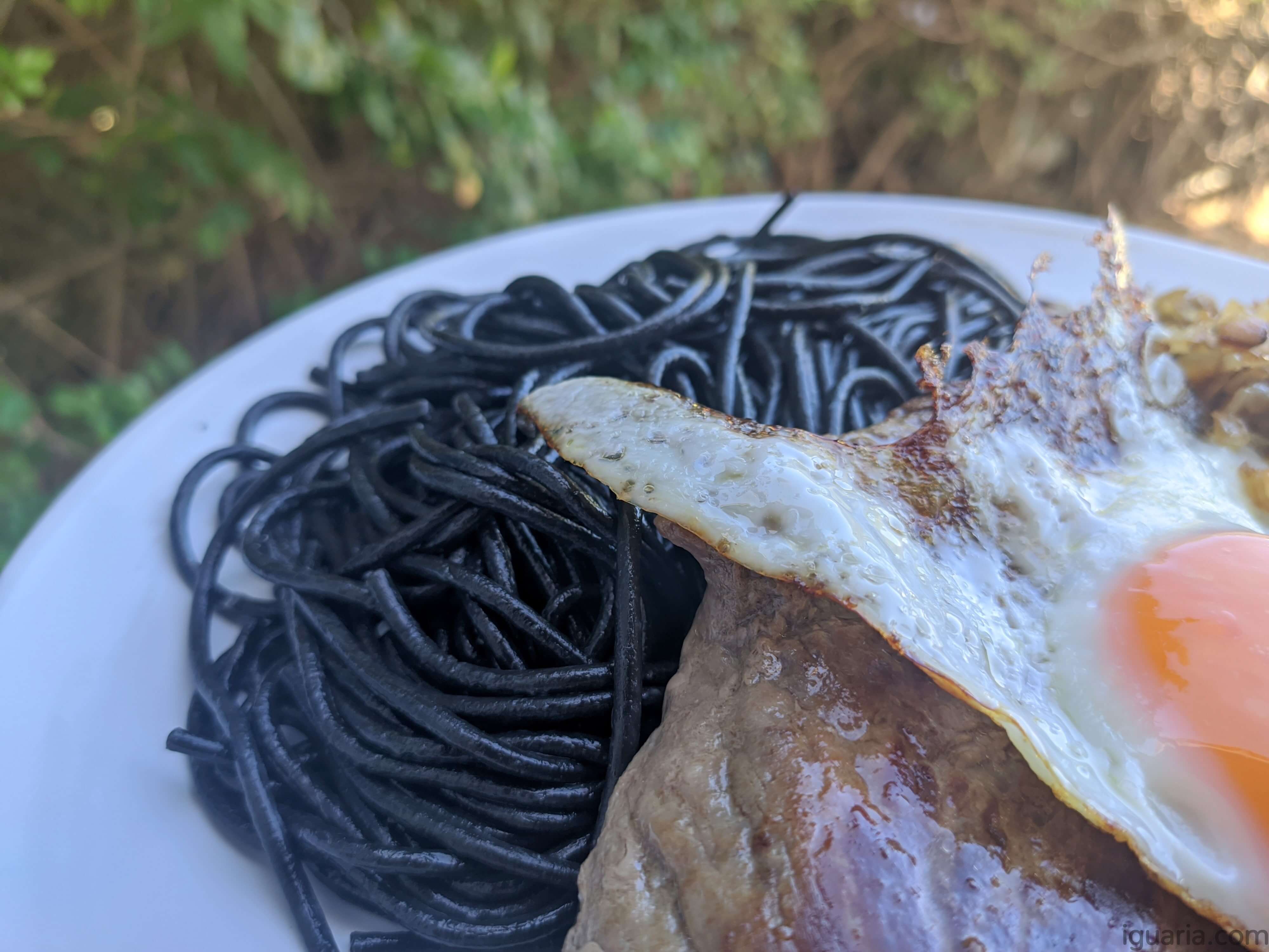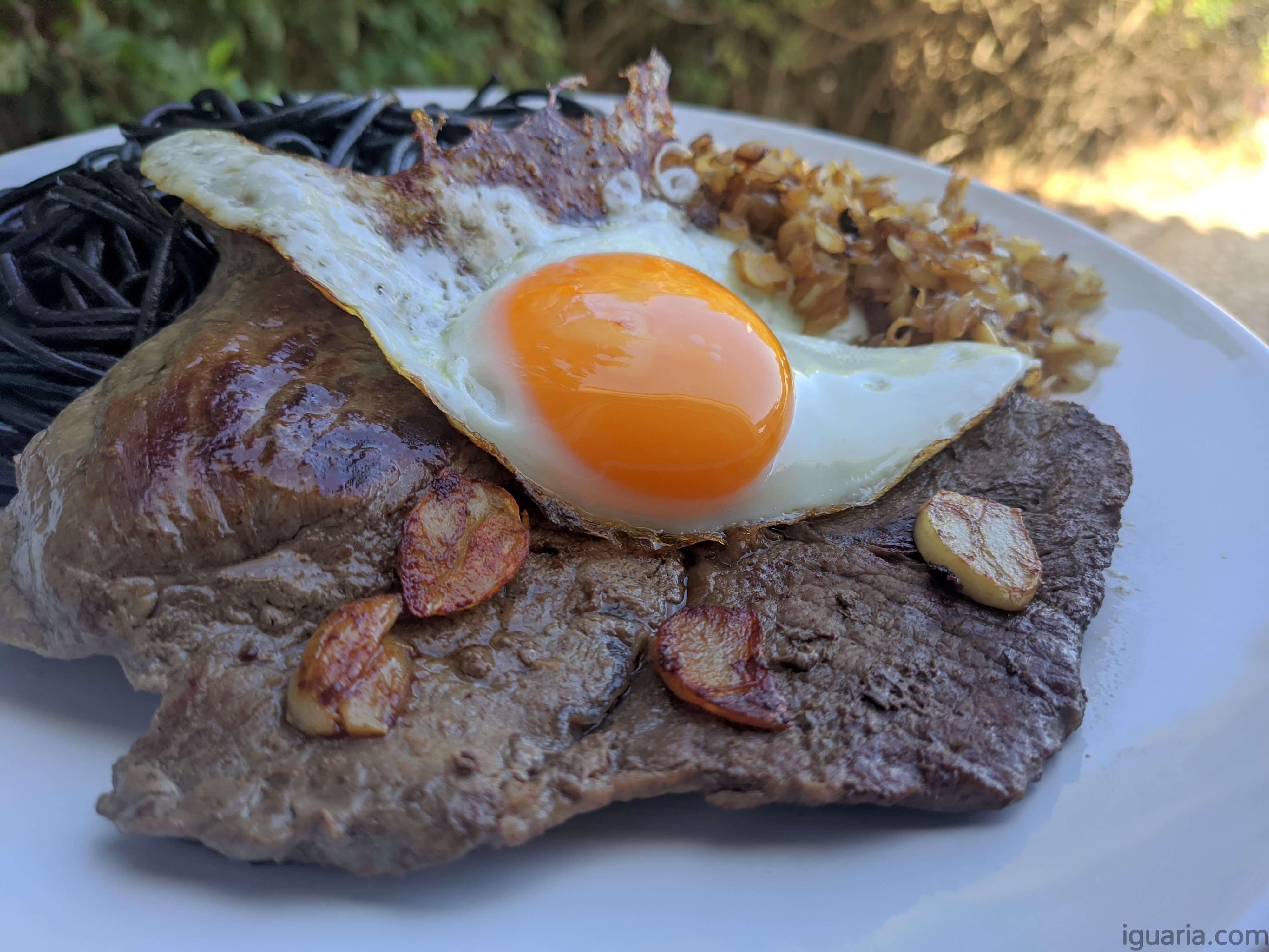 Receita bem simples e clássica de bife de novilho com alho, ovo a cavalo e esparguete preto, ok esta receita não é nada clássica heheheh.