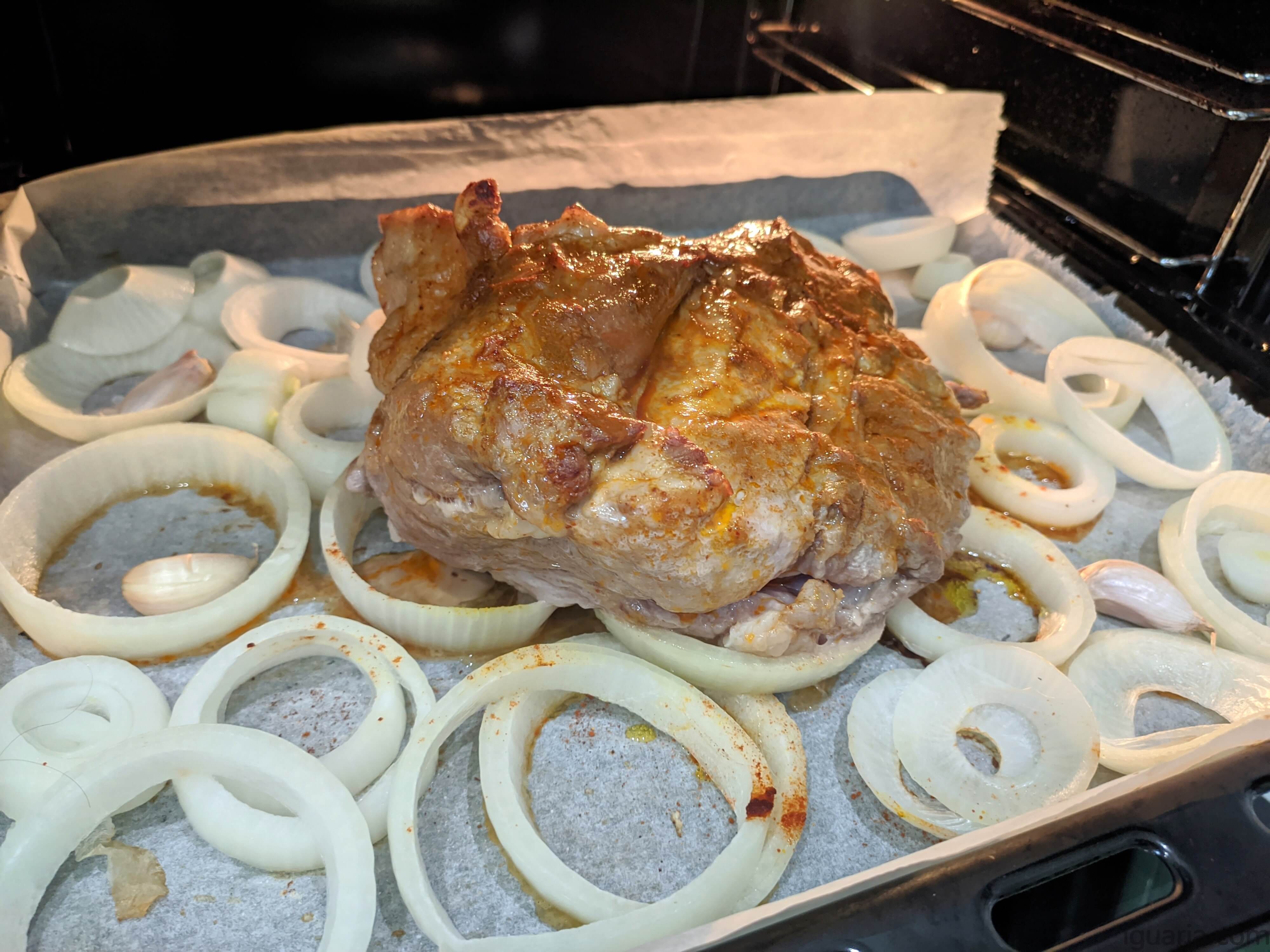 Um cachaço de porco, devidamente temperado com massa de pimentão e paprika fumada, assado até à perfeição. Acompanhado por batatinhas assadas, perfeito para uma refeição Natalícia mais em conta.