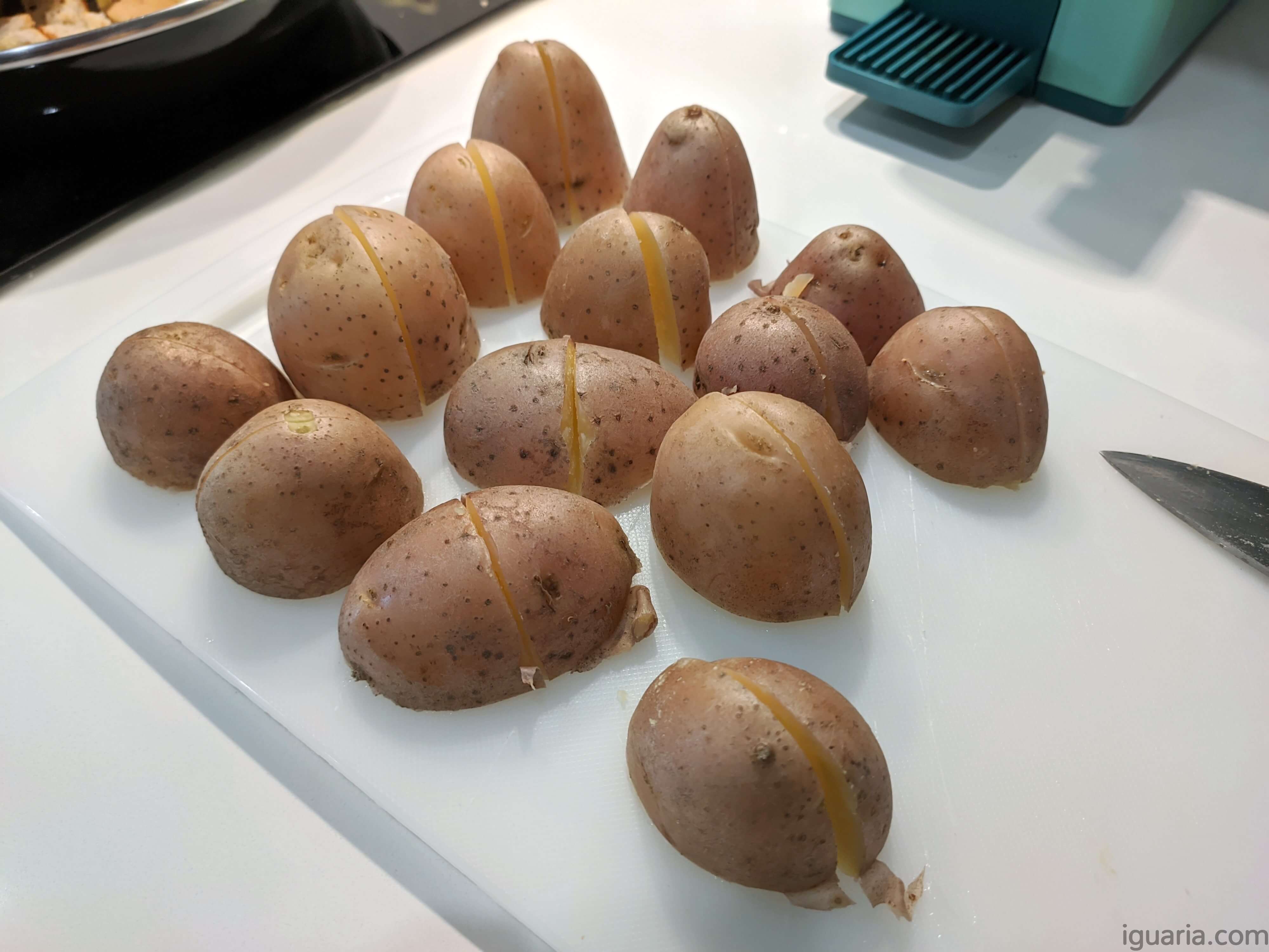 - Lava as batatas bem e leva estas a uma panela com uma pitada de sal, deixa cozer até as batatas ficarem tenras (espeta com um garfo se não sentires resistência, então as batatas estão cozidas).