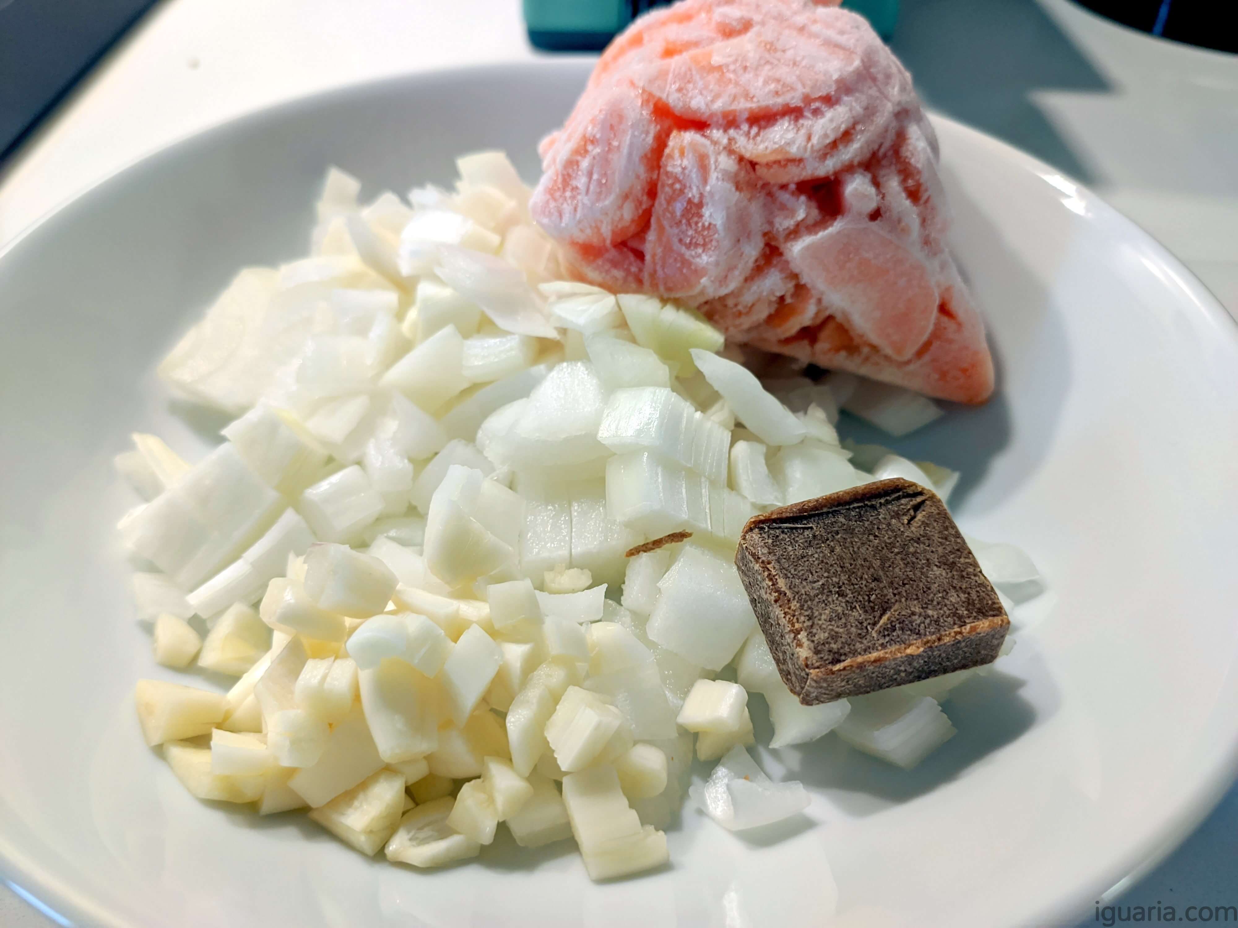 - Num pequeno tacho começa com um refogado, junta a cebola, alho e cenoura, tudo picado, com um fio de azeite.