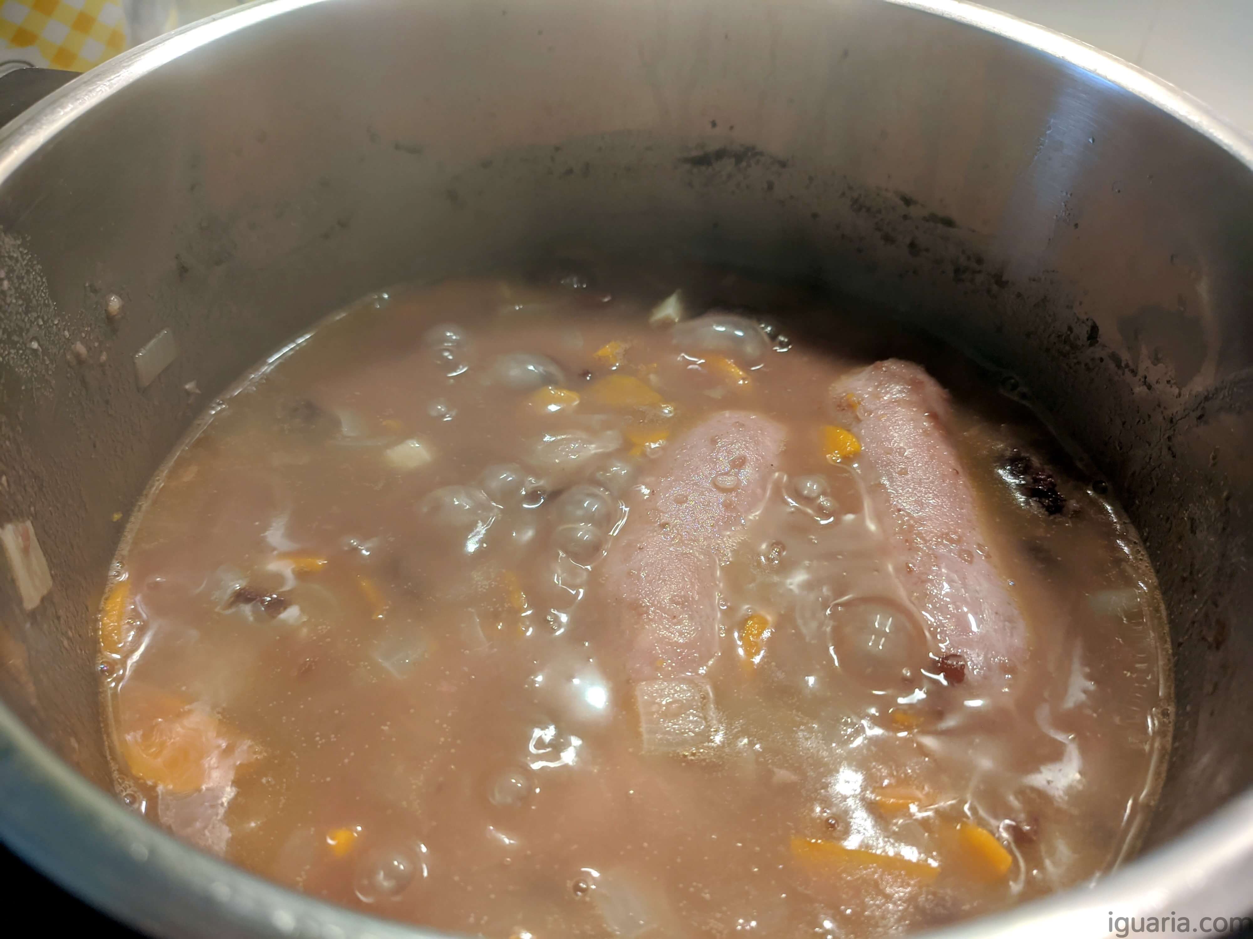 - Quando cebola estiver bem dourada, junta o feijão escorrido e cobre de água, tempera com o caldo de carne e folha de louro, deixa a cozer em lume médio.