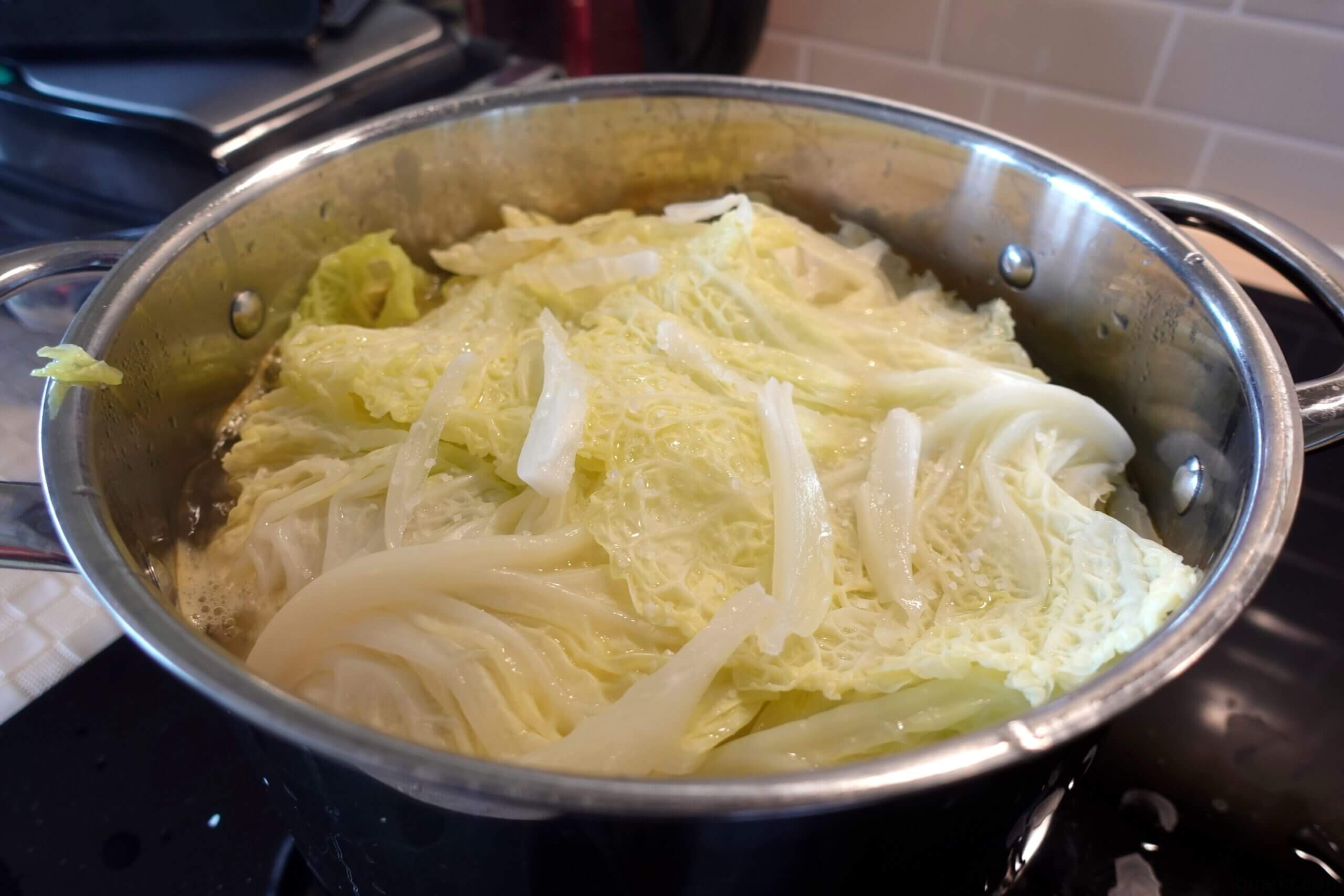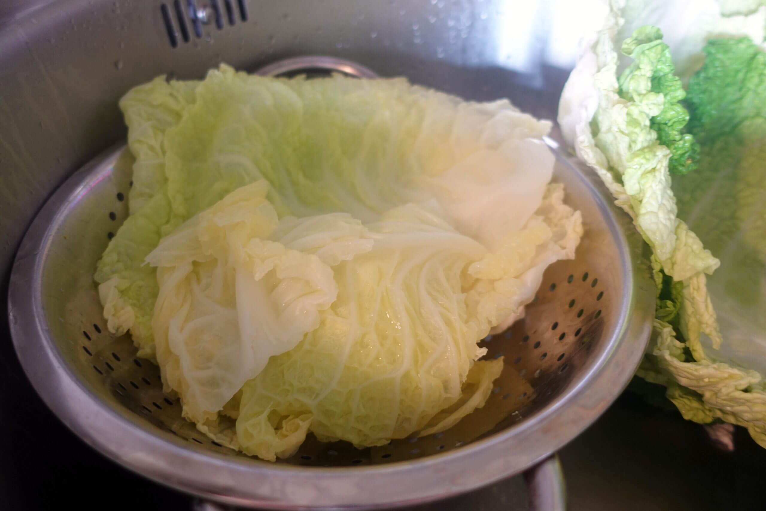 - Quando a água começar a ferver adiciona as folhas de couve, provavelmente não vais conseguir pôr todas, não têm problema, faz umas quantas de cada vez, cozinha estas por uns 5 minutos e depois retira da água e adiciona mais couves até escaldares todas as folhas, deixa estas a escorrer e arrefecer um pouco.