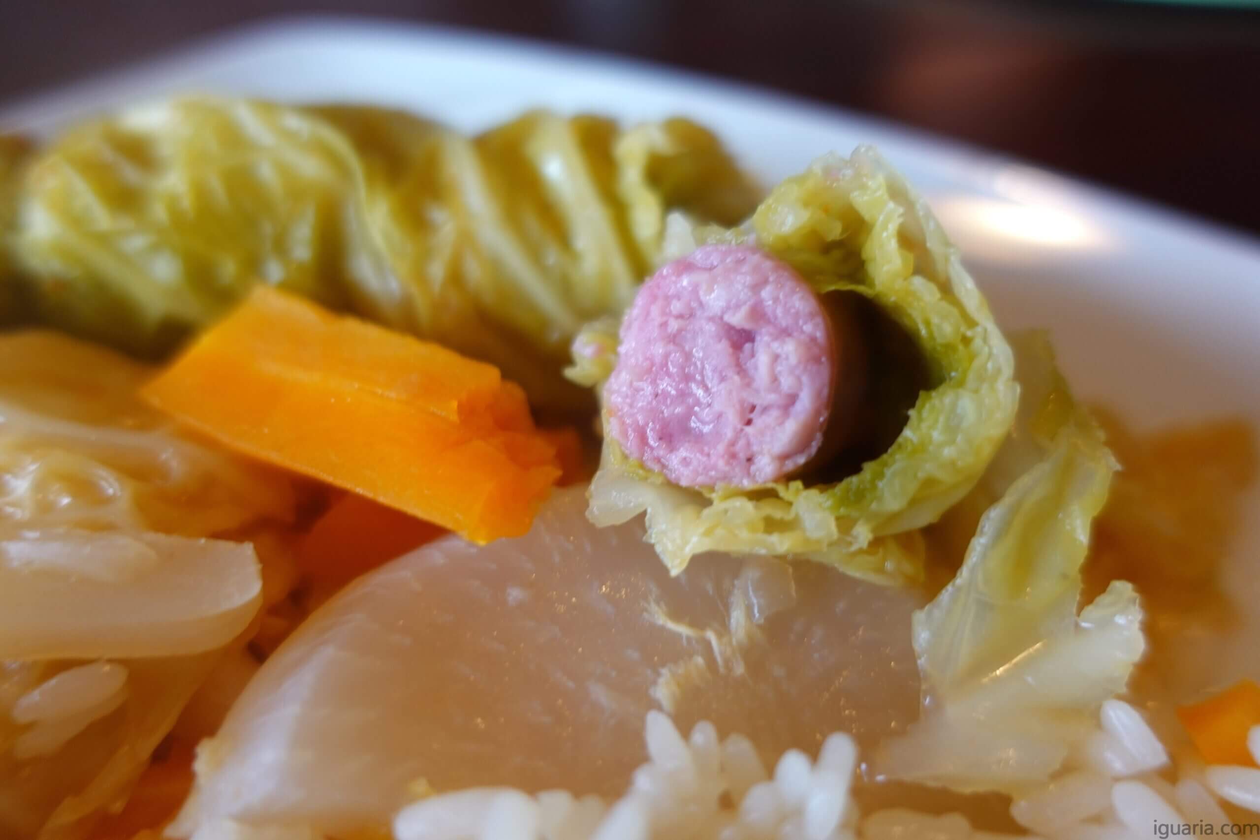 Aqui pelo Iguaria temos várias versões desta receita, é super simples com inspiração do Leste da Europa, basicamente é um cozido de salsichas frescas, couves e mais uns legumes, não têm absolutamente nada de complicado, só a apresentação é que demora um pouco porque o habitual é enrolar as salsichas nas folhas de couve lombarda, isso não só dá um sabor fantástico ás coves mas torna estas uma espécie embrulho com um recheio de salsichas.