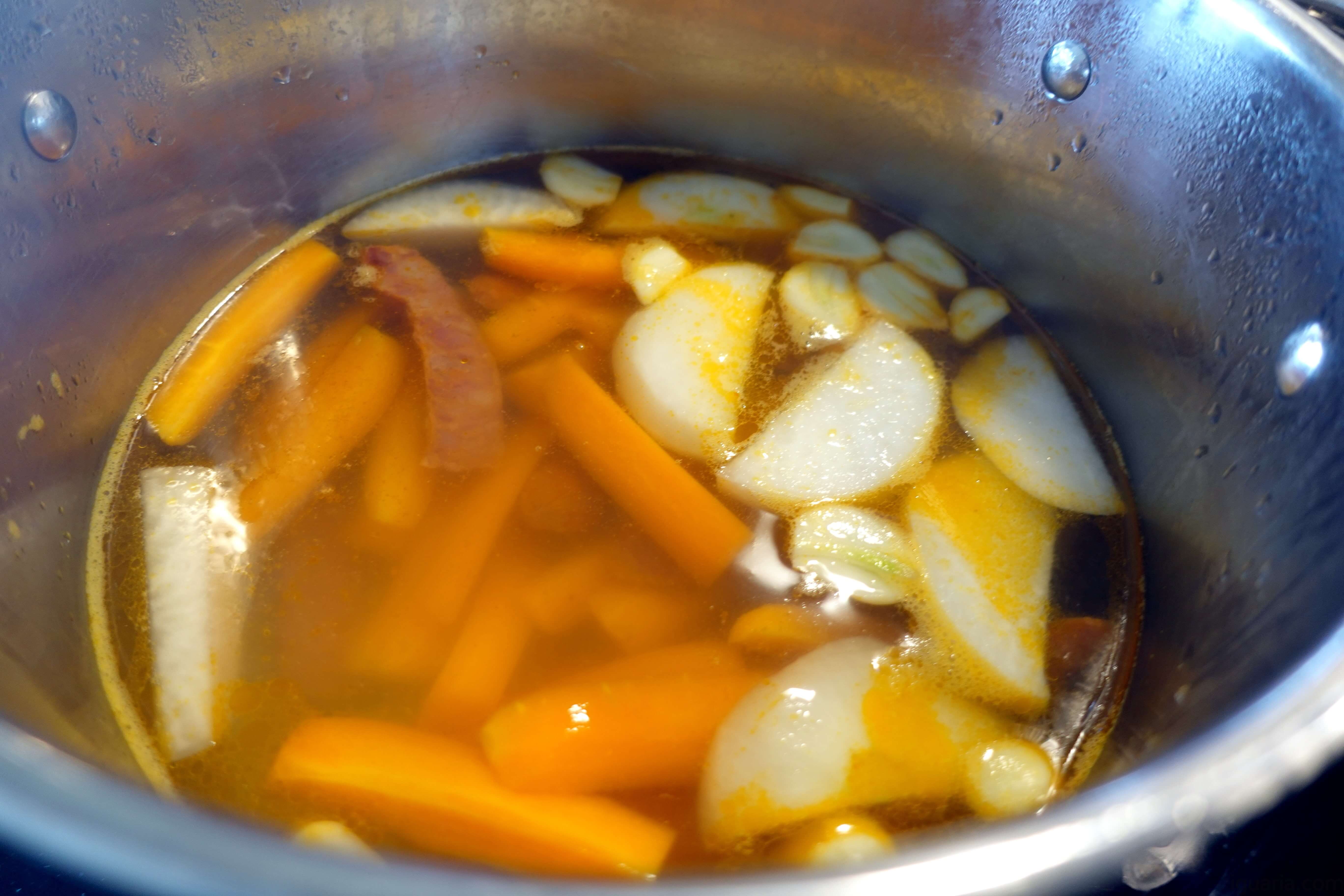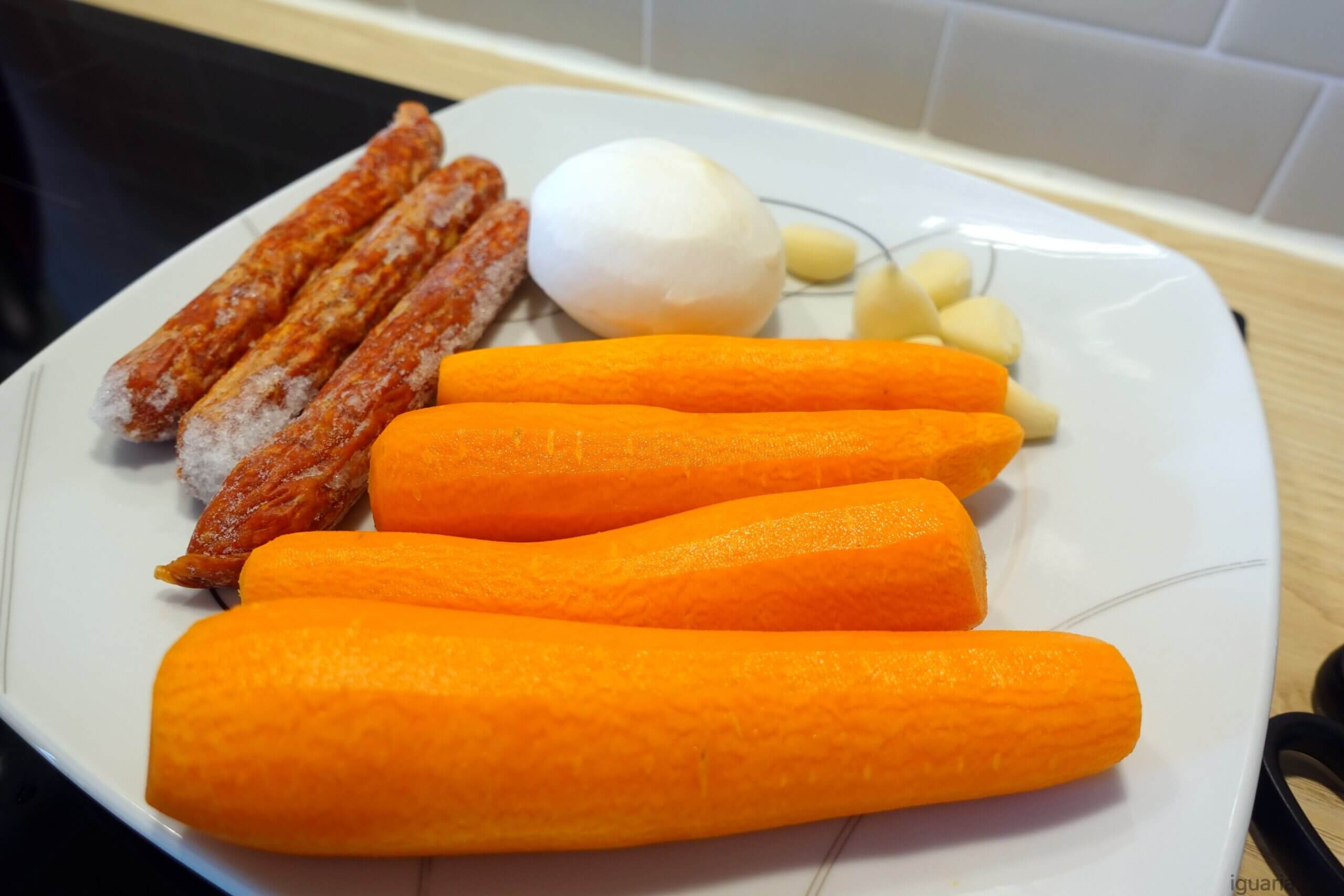 - Retira a panela do lume, mas não deites a água de escaldar as couves fora, adiciona nesta as cenouras descascadas e cortadas grosseiramente (deixa meia cebola picada de parte para juntar ao arroz) eu fui por palitos, mas podes cortar ao gosto, seguido do nabo descascado e também cortado em nacos grandes, cinco dentes de alho descascados e a linguiça sem a sua pele e cortada em tiras também.