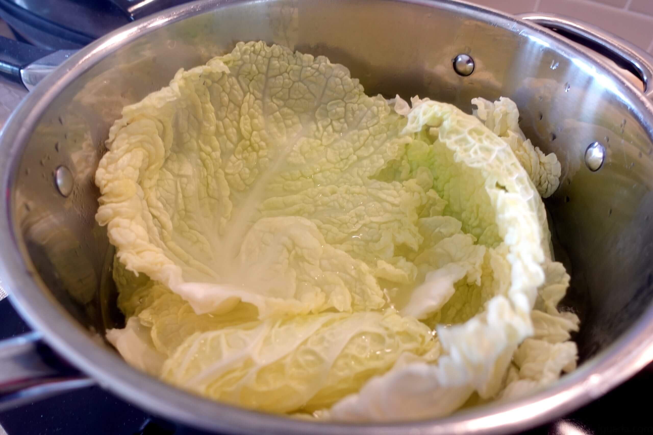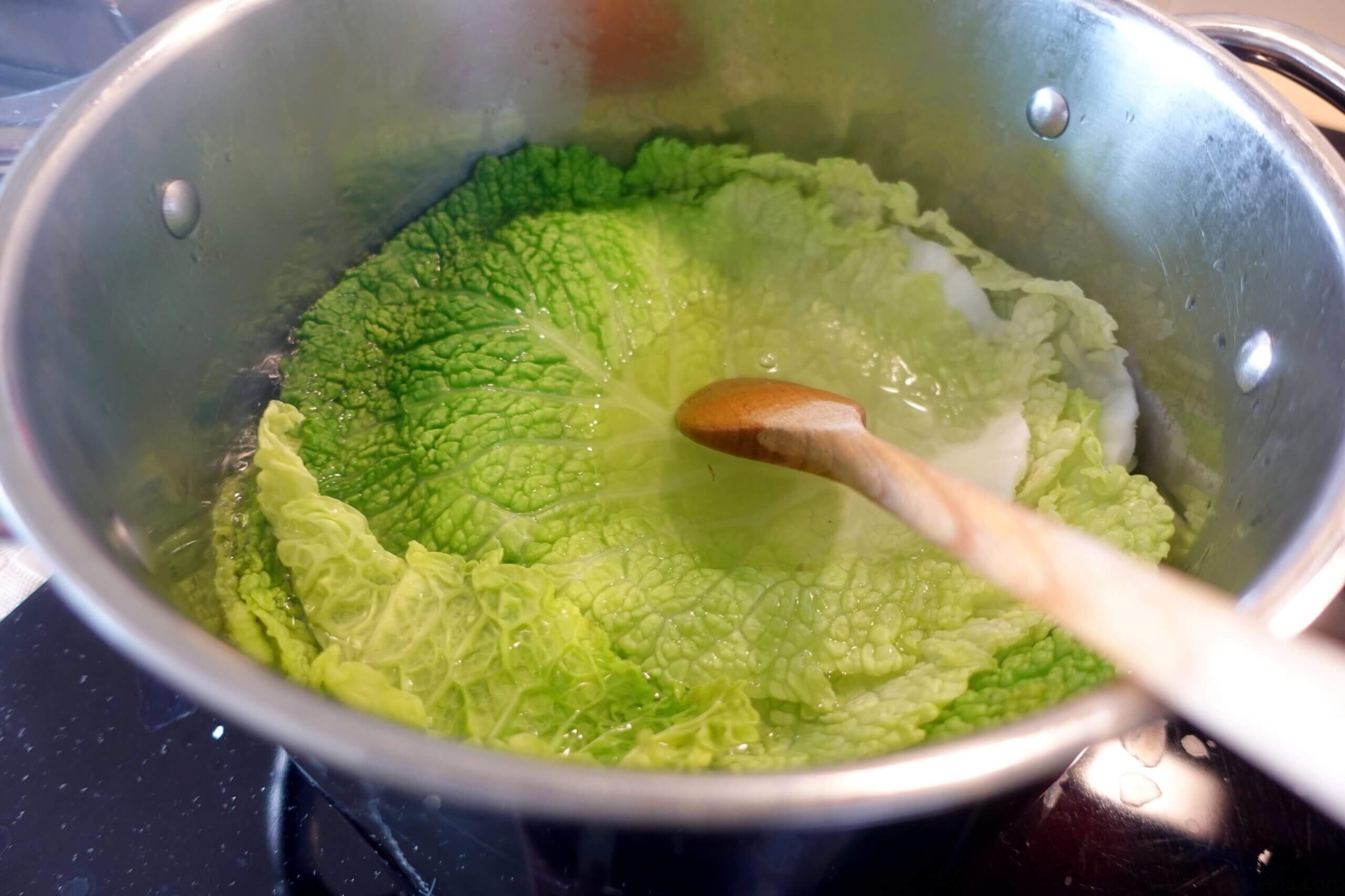 - Quando a água começar a ferver adiciona as folhas de couve, provavelmente não vais conseguir pôr todas, não têm problema, faz umas quantas de cada vez, cozinha estas por uns 5 minutos e depois retira da água e adiciona mais couves até escaldares todas as folhas, deixa estas a escorrer e arrefecer um pouco.
