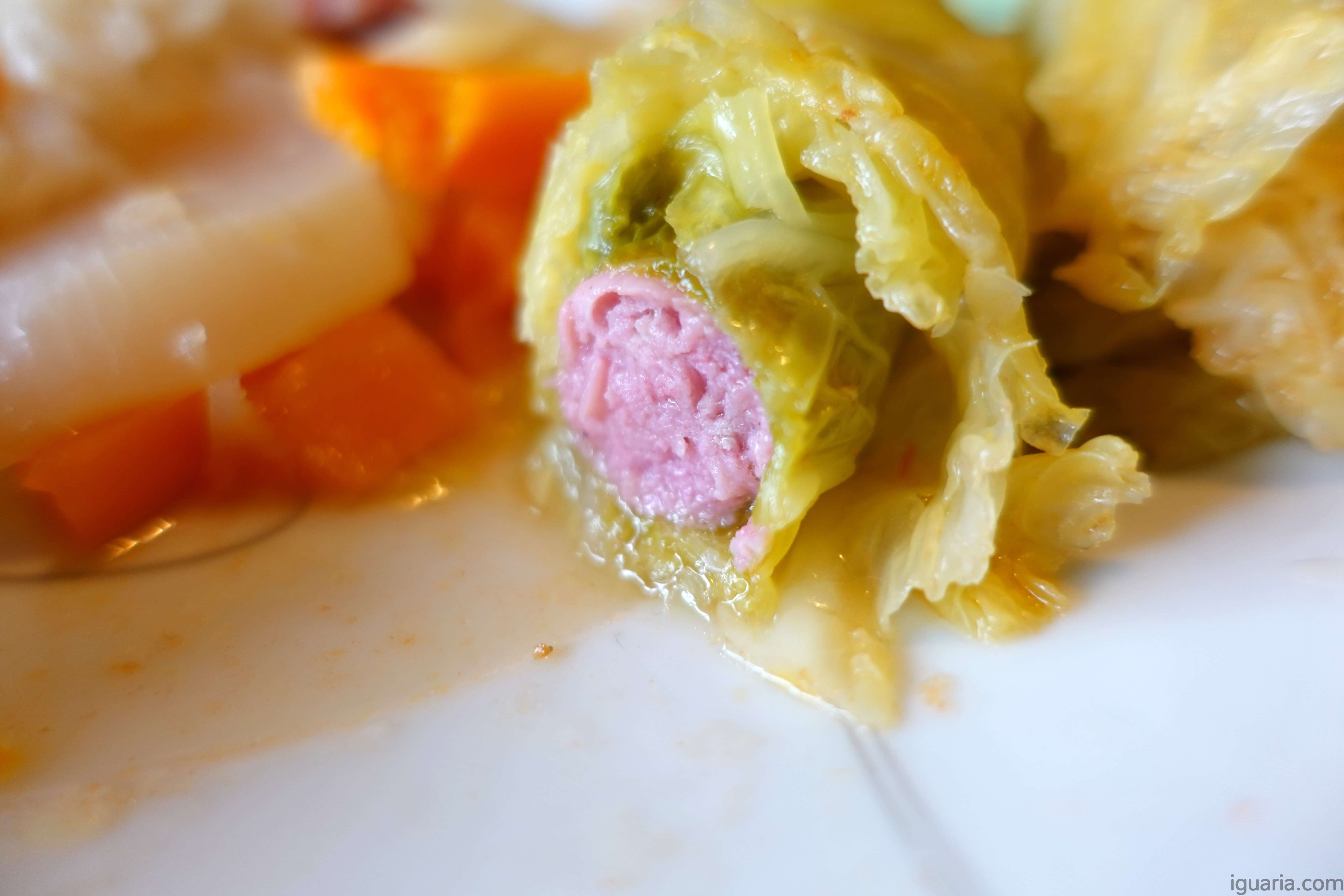 Aqui pelo Iguaria temos várias versões desta receita, é super simples com inspiração do Leste da Europa, basicamente é um cozido de salsichas frescas, couves e mais uns legumes, não têm absolutamente nada de complicado, só a apresentação é que demora um pouco porque o habitual é enrolar as salsichas nas folhas de couve lombarda, isso não só dá um sabor fantástico ás coves mas torna estas uma espécie embrulho com um recheio de salsichas.
