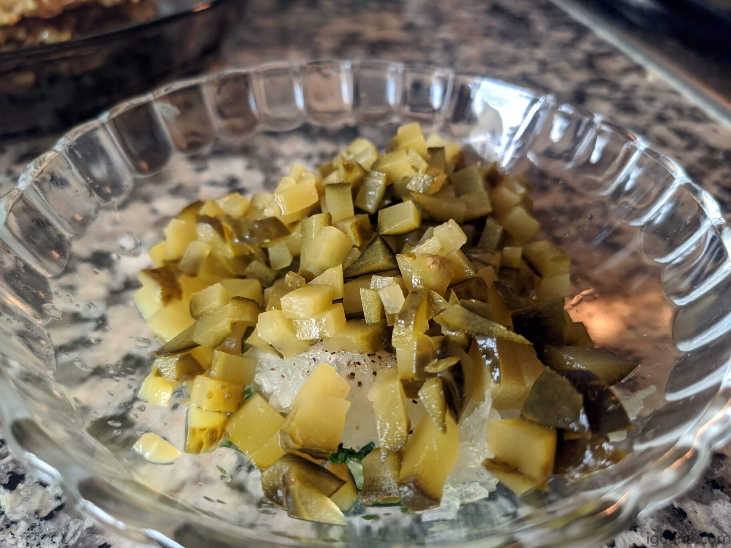 1.Pica a chalota super finamente e os pickles de pepino em cubinhos pequenos, deita tudo numa taça.