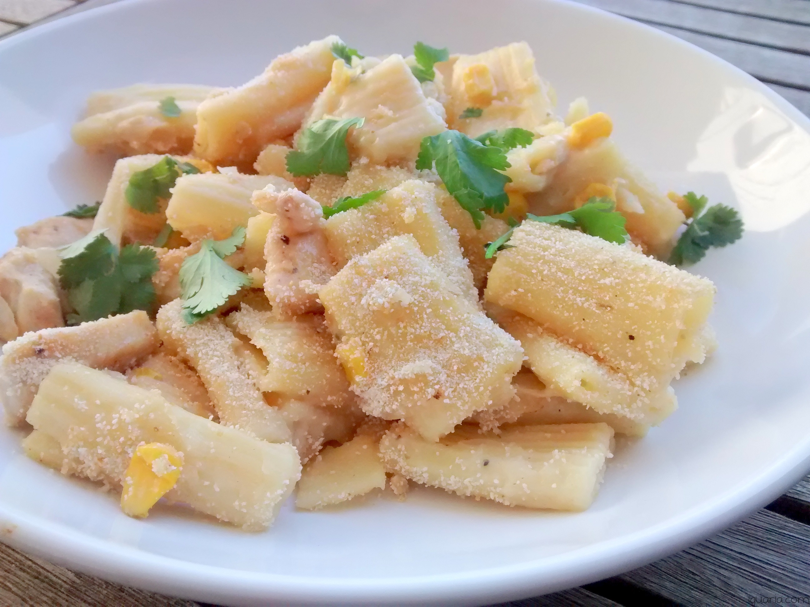 - Por fim vais juntar tudo, escorre a massa e volta a por no tacho, adiciona o frango cortado aos cubos, seguido do milho e ervilhas e por fim o molho bechamel mistura tudo, prova e retifica temperos.